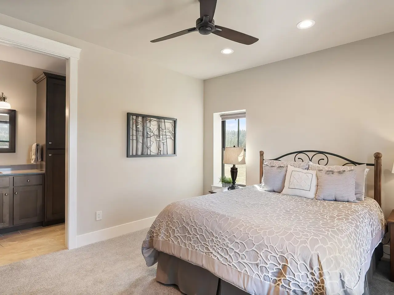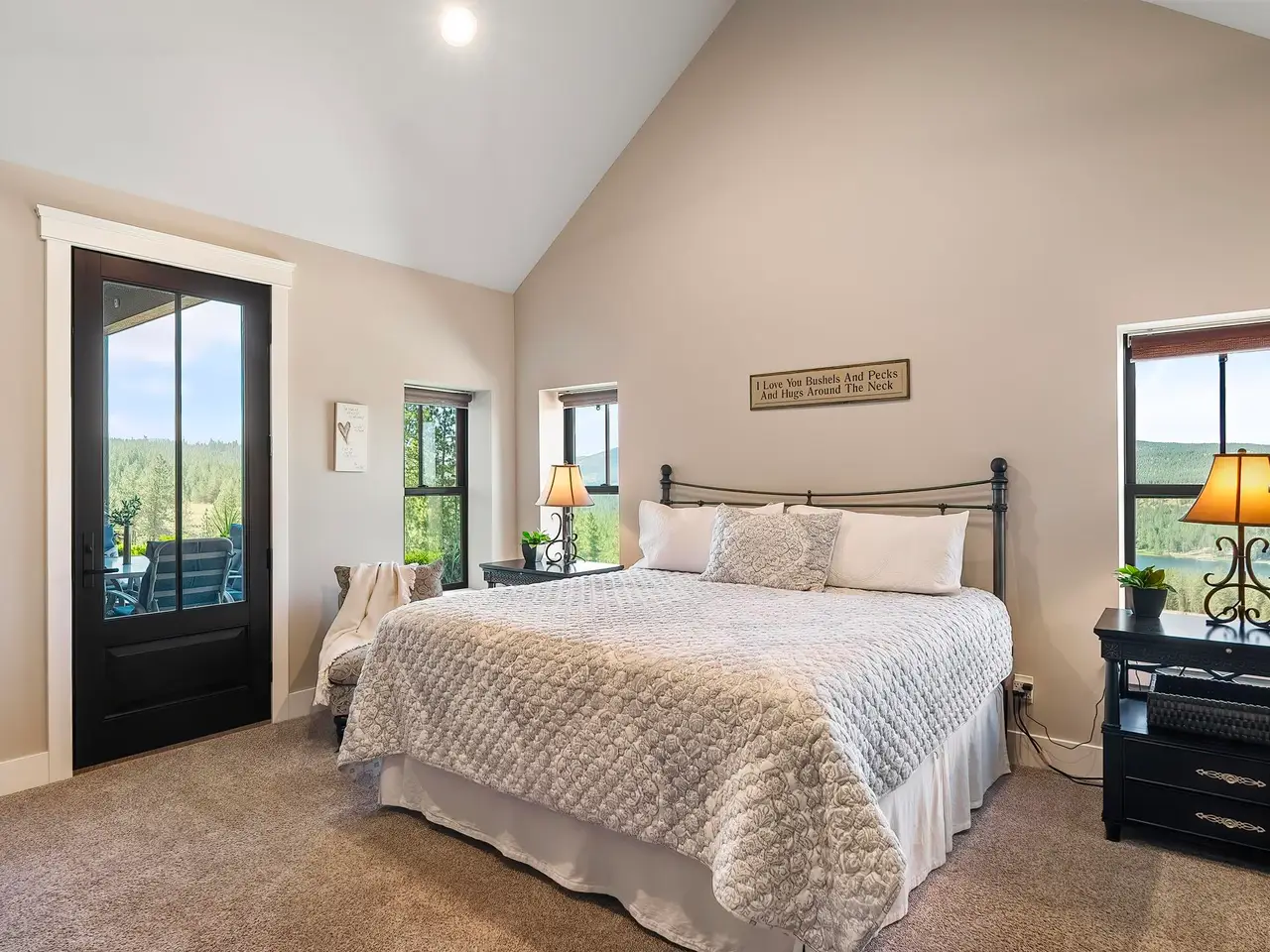 There is so much to love about this stunning property with sweeping views of Lake Spokane & Mt. Spokane. This home features the BEST of everything with 4-bedrooms and 5 bathrooms. Enjoy 1-level living in this thoughtfully designed home with the primary suite and two additional en-suite bedrooms on the main floor, plus a stylish half bath for guests. Upstairs you'll find a spacious 416 sq ft retreat with its own half bath, perfect for a home office, art space, or guest suite. Featuring engineered wood floors, 8-foot knotty alder doors, 10 ft vaulted ceilings, hard surface counters throughout and high-end appliances including a Frigidaire Professional Series refrigerator/freezer, GE Monogram induction cooktop, convection oven/microwave & warming drawer. The chef's kitchen moves outdoors with a 36' built-in DCS barbecue grill, 2-burner gas cooktop & a large covered patio with stamped concrete. An oversized 2-car attached garage is complemented by a massive 40x60 shop w/ a 14-ft center door w/ space for a 35' RV.