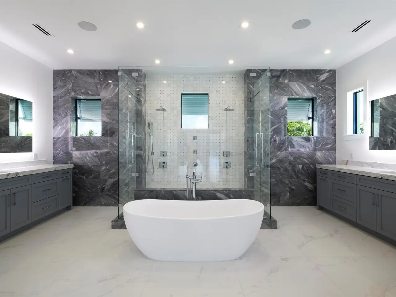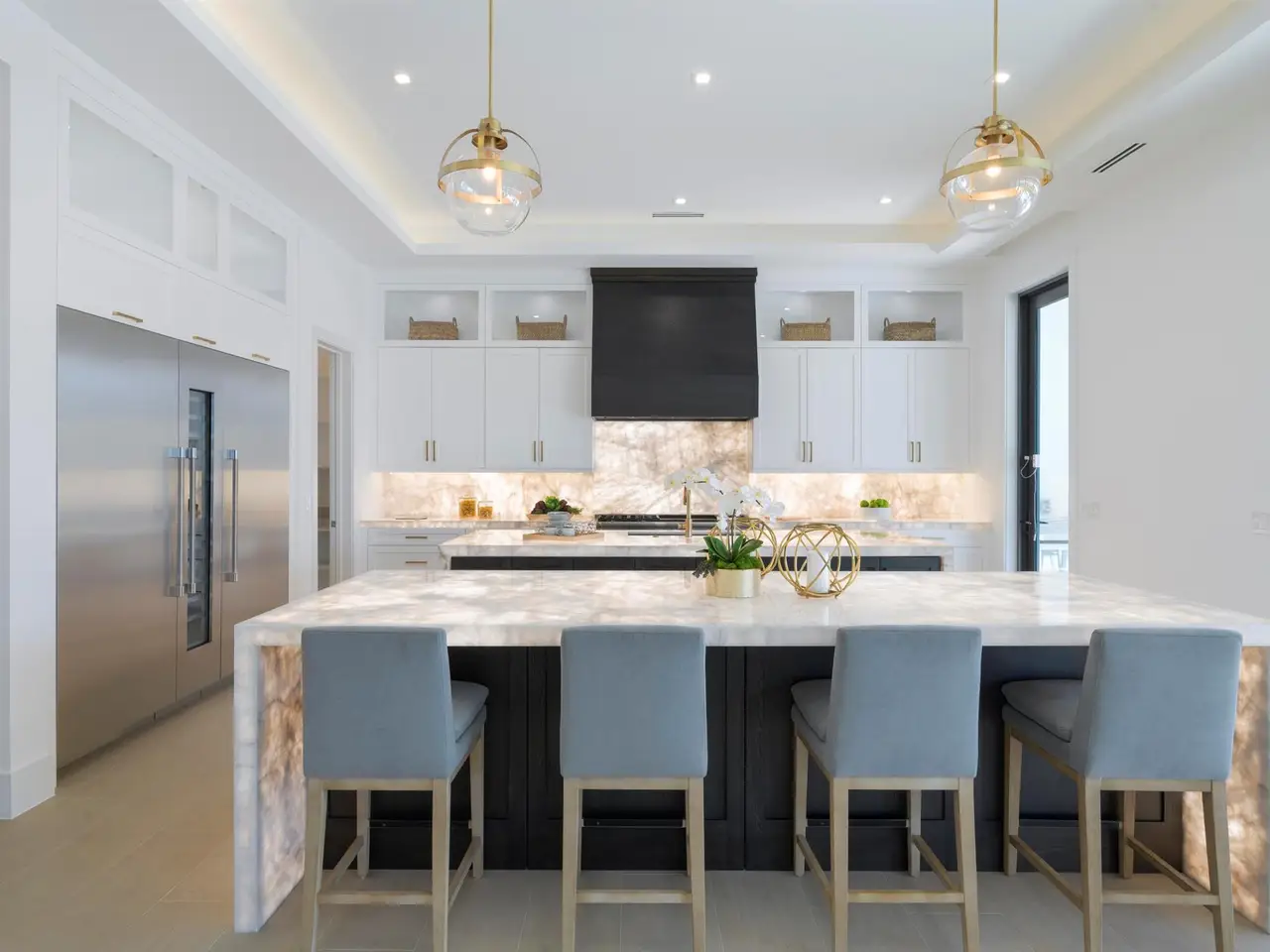 Modern Waterfront Estate in The Village of North Palm Beach. Discover a masterpiece of modern living in this stunning custom Vista Builders new construction home in North Palm Beach. Nestled in a prime waterfront location with direct ocean access, this exquisite 5-bedroom, Theater (Optional 6th bedroom),7-bathroom residence offers the ultimate in luxury and comfort. Indulge in 5,804 square feet of living space, including two gorgeous master suites. The gourmet kitchen, equipped with a Thermador appliance package and dual islands with backlit Cristallo Quartzite countertops, are stunning. The kitchen offers a convenient butler's pantry for effortless entertaining as well as multiple beverage and wine coolers.