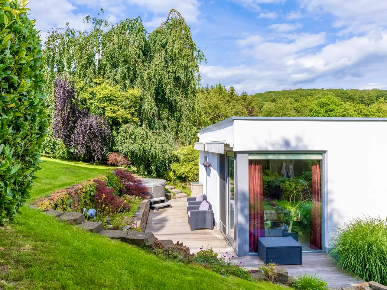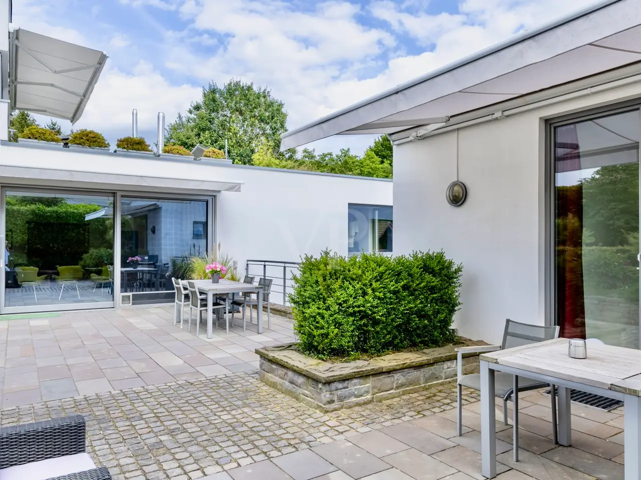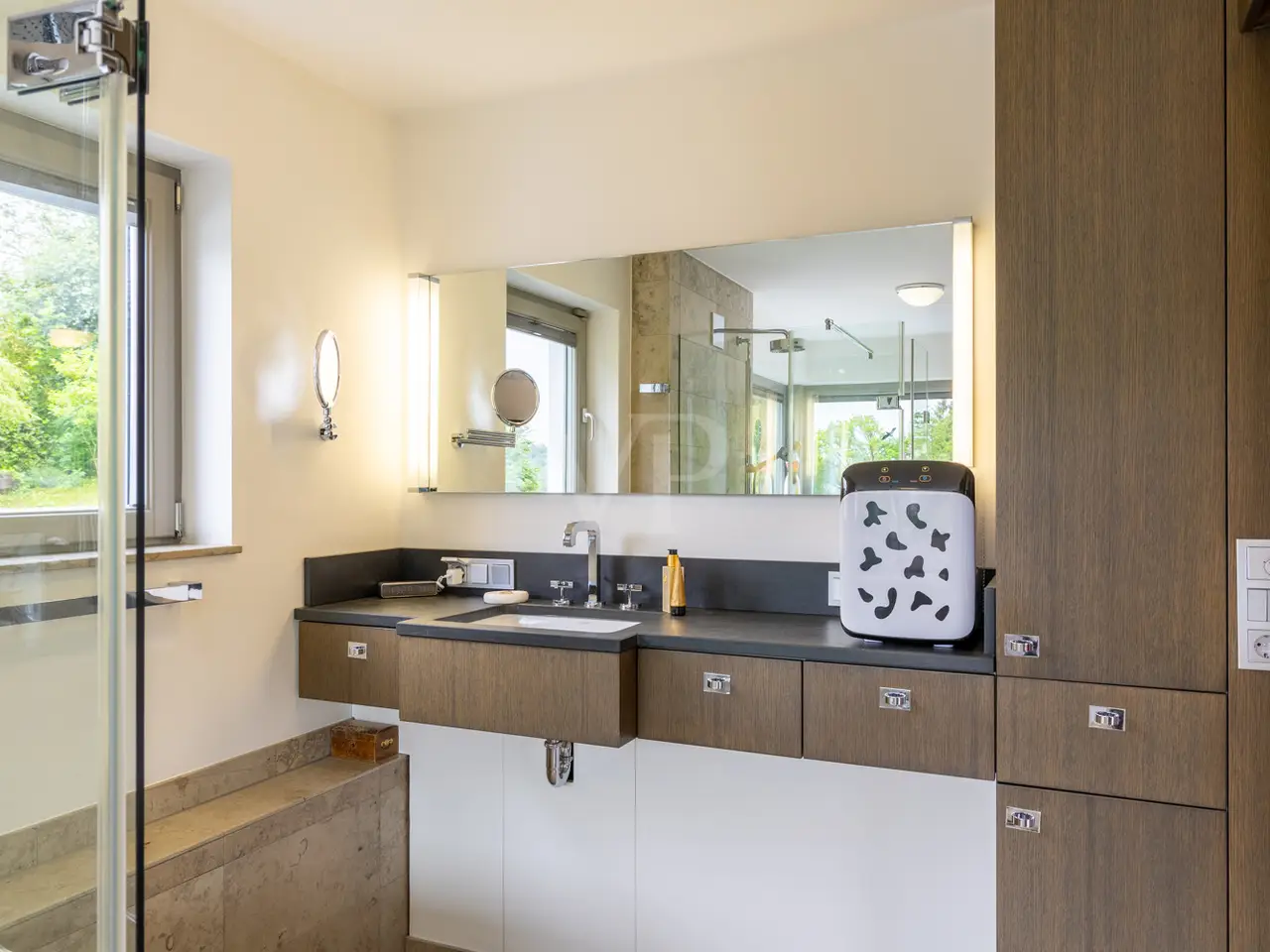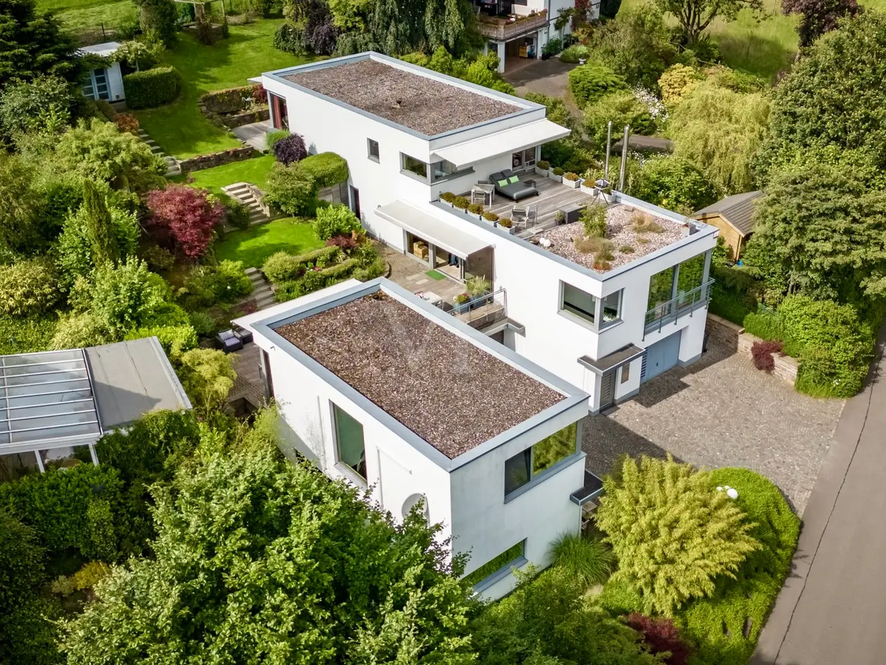 A unique ensemble with two separate houses, built in 2004 in the timeless Bauhaus style and last extensively modernized in 2017, is for sale. The property offers a spacious plot consisting of two plots with a total area of 1,050 m². The location of the plot is characterized by a slight to moderate slope and was laid out like a park. The south-west orientation ensures excellent sunlight. Access to the property is via a quiet cul-de-sac, which guarantees privacy and minimal traffic. The driveway leads over an attractively paved courtyard area made of cobblestones and graywacke, on which there are two parking spaces and a garage. Additional comfort is provided by a switchable patio heater, which ensures snow-free access even on frosty days. A well with a depth of 38 meters is available for watering the garden and is also suitable for the use of geothermal energy. The main house itself extends over three levels and offers a well thought-out room layout. The modern and spacious ground floor, with a large checkroom and built-in cupboards, wine cellar, boiler room and guest WC, leads to the heart of the property. From here you also have direct access to the garage. On the first floor there is an open-plan living and dining area with a free-standing kitchen block and fireplace and direct access to a spacious terrace. The south-west facing terrace allows you to enjoy many hours of sunshine outdoors. The kitchen is equipped with high-quality modern appliances and offers enough space for a cozy dining area. On the first floor there is also a practical utility room and a bathroom. An additional room, which would be ideal for using the sauna, is also located on this level. The 2nd floor comprises 2 spacious bedrooms with en-suite barrier-free bathrooms and a terrace each, as well as a spacious dressing room with functional built-in wardrobes and a laundry chute to the utility room/kitchen. House 2 has the same luxurious fittings as house 1, but is also fully air-conditioned and equipped with radiator heating. It offers a multifunctional use as an office on both floors with reception and meeting room on the ground floor, or e.g. partial use for residential purposes on the upper floor. The terrace on the upper level by the guest room unit enables short distances to House 1. The property was extensively modernized in 2017, with attention paid to high-quality materials and contemporary furnishings. The well thought-out architecture and high-quality construction offer comfortable living at the highest level, leaving nothing to be desired.