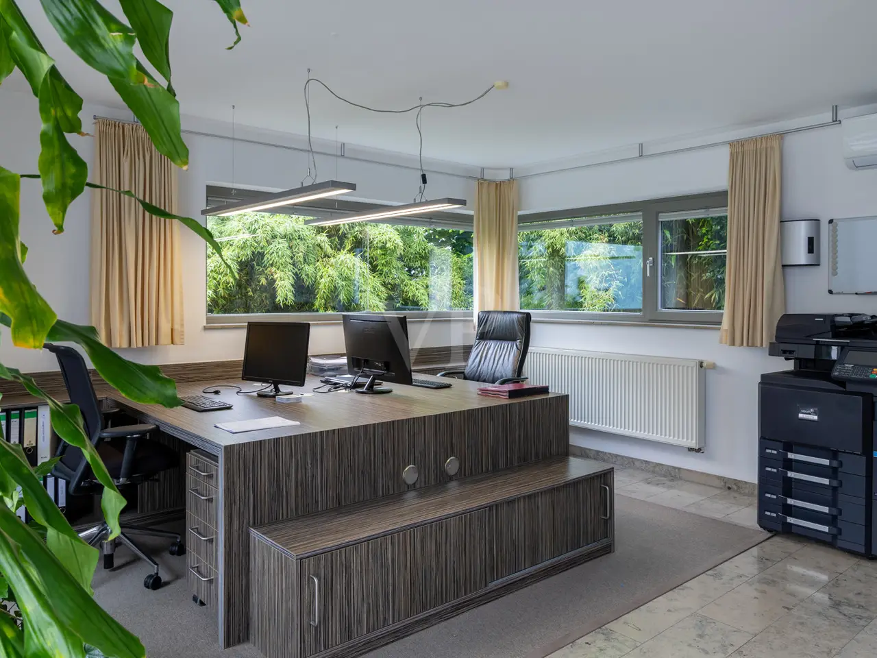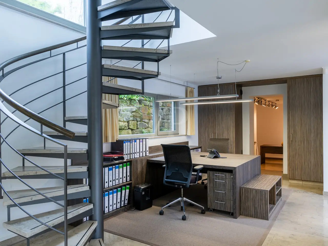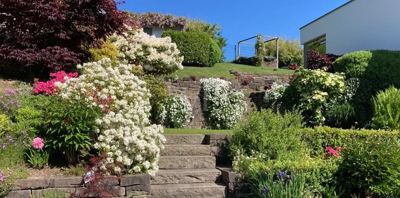 A unique ensemble with two separate houses, built in 2004 in the timeless Bauhaus style and last extensively modernized in 2017, is for sale. The property offers a spacious plot consisting of two plots with a total area of 1,050 m². The location of the plot is characterized by a slight to moderate slope and was laid out like a park. The south-west orientation ensures excellent sunlight. Access to the property is via a quiet cul-de-sac, which guarantees privacy and minimal traffic. The driveway leads over an attractively paved courtyard area made of cobblestones and graywacke, on which there are two parking spaces and a garage. Additional comfort is provided by a switchable patio heater, which ensures snow-free access even on frosty days. A well with a depth of 38 meters is available for watering the garden and is also suitable for the use of geothermal energy. The main house itself extends over three levels and offers a well thought-out room layout. The modern and spacious ground floor, with a large checkroom and built-in cupboards, wine cellar, boiler room and guest WC, leads to the heart of the property. From here you also have direct access to the garage. On the first floor there is an open-plan living and dining area with a free-standing kitchen block and fireplace and direct access to a spacious terrace. The south-west facing terrace allows you to enjoy many hours of sunshine outdoors. The kitchen is equipped with high-quality modern appliances and offers enough space for a cozy dining area. On the first floor there is also a practical utility room and a bathroom. An additional room, which would be ideal for using the sauna, is also located on this level. The 2nd floor comprises 2 spacious bedrooms with en-suite barrier-free bathrooms and a terrace each, as well as a spacious dressing room with functional built-in wardrobes and a laundry chute to the utility room/kitchen. House 2 has the same luxurious fittings as house 1, but is also fully air-conditioned and equipped with radiator heating. It offers a multifunctional use as an office on both floors with reception and meeting room on the ground floor, or e.g. partial use for residential purposes on the upper floor. The terrace on the upper level by the guest room unit enables short distances to House 1. The property was extensively modernized in 2017, with attention paid to high-quality materials and contemporary furnishings. The well thought-out architecture and high-quality construction offer comfortable living at the highest level, leaving nothing to be desired.