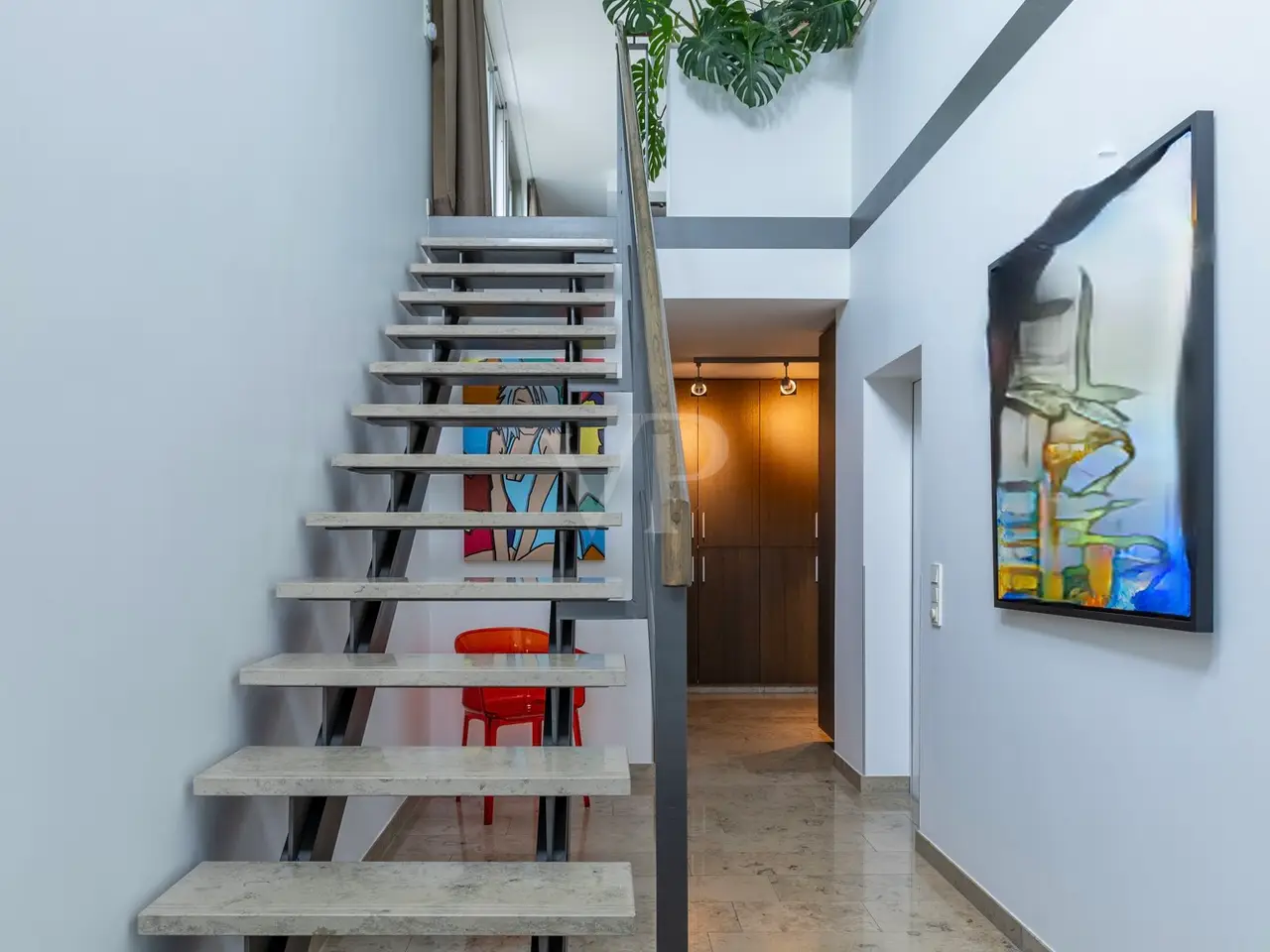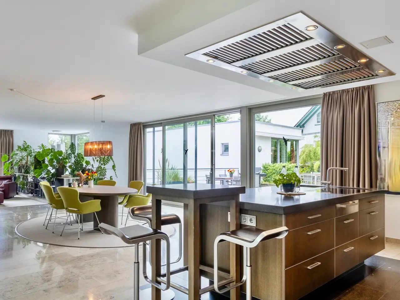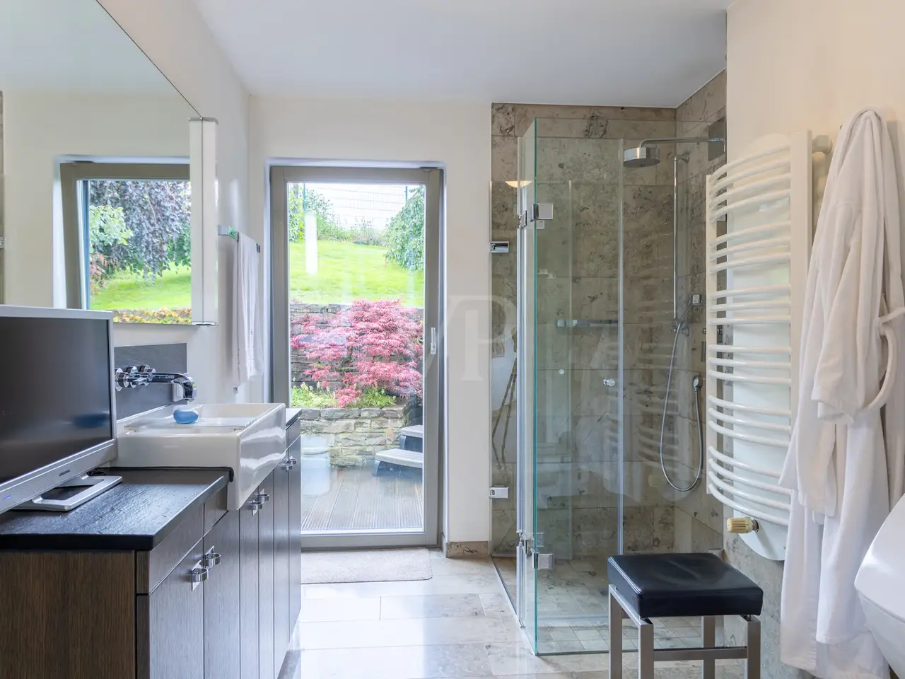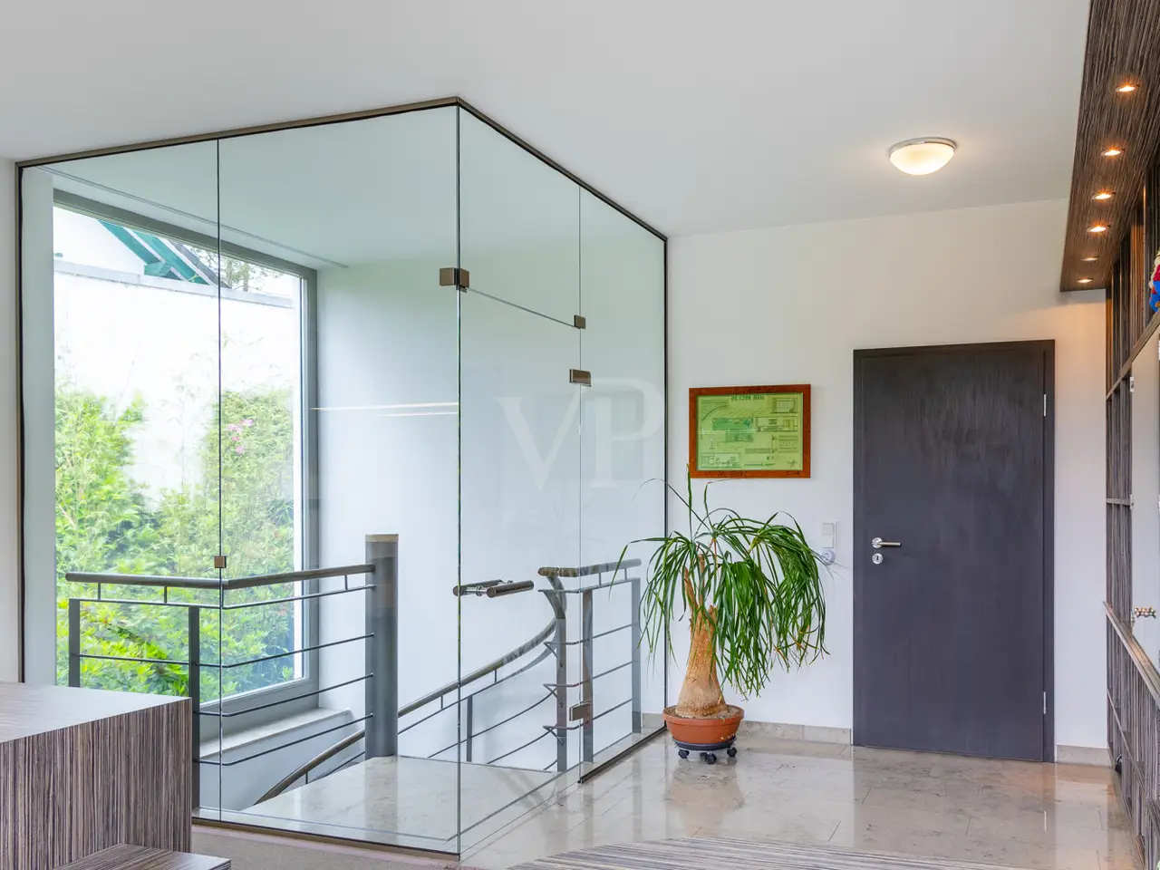 A unique ensemble with two separate houses, built in 2004 in the timeless Bauhaus style and last extensively modernized in 2017, is for sale. The property offers a spacious plot consisting of two plots with a total area of 1,050 m². The location of the plot is characterized by a slight to moderate slope and was laid out like a park. The south-west orientation ensures excellent sunlight. Access to the property is via a quiet cul-de-sac, which guarantees privacy and minimal traffic. The driveway leads over an attractively paved courtyard area made of cobblestones and graywacke, on which there are two parking spaces and a garage. Additional comfort is provided by a switchable patio heater, which ensures snow-free access even on frosty days. A well with a depth of 38 meters is available for watering the garden and is also suitable for the use of geothermal energy. The main house itself extends over three levels and offers a well thought-out room layout. The modern and spacious ground floor, with a large checkroom and built-in cupboards, wine cellar, boiler room and guest WC, leads to the heart of the property. From here you also have direct access to the garage. On the first floor there is an open-plan living and dining area with a free-standing kitchen block and fireplace and direct access to a spacious terrace. The south-west facing terrace allows you to enjoy many hours of sunshine outdoors. The kitchen is equipped with high-quality modern appliances and offers enough space for a cozy dining area. On the first floor there is also a practical utility room and a bathroom. An additional room, which would be ideal for using the sauna, is also located on this level. The 2nd floor comprises 2 spacious bedrooms with en-suite barrier-free bathrooms and a terrace each, as well as a spacious dressing room with functional built-in wardrobes and a laundry chute to the utility room/kitchen. House 2 has the same luxurious fittings as house 1, but is also fully air-conditioned and equipped with radiator heating. It offers a multifunctional use as an office on both floors with reception and meeting room on the ground floor, or e.g. partial use for residential purposes on the upper floor. The terrace on the upper level by the guest room unit enables short distances to House 1. The property was extensively modernized in 2017, with attention paid to high-quality materials and contemporary furnishings. The well thought-out architecture and high-quality construction offer comfortable living at the highest level, leaving nothing to be desired.