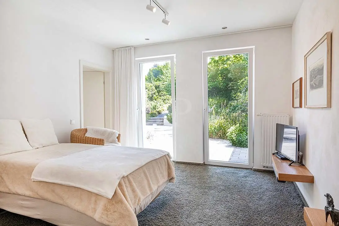 This exceptionally attractive detached house offers a generous living space of approx. 242 m², combined with an attractively landscaped terrace and garden area on a spacious plot of approx. 1,144 m². Originally completed in 1958, the property has been thoughtfully extended and renovated over the years (most recently in 2007/2008) in order to meet current demands for high living comfort and to optimize energy consumption. The existing photovoltaic system not only helps to reduce energy costs, but is also a step towards sustainable living. A roof area of approx. 59 m² was covered and it achieves a PV output of 8.28 kWp. The property also has a traditional fireplace with a connection to the heating circuit. There is also preparation for an additional solar system for further optimization. The layout of the house is very functional and ideal for families or couples looking for plenty of space. The interior of the house impresses with a combination of natural stone, parquet and carpeting. You can also expect a custom-made kitchen with Küppersbusch and Miele appliances. Security is provided by a high-quality alarm system with indoor and outdoor surveillance as well as burglar-resistant windows and doors with glass breakage and motion detectors. In the classic rooms of the property, there are connections for telephone, television and IT, which significantly increases flexibility in the use of the rooms and creates ideal conditions for working from home in particular. This property combines traditional charm with modern amenities and is waiting to become your new home.