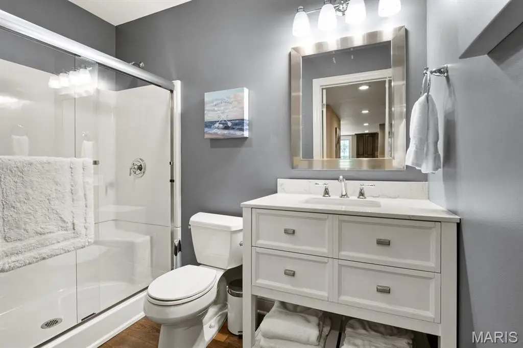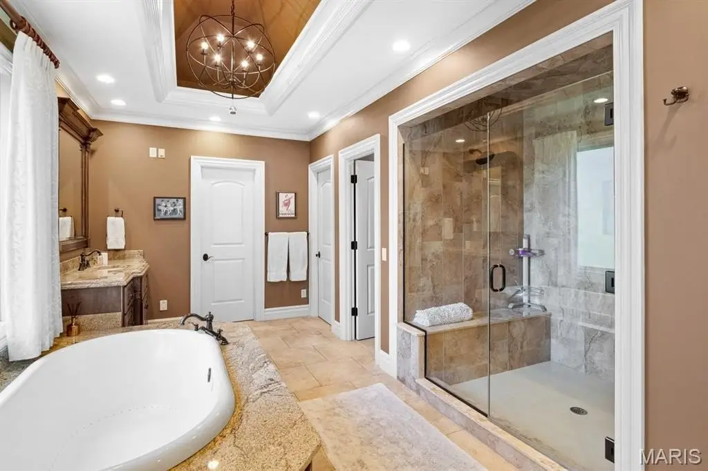 Price Improved. This spectacular custom built 13 year old home is situated on a lushly landscaped .5 acre lot on a private lane close to Old Bonhomme Elementary and Stacy Park. This home has all the right spaces to live & entertain effortlessly. The home is filled with custom touches like in-ceiling speakers, crown molding, wainscoting & high end flooring throughout.The gourmet eat-in kitchen has top of the line appliances & a huge center island that includes seating, a sink & plenty of storage. Off the kitchen, you will find a mudroom with built-in cubbies, door to the oversized 3 car garage & separate laundry room. The main floor master suite is grand & includes a gorgeous granite-clad bathroom with his & her vanities, air jetted whirlpool tub, two custom closets & a large walk-in shower w/ dual shower heads. Upstairs you will find a big bonus room complete w/ gas fireplace, built-in bookcases & speakers. There are 3 additional bedrooms, one of which is en-suite while the other two share a jack-n-jill bathroom. Plus there is an upstairs laundry closet that fits a full-size stackable washer/dryer. The finished lower level includes a walk behind bar, HUGE flex space for entertaining, a possible 5th bedroom, a full bathroom and great storage. The lot is private and features a large patio with built in firepit, sprinkler system and outdoor speakers. A home for all ages and stages.