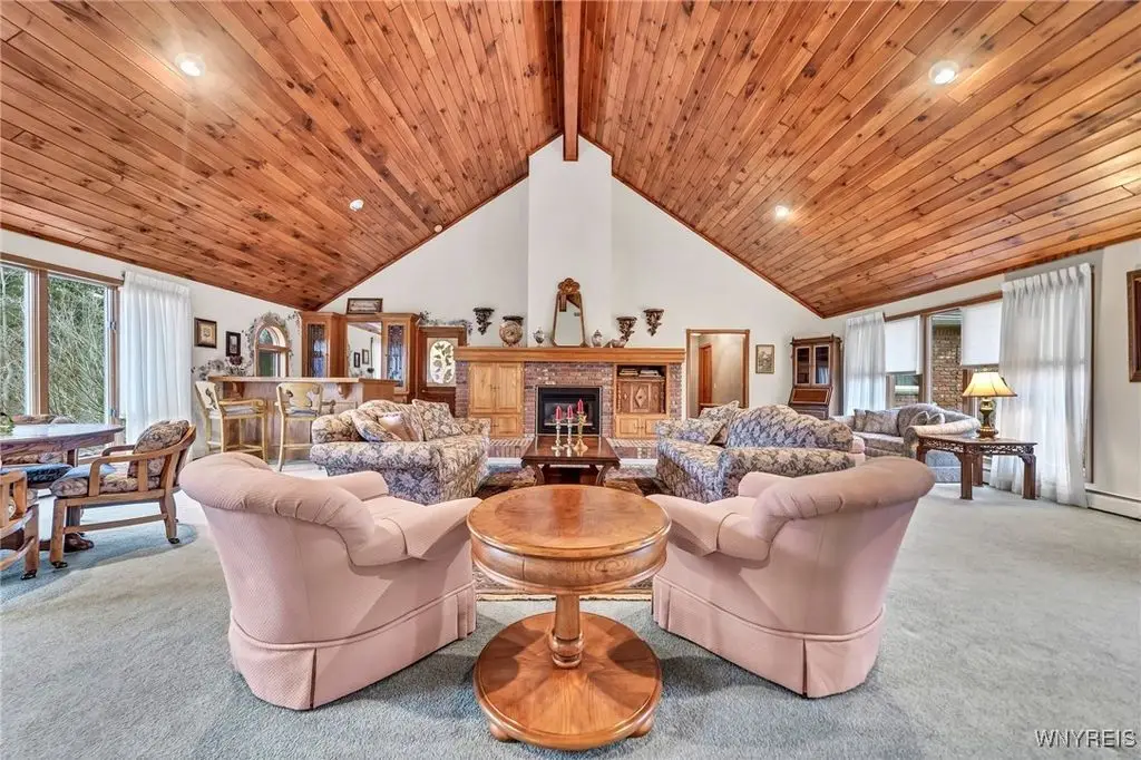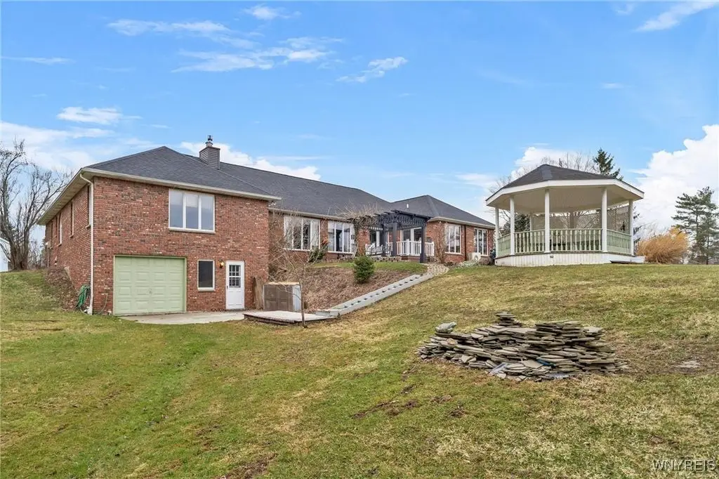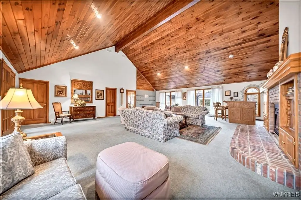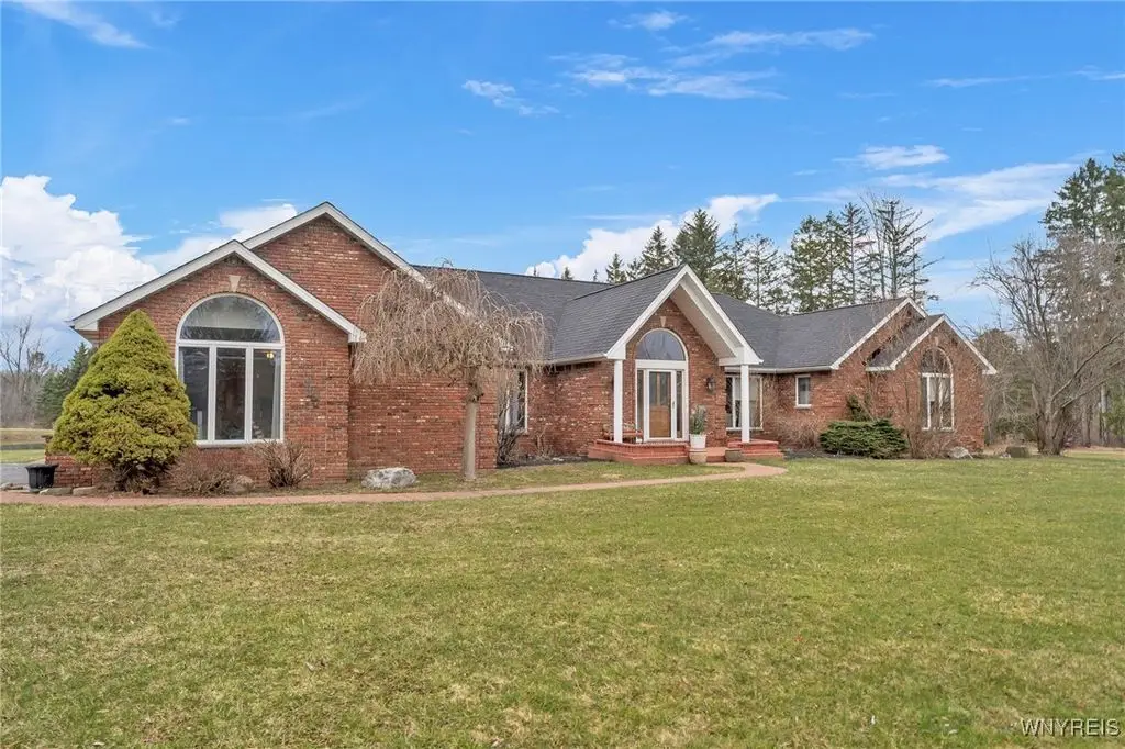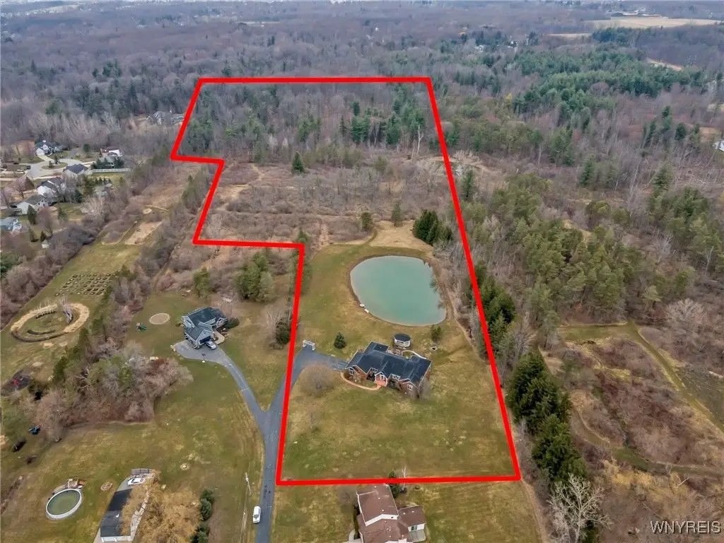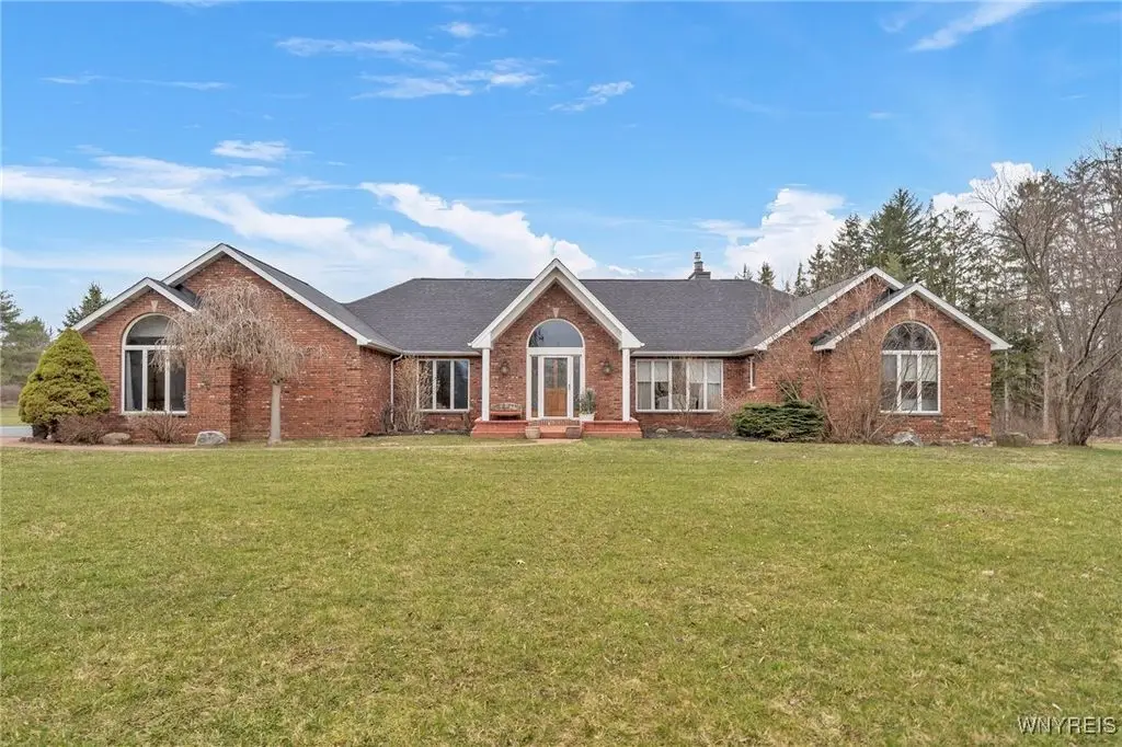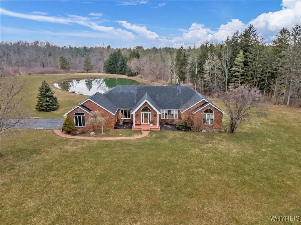 Exquisite all-brick, sprawling ranch nestled on 17 serene, partially wooded acres, complete with a tranquil pond, 3-car garage, in coveted Orchard Park. Enjoy the pond with dock, fountains, gazebo, pergola & wander the wooded trails, surrounded by nature's beauty. Stunning cathedral-ceiling foyer beckons you through double French doors into a majestic Great Room, where soaring wood-lined ceilings & a monumental gas fireplace w/built-ins & a raised hearth set the stage for elegant living. Oak bar, with leaded glass cabinetry, creates the perfect ambiance for hosting unforgettable gatherings. The chef-inspired eat-in kitchen, featuring wood-lined cathedral ceilings, hardwood floors, Cambria quartz island counter & leaded glass doors. This flows into Family Room w/an electric fireplace & Formal Dining area, both of which open through French doors onto a roomy deck. The outdoor space is an entertainer's dream, a pergola, swing, gazebo, fountain, sweeping views of the pond & lush yard. The private primary suite boasts a tray ceiling, walk-in closet, glamour bath bathed in natural light from an abundance of windows with a hint of romance. Guest suite offers cathedral ceilings, its own walk-in closet & private ensuite bath. A convenient 1st-floor laundry room includes modern appliances. The library/den provides a versatile space that could serve as a 3rd bedroom. The lower level is an entertainer's paradise or ideal in-law suite, featuring a vast finished area with a bedroom, spacious walk-in closet, full kitchen w/stove & refrigerator space, a dining area, & a living room with a gas-burning stove. Ceramic-tiled exit from lower-level leads to yard & 3rd garage. Recently updated with a brand-new on-demand HWT '24 & full tear-off roof '24, offering comfort & luxury with its central vacuum system & mini split A/C system. The attached 2.5-car garage is outfitted w/cabinets, sink & is designed for indoor entertainment. A truly a once-in-a-lifetime special opportunity! Offers reviewed as they come in & seller reserves the right to set a deadline for offers. Sq ft was measured by architect - 1st flr = 3162 sq ft. Finished lower-level areas = 1785. Total sq ft is 4947.