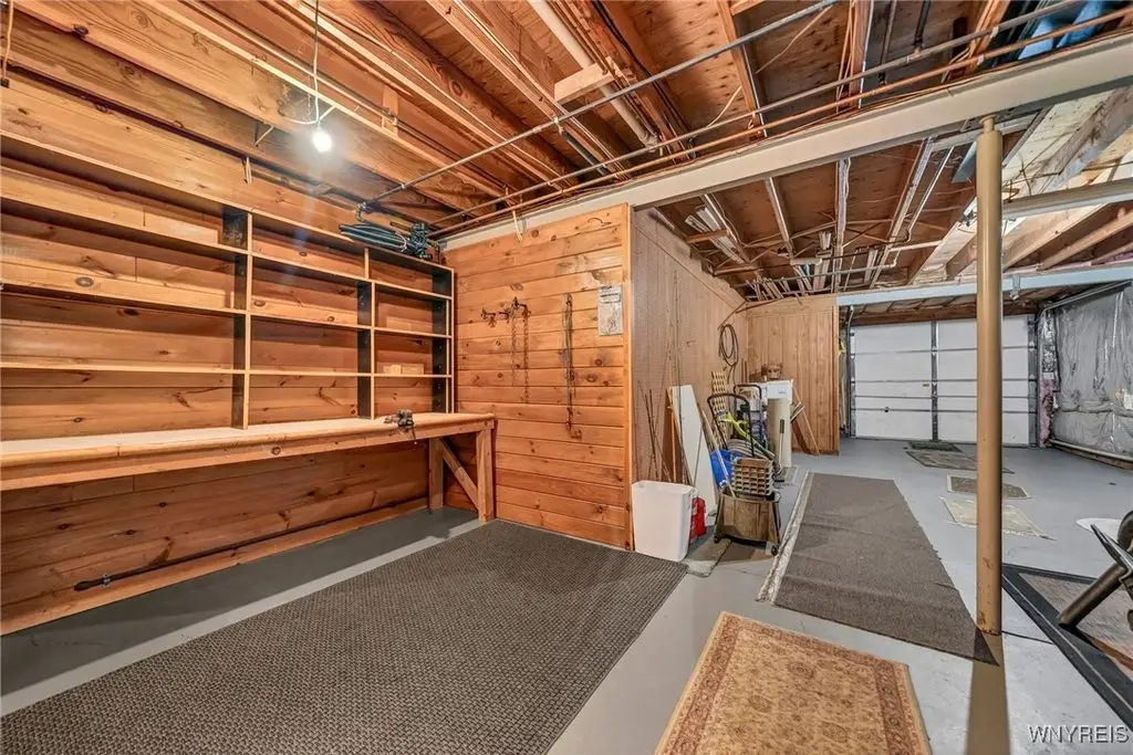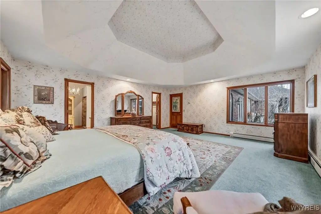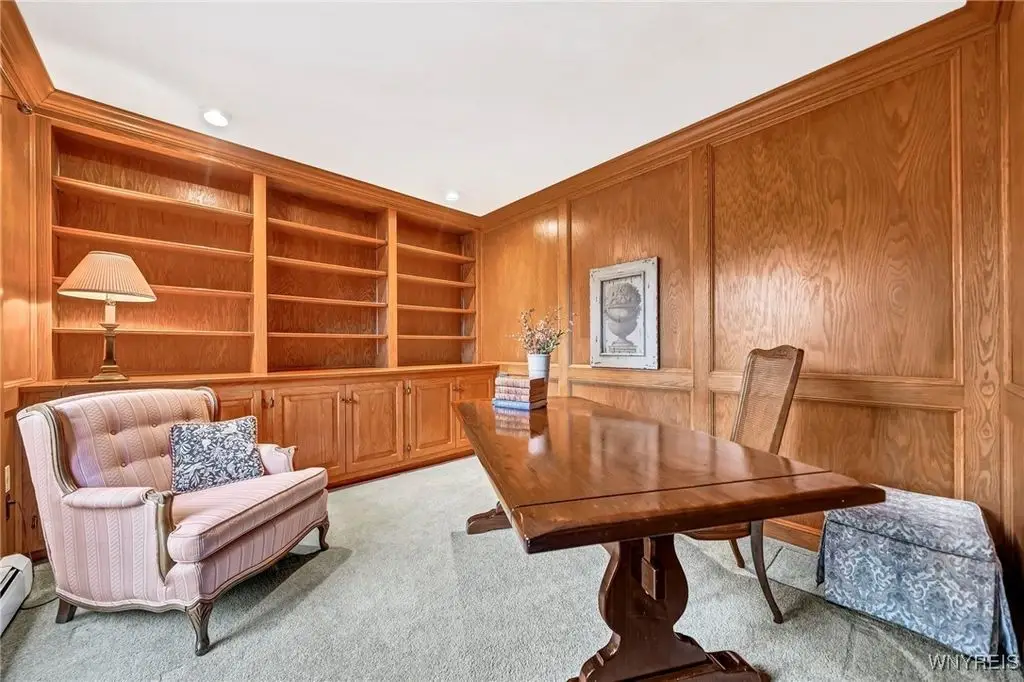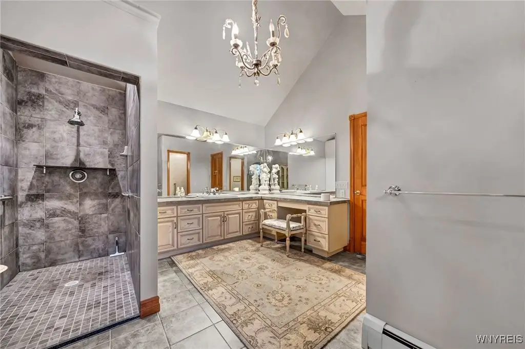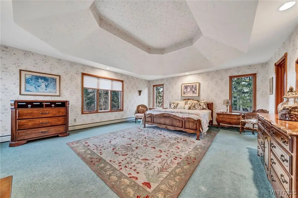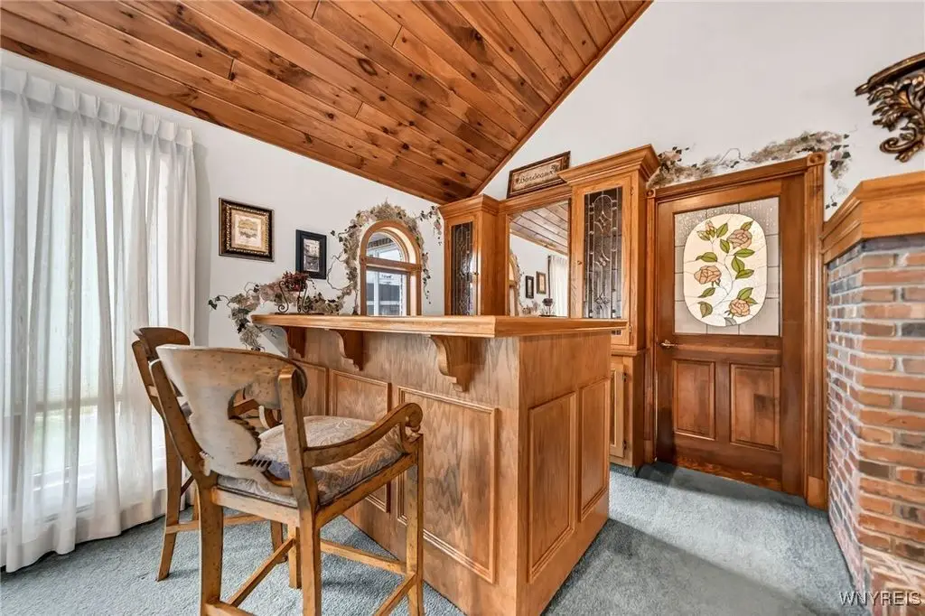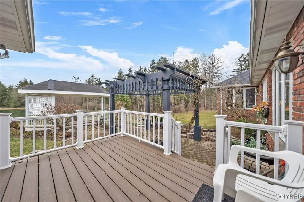 Exquisite all-brick, sprawling ranch nestled on 17 serene, partially wooded acres, complete with a tranquil pond, 3-car garage, in coveted Orchard Park. Enjoy the pond with dock, fountains, gazebo, pergola & wander the wooded trails, surrounded by nature's beauty. Stunning cathedral-ceiling foyer beckons you through double French doors into a majestic Great Room, where soaring wood-lined ceilings & a monumental gas fireplace w/built-ins & a raised hearth set the stage for elegant living. Oak bar, with leaded glass cabinetry, creates the perfect ambiance for hosting unforgettable gatherings. The chef-inspired eat-in kitchen, featuring wood-lined cathedral ceilings, hardwood floors, Cambria quartz island counter & leaded glass doors. This flows into Family Room w/an electric fireplace & Formal Dining area, both of which open through French doors onto a roomy deck. The outdoor space is an entertainer's dream, a pergola, swing, gazebo, fountain, sweeping views of the pond & lush yard. The private primary suite boasts a tray ceiling, walk-in closet, glamour bath bathed in natural light from an abundance of windows with a hint of romance. Guest suite offers cathedral ceilings, its own walk-in closet & private ensuite bath. A convenient 1st-floor laundry room includes modern appliances. The library/den provides a versatile space that could serve as a 3rd bedroom. The lower level is an entertainer's paradise or ideal in-law suite, featuring a vast finished area with a bedroom, spacious walk-in closet, full kitchen w/stove & refrigerator space, a dining area, & a living room with a gas-burning stove. Ceramic-tiled exit from lower-level leads to yard & 3rd garage. Recently updated with a brand-new on-demand HWT '24 & full tear-off roof '24, offering comfort & luxury with its central vacuum system & mini split A/C system. The attached 2.5-car garage is outfitted w/cabinets, sink & is designed for indoor entertainment. A truly a once-in-a-lifetime special opportunity! Offers reviewed as they come in & seller reserves the right to set a deadline for offers. Sq ft was measured by architect - 1st flr = 3162 sq ft. Finished lower-level areas = 1785. Total sq ft is 4947.