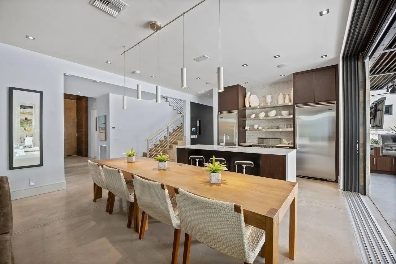 This contemporary four-bedroom, three-and-a-half-bath home with a detached 384 SF cabana in desirable Beverly Shores/Rose Isle showcases designer-inspired finishes and a resort-style pool retreat. Custom-built with a modern aesthetic and open floor plan, it features a gourmet kitchen with an island, breakfast bar, stainless steel appliances including a Viking refrigerator and separate freezer, espresso cabinetry, and Caesarstone countertops. The open dining area flows seamlessly into the spacious great room, highlighted by polished concrete floors, a custom-built media center, a wine room, bedroom with en-suite bath, and aan office with wrap around desk. Twelve-foot retractable sliding glass doors fill the main living area with natural light and open to spectacular views of the heated saltwater pool and spa. Upstairs, the primary suite offers a serene retreat with a custom-designed walk-in closet, Caesarstone dual vanities, soaking tub, separate shower, and a private balcony overlooking the pool and Mead Gardens. Two additional bedrooms share a Jack-and-Jill bath, while another flexible space serves perfectly as a media room, gym, or nursery. A secondary washer and dryer upstairs add convenience. The outdoor living area is an entertainer’s dream, complete with a summer kitchen, bar area, gas grill, and retractable awning. Guests will love the detached guest house with its private entrance and pool views. The garage provides flexibility, accommodating either two or four cars. Ideally located near both Orlando and Winter Park, and just steps from scenic Mead Gardens, this home offers luxury living at its finest—a perfect blend of modern design, functionality, and resort-style comfort.