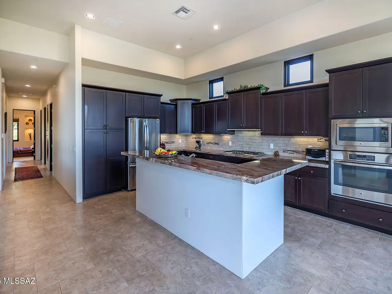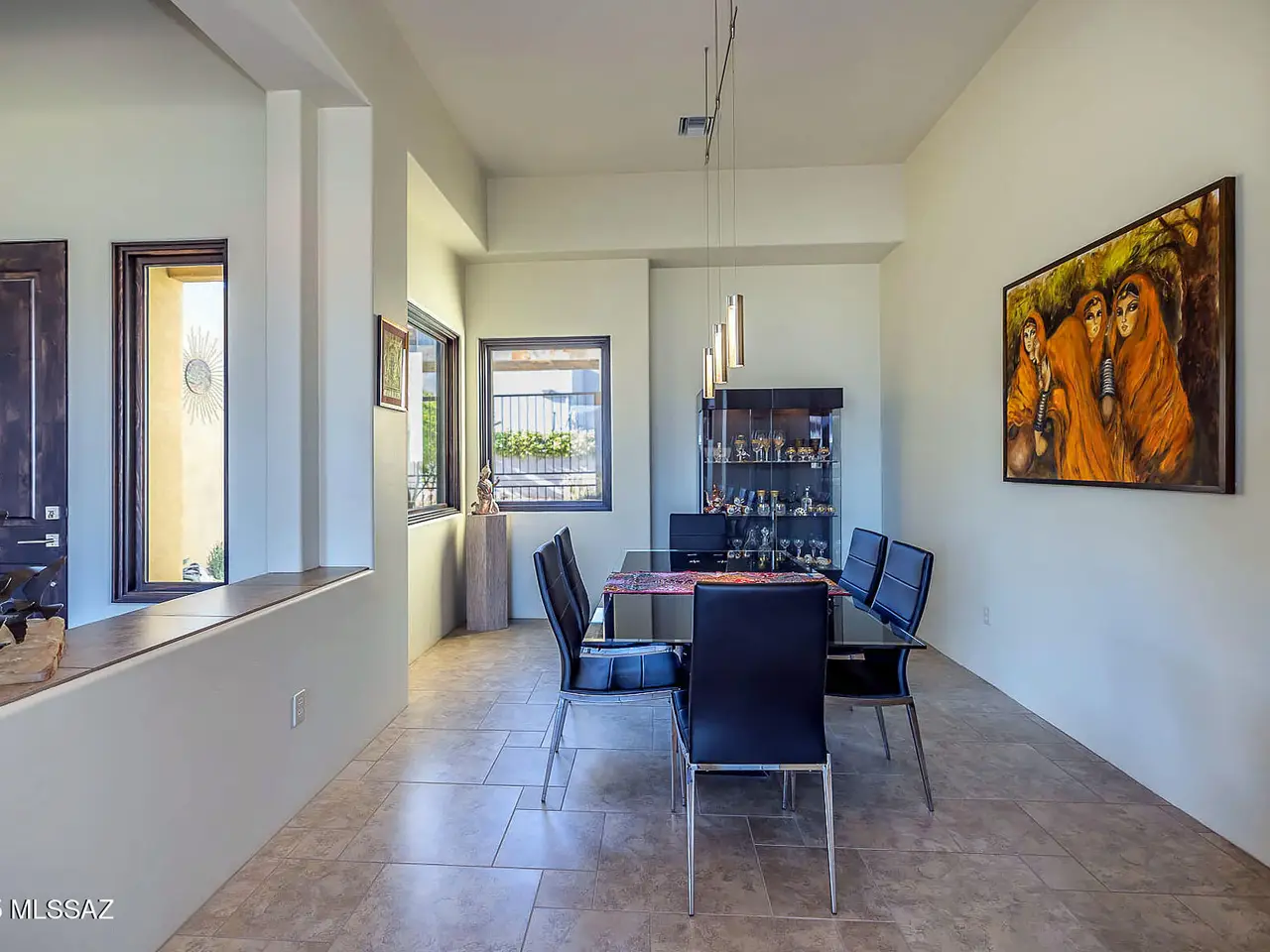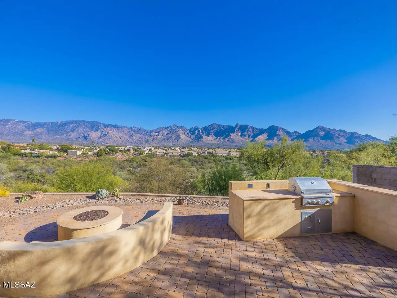 LUXURIOUS CUSTOM ESTATE nestled within the gated, picturesque community of Vistoso Pointe affords architectural detail, flexible living spaces plus uncompromising desert, mountain & city light views. Elevated, Premium East-facing lot with no one directly behind affords ultimate privacy. Featured are 4 bedrooms, 2.5 baths plus 3,531 sq ft of elegant living space including a spacious, upper level office/5th bedroom. Striking courtyard entry displays an expansive wrought iron gate with slate tile surround to welcome your guests. Inviting foyer flows effortlessly to formal dining room and large gathering room displaying a soaring, recessed ceiling, slate tiled fireplace flanked by art shelves, plus walls of windows accentuating the magnificent views. Gourmet kitchen hosts large center island, in-wall ovens and gas cooktop, open dining area with views plus outer island with wine cooler. Neutral stone floors highlight main living areas with granite countertops in kitchen, laundry & baths. Expansive Owner's Suite with rear patio access hosts a luxury spa bath with dual vanities, soaking tub, plus walk-in rain head shower and custom closet. Third bedroom is ideal as a Den/Media room while expansive upper-level Office accesses private balcony touting forever views. Extended laundry with sink adjoins powder room and 3-car garage with rustic iron doors and storage cabinets. Additional amenities include rich-hued cabinetry and doors, carpeted bedrooms, backlit art alcoves, fire sprinklers plus rolling sunshades off dining room. Retreat to a rear covered patio with outer cobblestone pavers, built-in grill station, firepit with curved bench seating, plus professional landscaping and spectacular views. Perfect for the most discerning buyer!