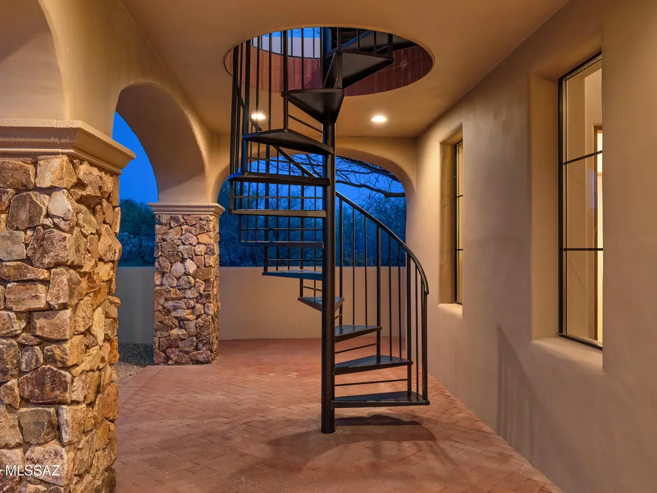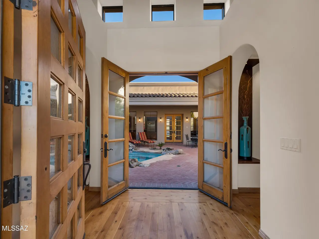 Enduring Mediterranean influence by RB Construction, solid masonry construction for unmatched durability and timeless architecture. 4,484 sq ft of grand scale living space, this home presents a unique tranquil interior courtyard complete with a soothing spa and expansive paneled windows that frame the space beautifully. Adding to its appeal, the property is situated adjacent to 26 acres of pristine conservation easement, ensuring a serene natural backdrop and enhanced privacy. Upon entering, you're greeted by a striking wood-beamed foyer that seamlessly transitions into a sophisticated kitchen featuring black granite countertops, a prep sink, large island with a built-in dining area overlooking the patio.