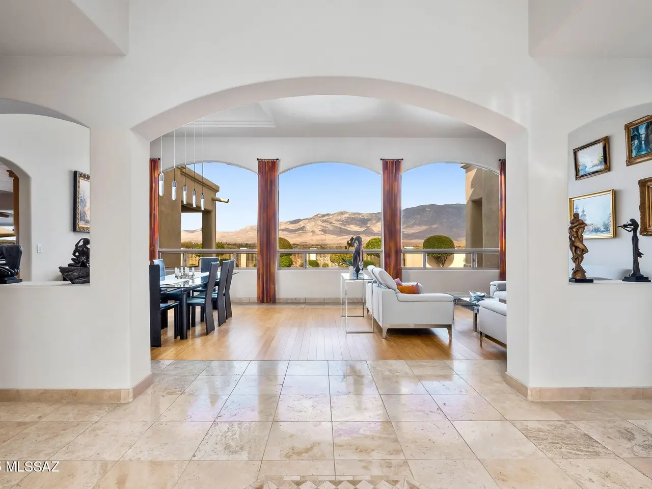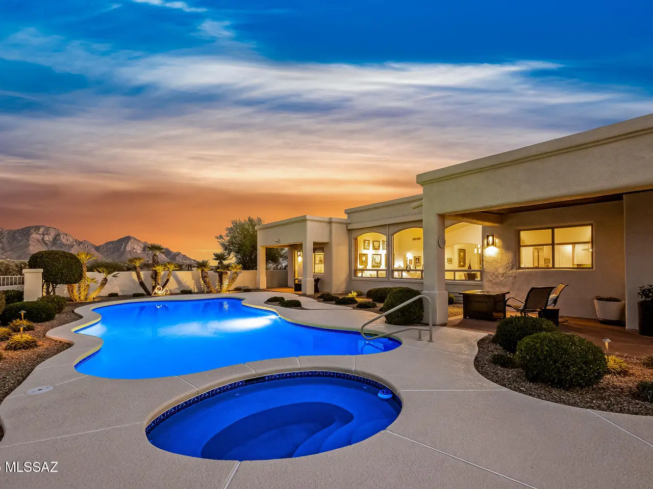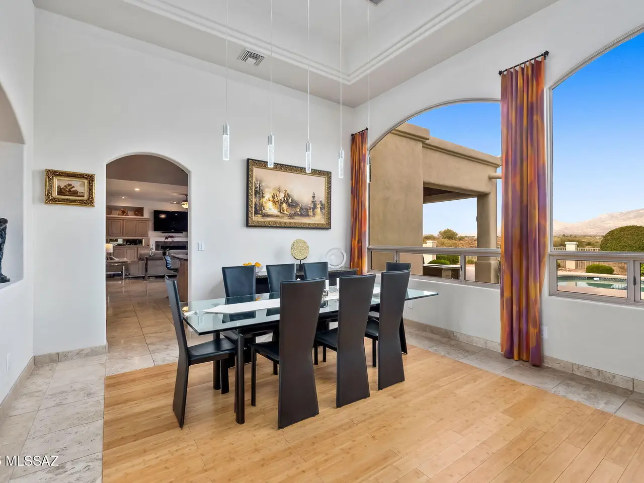 Situated at the end of a quiet cul-de-sac in the gated enclave of High Mesa, this exquisite 3, 580SF single-story estate blends timeless Mediterranean architecture with refined modern comforts, European flair and sweeping panoramic Catalina Mountain views. Thoughtfully designed and impeccably maintained, this 4BR/3BA residence with a spacious den/office offers exceptional livability ideal for both intimate gatherings and grand-scale entertaining. From the moment you arrive, the home's curb appeal captivates with meticulously maintained mature desert landscaping, brick paver driveway and charming gated courtyard reminiscent of a European villa. Inside, you're greeted with old-world craftsmanship and modern elegance with travertine tile and bamboo wood flooring, soaring vaulted ceilings, arched doorways and rich architectural detailing evoking a sense of classic European sophistication. The open-concept kitchen and family room form the heart of the home, featuring granite counters and backsplash, stainless appliances, built-in cabinetry, and a dry bar with beverage and wine cooler. The split-bedroom layout ensures comfort and privacy. The primary suite is a peaceful retreat featuring an electric fireplace, dual walk-in closets, newer walk-in shower, a newer Duravit soaking tub, newer bidet and toilet, and direct patio access. Every space has been thoughtfully upgraded, with newer toilets in all bathrooms, surround sound throughout the home and patio, modern lighting and no interior steps for effortless living. Additional systems include a newer HVAC, tankless water heater, central vacuum & Rolling Shutters. The resort-caliber backyard is designed for year-round enjoyment. A sparkling pool and spa are surrounded by Kool decking and flagstone, complemented by a built-in BBQ and griddle, multiple seating areas, and newer pool equipment all set against a breathtaking backdrop of mountain views. Whether you're sipping espresso under the covered patio or dining al fresco under the stars, this outdoor setting evokes the relaxed elegance of a European countryside estate. The garage is equally impressive with Polyurea-coated floors and storage cabinets. Perfectly located in the heart of Oro Valley near Honey Bee Canyon Park, scenic trails, and the exclusive Stone Canyon Club, this home is just minutes from Catalina State Park, The Loop trail system, and the shops, dining, and entertainment of Oro Valley Marketplace.