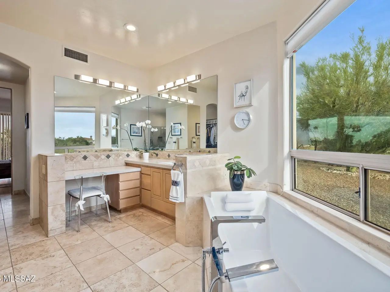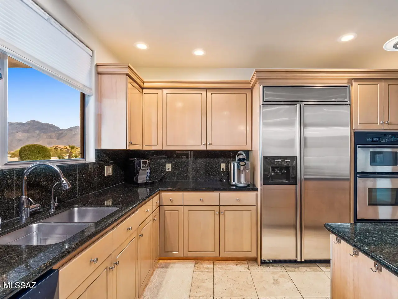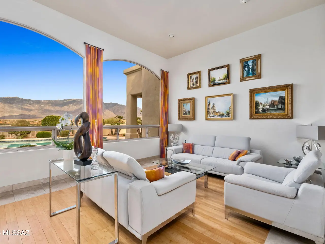 Situated at the end of a quiet cul-de-sac in the gated enclave of High Mesa, this exquisite 3, 580SF single-story estate blends timeless Mediterranean architecture with refined modern comforts, European flair and sweeping panoramic Catalina Mountain views. Thoughtfully designed and impeccably maintained, this 4BR/3BA residence with a spacious den/office offers exceptional livability ideal for both intimate gatherings and grand-scale entertaining. From the moment you arrive, the home's curb appeal captivates with meticulously maintained mature desert landscaping, brick paver driveway and charming gated courtyard reminiscent of a European villa. Inside, you're greeted with old-world craftsmanship and modern elegance with travertine tile and bamboo wood flooring, soaring vaulted ceilings, arched doorways and rich architectural detailing evoking a sense of classic European sophistication. The open-concept kitchen and family room form the heart of the home, featuring granite counters and backsplash, stainless appliances, built-in cabinetry, and a dry bar with beverage and wine cooler. The split-bedroom layout ensures comfort and privacy. The primary suite is a peaceful retreat featuring an electric fireplace, dual walk-in closets, newer walk-in shower, a newer Duravit soaking tub, newer bidet and toilet, and direct patio access. Every space has been thoughtfully upgraded, with newer toilets in all bathrooms, surround sound throughout the home and patio, modern lighting and no interior steps for effortless living. Additional systems include a newer HVAC, tankless water heater, central vacuum & Rolling Shutters. The resort-caliber backyard is designed for year-round enjoyment. A sparkling pool and spa are surrounded by Kool decking and flagstone, complemented by a built-in BBQ and griddle, multiple seating areas, and newer pool equipment all set against a breathtaking backdrop of mountain views. Whether you're sipping espresso under the covered patio or dining al fresco under the stars, this outdoor setting evokes the relaxed elegance of a European countryside estate. The garage is equally impressive with Polyurea-coated floors and storage cabinets. Perfectly located in the heart of Oro Valley near Honey Bee Canyon Park, scenic trails, and the exclusive Stone Canyon Club, this home is just minutes from Catalina State Park, The Loop trail system, and the shops, dining, and entertainment of Oro Valley Marketplace.