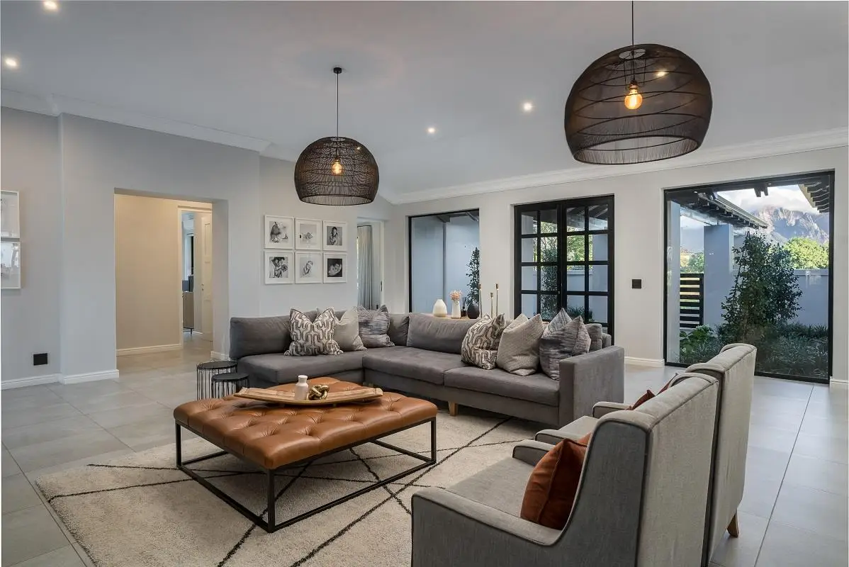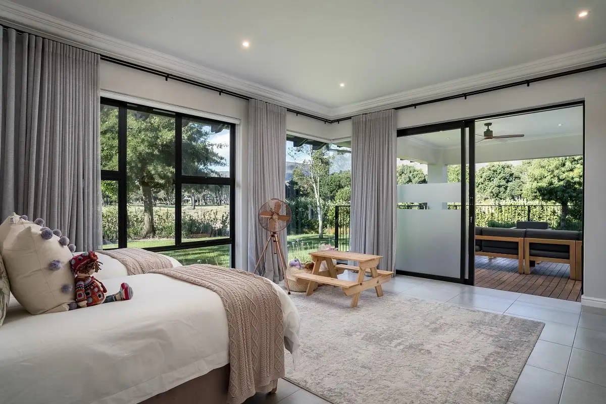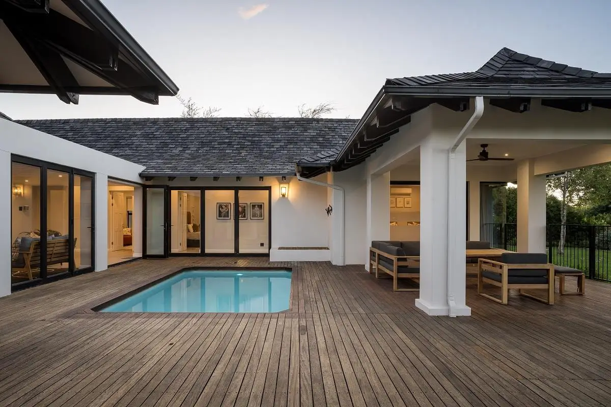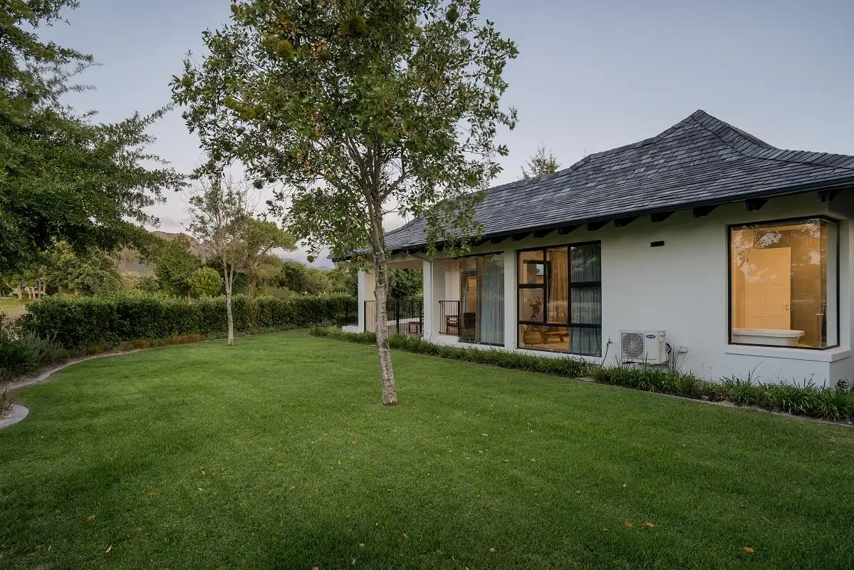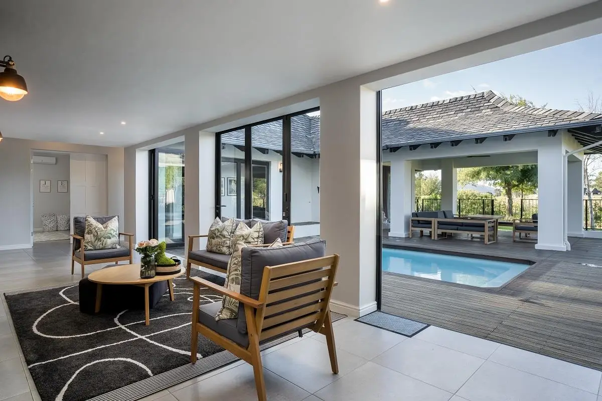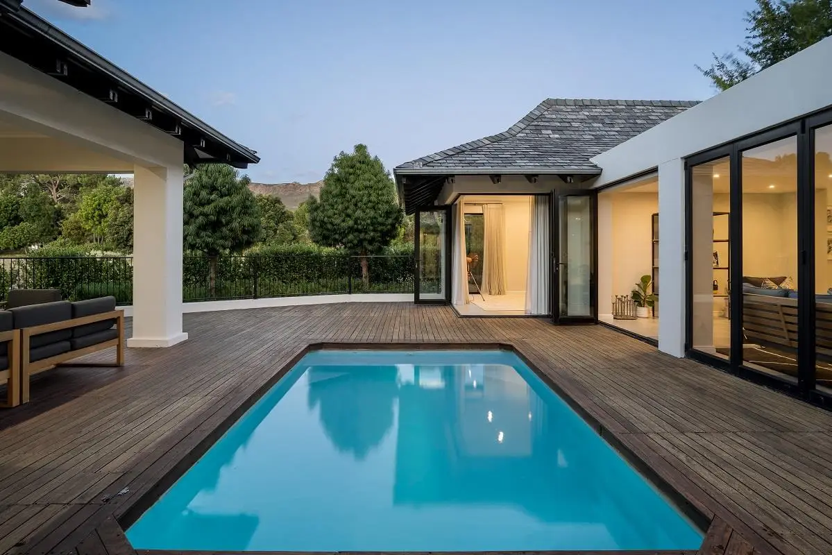 THIS BEAUTIFUL MODERN PROPERTY EPITOMISES WHAT ONE WOULD CALL A FAMILY HOME Stylishly renovated, this single level North facing home is well positioned on a corner stand with privacy and beautiful views towards the open green spaces of fairways and the members driving range. A welcoming entrance of a canopied lush garden leads to the front door. On entering the home the openness, lightness, modern clean lines and finishes give a fresh appeal and a feeling of space. The living space is designed for entertaining with a seamless flow from the well designed kitchen, the dining and lounge areas to glass stacking doors which open to a wooden deck and pool. An indoor braai, perfect for summer and winter use, completes this space and a covered area on the wooden deck adds an additional seating area with all flowing so well together to make the perfect spaces for family living and for entertaining. This beautiful home offers 4 well sized bedrooms all with ensuites, a large audio visual room, a study, a guest cloakroom, spacious open plan living areas and kitchen, utility room, triple garage, staff accommodation, invertor system, solar geyser and a well established garden. A rare opportunity to own a fully renovated and well positioned family home within the exclusive Pearl Valley Golf Estate.