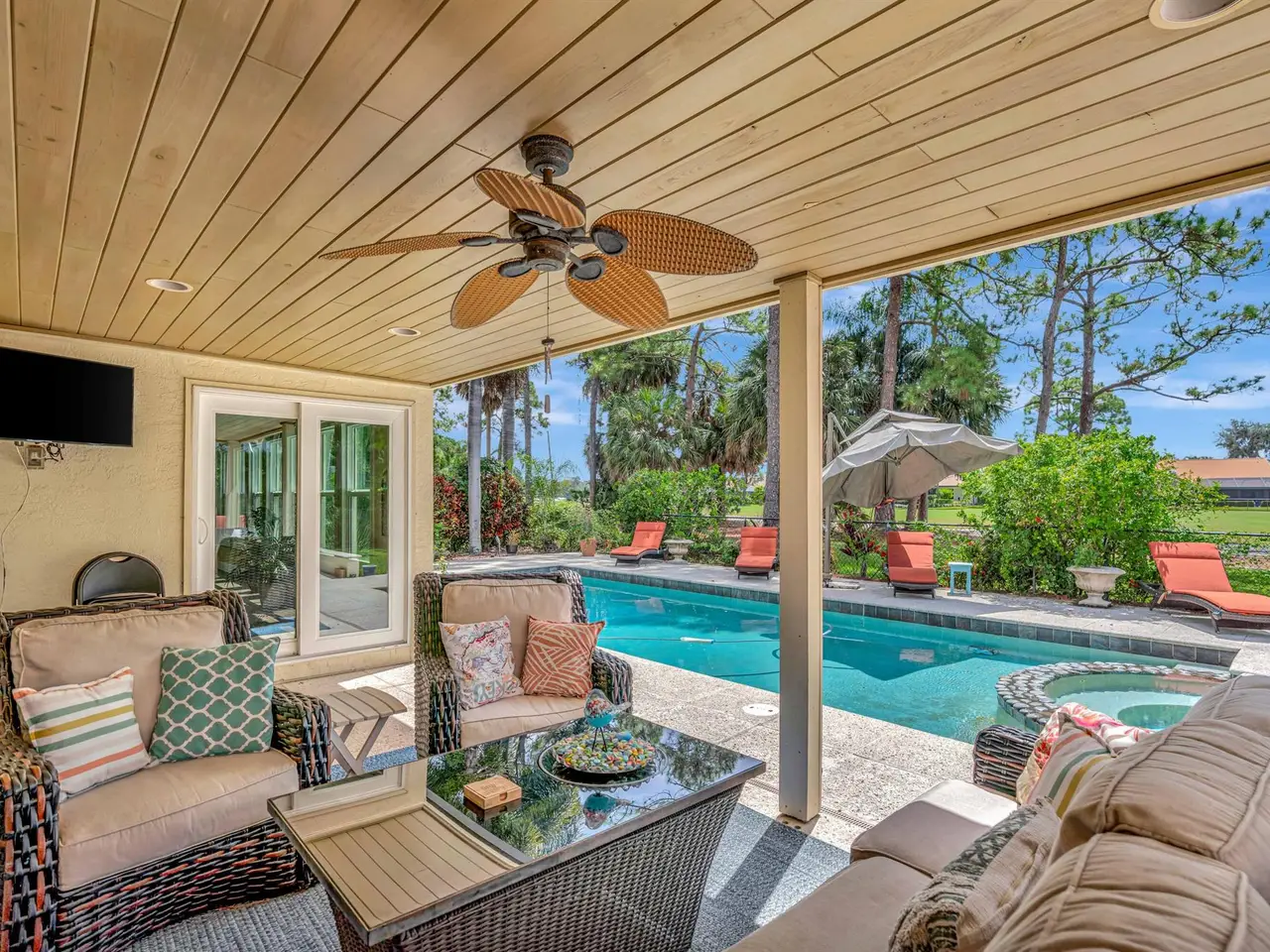 Located on quiet cul-de-sac in Thurston. This 3 bedroom, 3.5 bath boasts unbeatable golf course views. Two patios on the fairway make entertaining quite comfortable. Features include impact window, doors, and garage door. Plenty of room for two cars, motorcycle and storage. Includes Tesla charging station and oversized storage above in the garage. Freshly landscaped with new sprinkler system, 3 zone a/c's with 2 new a/c's. Brand new kitchen and appliances. Large pantry/storage off the kitchen. Sunroom has newly refurbished flat roof/sundeck. Huge laundry room with washer and 2 dryers. Security system in the home. Newly paved driveway and walkway