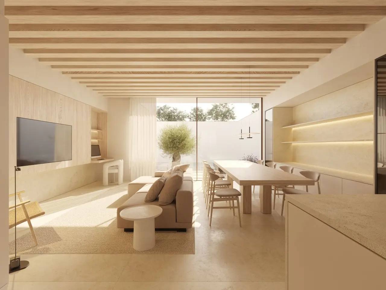 A modern townhouse is for sale, which impresses with its upscale furnishings and its special proximity to the beach. With a living area of approx. 226 m², it offers sufficient space and comfort for discerning residents. The property is characterized by a well thought-out room layout, which comprises a total of four rooms. These include three spacious bedrooms, which offer ideal space for relaxation and personal retreats. Two high-quality bathrooms underline the high standard of the property. A highlight of the property is the underfloor heating, which ensures a comfortable living climate in all rooms. There is also an air conditioning system, which ensures a pleasant room temperature even on hot summer days. The use of a KNX system enables intelligent control and networking of lighting, air conditioning and security functions, which significantly increases living comfort. The home's fittings leave nothing to be desired. The designer kitchen features Gaggenau appliances and the innovative BORA hob, which specializes in effective steam extraction solutions. The built-in cupboards in natural oak offer plenty of storage space and give the interior an elegant touch. In addition, the integrated SONOS sound system provides a high-quality acoustic environment. The outdoor area of the townhouse with its large patio invites you to linger and relax. The private pool offers welcome refreshment and an exclusive leisure option right on the doorstep. The offer is rounded off by a spacious roof terrace, which provides additional outdoor space and offers a variety of uses. The floor coverings in the house are made of natural stone and give the rooms a natural and timeless look. Only around 100 meters from the beach, the property enjoys a sought-after location that combines both tranquillity and the advantages of an urban environment. This is an outstanding opportunity for discerning buyers looking for a stylish and modern home that will impress with both its location and features. Arrange a viewing today to see the benefits of this property for yourself.