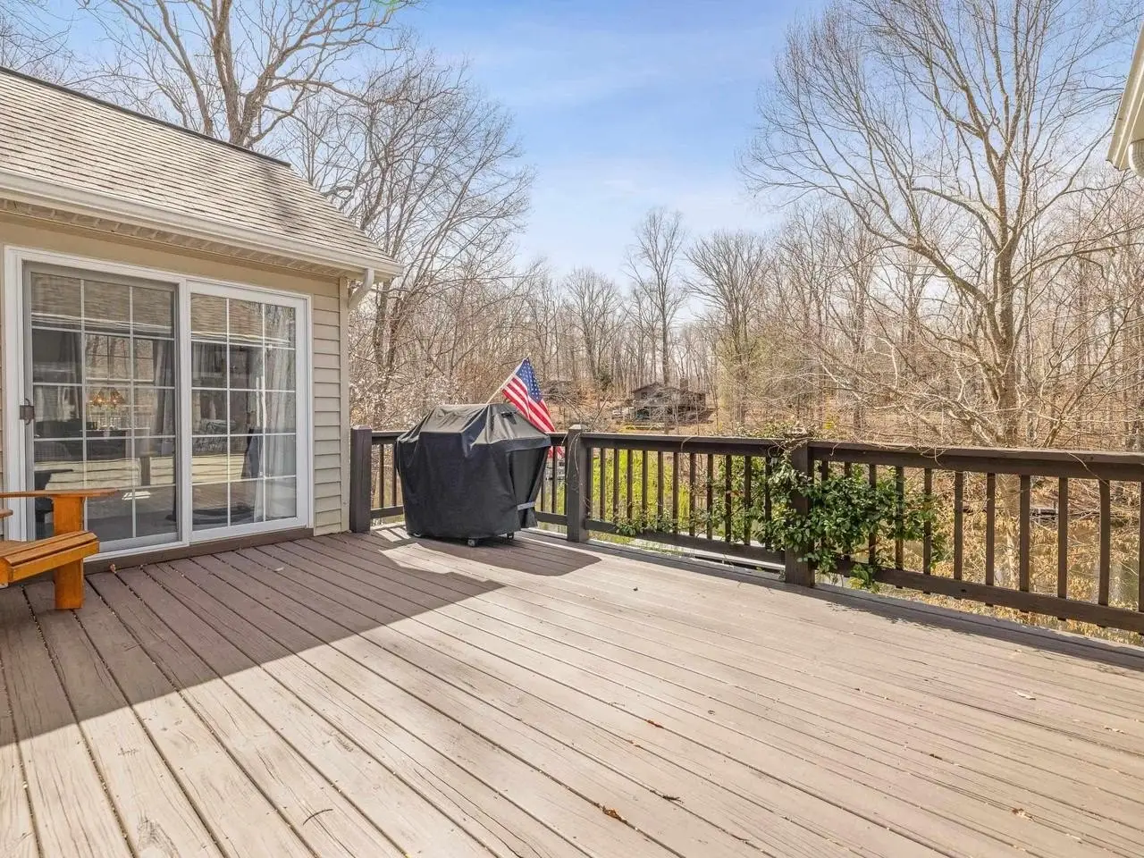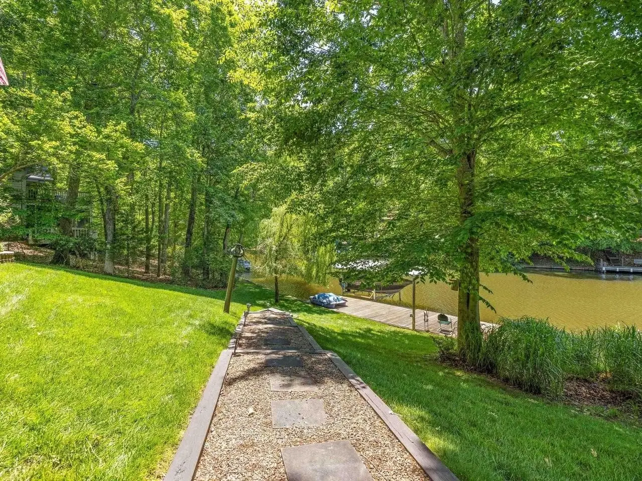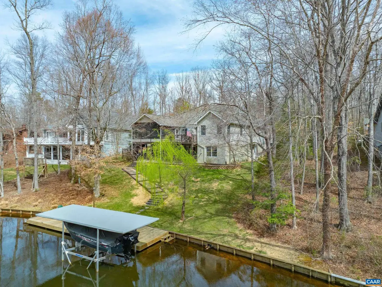EXPERIENCE THE BEST OF LAKE LIVING! Beautifully maintained waterfront home offers 110? of lake frontage on a peaceful .61-acre lot in a no-wake cove?perfect for fishing, kayaking, swimming, or floating. A large dock w/ boat lift (new in 2022), fishing/ski boat & pedal boat are included. Built by award-winning Southern Homes, this gem features an open floor plan, vaulted ceilings, solid hardwoods & stunning lake views from the cozy living room w/ gas fireplace. Kitchen Aid double oven, Bosch dishwasher, Miele gas stovetop, Samsung French door fridge, Maytag washer. Main-level primary suite includes a spa-like bath w/ heated tile floors, walk-in shower & double vanity. Outdoor living includes screened porch, large deck & screened patio?all overlooking the lake. Terrace level includes bedroom, wet bar, office/craft room (optional 4th bed) & workshop w/ private yard access. Gas hookup ready for 2nd fireplace & outdoor shower. Whole-yard irrigation w/ new pump (2024). New roof, gutters & guards (2023). VA Green lawn service & A/C maint. paid through 2025. Close proximity to Beach 2 & easy access to the water?s edge via a lush, grassy backyard?your private lakeside retreat awaits! Must see!,Granite Counter,Oak Cabinets,Fireplace in Living Room