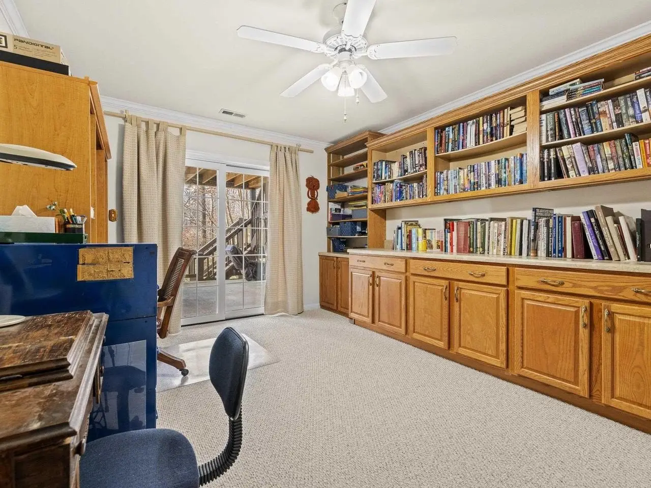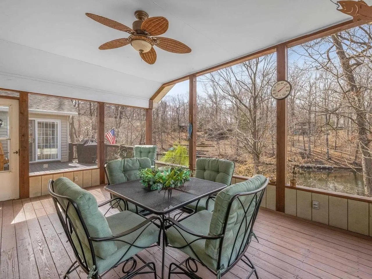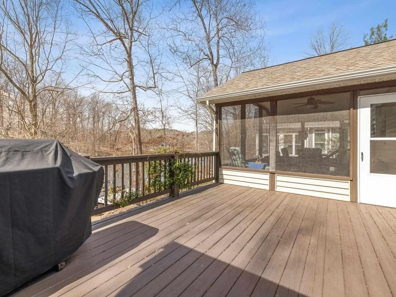 EXPERIENCE THE BEST OF LAKE LIVING! Beautifully maintained waterfront home offers 110? of lake frontage on a peaceful .61-acre lot in a no-wake cove?perfect for fishing, kayaking, swimming, or floating. A large dock w/ boat lift (new in 2022), fishing/ski boat & pedal boat are included. Built by award-winning Southern Homes, this gem features an open floor plan, vaulted ceilings, solid hardwoods & stunning lake views from the cozy living room w/ gas fireplace. Kitchen Aid double oven, Bosch dishwasher, Miele gas stovetop, Samsung French door fridge, Maytag washer. Main-level primary suite includes a spa-like bath w/ heated tile floors, walk-in shower & double vanity. Outdoor living includes screened porch, large deck & screened patio?all overlooking the lake. Terrace level includes bedroom, wet bar, office/craft room (optional 4th bed) & workshop w/ private yard access. Gas hookup ready for 2nd fireplace & outdoor shower. Whole-yard irrigation w/ new pump (2024). New roof, gutters & guards (2023). VA Green lawn service & A/C maint. paid through 2025. Close proximity to Beach 2 & easy access to the water?s edge via a lush, grassy backyard?your private lakeside retreat awaits! Must see!,Granite Counter,Oak Cabinets,Fireplace in Living Room