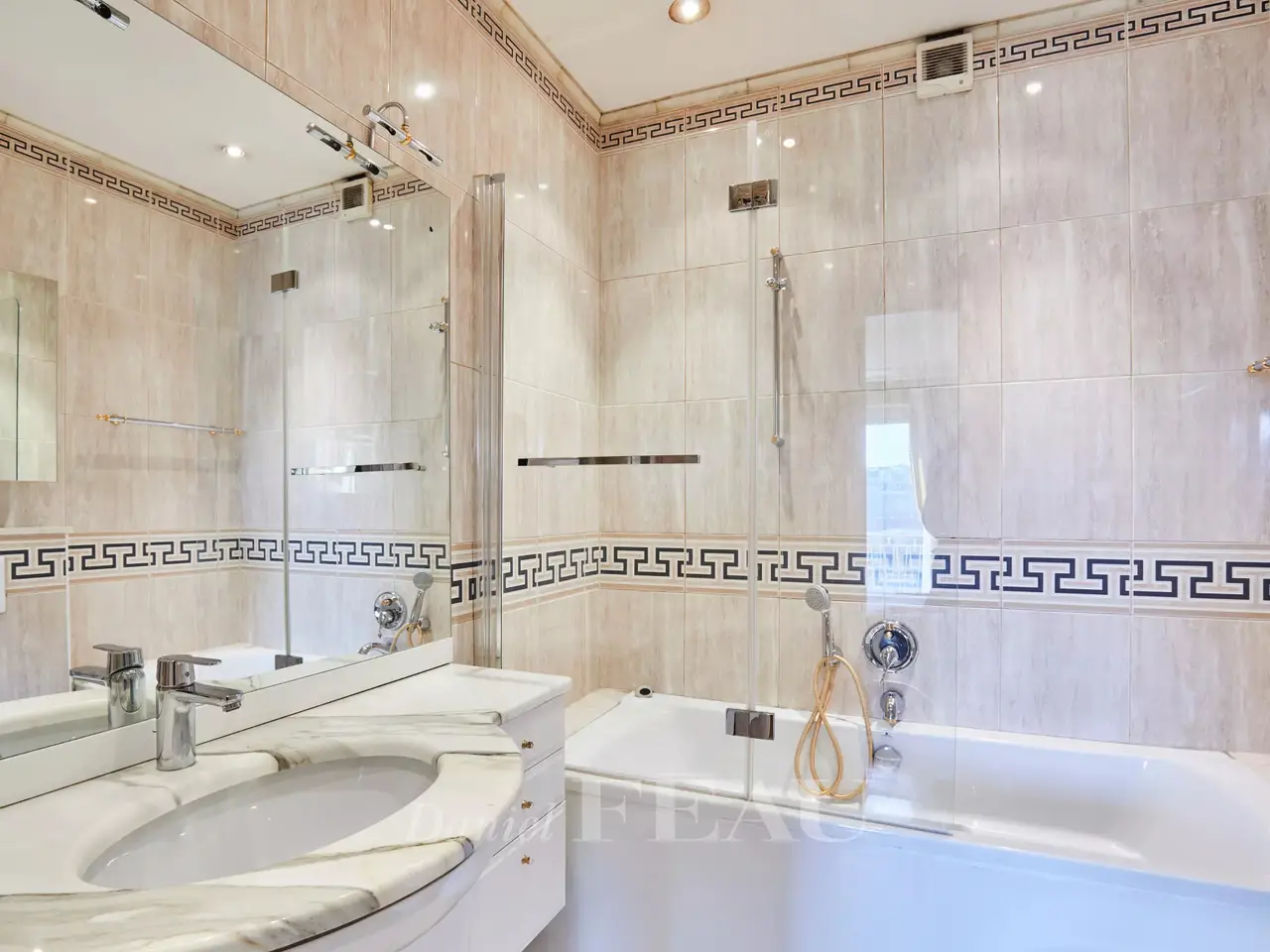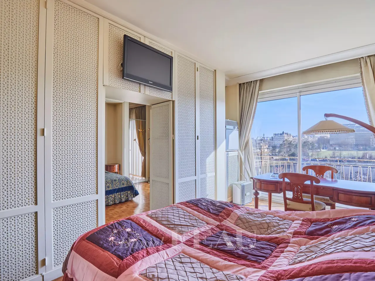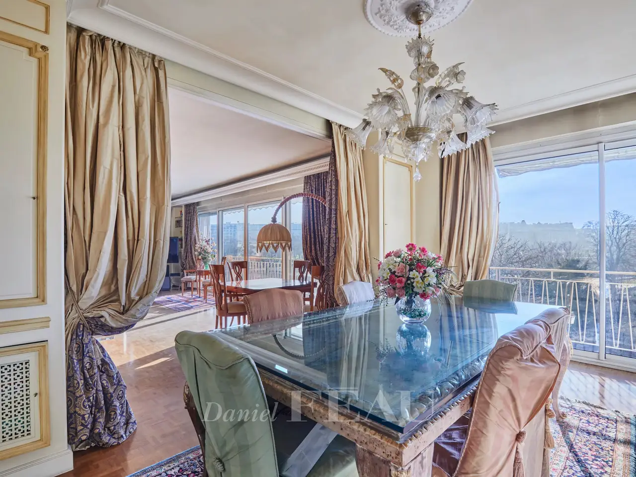 Porte Maillot. This 150 sqm dual-aspect apartment on the 3rd floor of a luxurious relatively recent building benefits from a south-facing exterior area commanding an open view of the Bois de Boulogne and the Eiffel Tower. It includes a corner double living/reception room, a dining room, a spacious kitchen, two bedrooms opening onto a balcony, and two bathrooms. With a cellar, and a parking space (60000€)