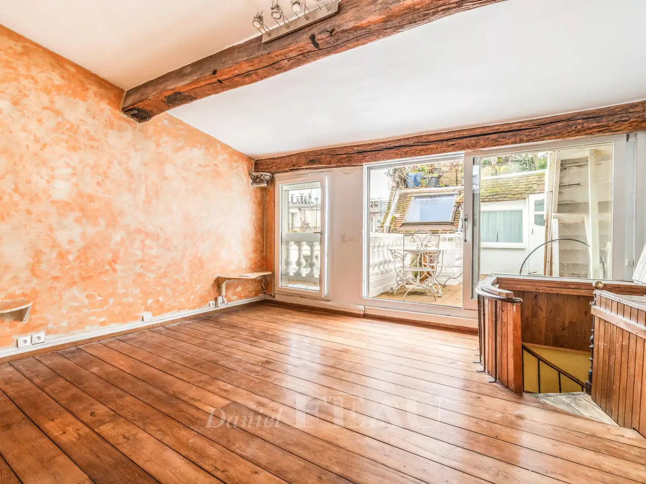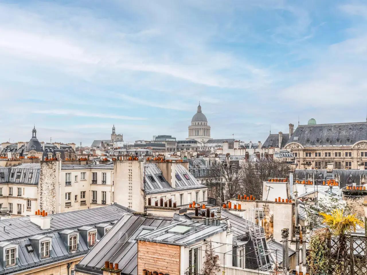 Between Notre Dame Cathedral and the Panthéon. This atypical apartment offering 118 sqm of bright and peaceful floor space and 108 sqm of living space as defined by the Carrez Law is on the 4th and top floor of a late 19th century building with a lift. Enjoying an open view over the rooftops, it includes a spacious living/reception room, a kitchen with dining facilities, a bedroom with a shower room, and a separate wc. Upstairs are two rooms including a master suite with a bathroom, both of which open onto a sunny terrace. A roof terrace commanding a panoramic view of the capital’s iconic landmarks is on the top floor. Henri IV catchment area.