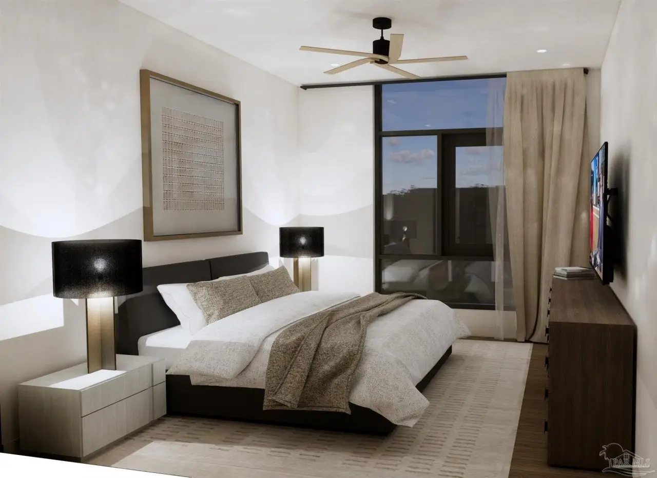 Downtown Pensacola's historic East Garden District is entering a new era of luxury urban living with Tristan Residences, an upscale five-story condominium inspired by 16th-century explorer Tristán de Luna y Arellano. Just across the urban plaza from the new Hotel Tristan, this landmark development blends timeless architecture with modern sophistication and offers residents exclusive access to hotel-style amenities, including housekeeping, valet, room service, and preferred pricing at the hotel restaurant and rooftop bar. Each residence features 10-foot ceilings, solid-core interior doors, wide plank engineered hardwood floors, and designer light fixtures. Floor-to-ceiling windows and terrace doors flood the open living space with natural light, leading to a private terrace. The gourmet kitchen boasts Shaker-style soft-close cabinetry, quartz slab countertops with full-height backsplash, undercabinet lighting, and high-end appliances-including a French door refrigerator, radiant electric range, convection microwave, and SmartSense range hood. The large island with seating creates the perfect balance of form and function.The primary suite includes a walk-in closet with custom built-ins and blackout roller shades, while the spa-inspired bath offers a quartz double vanity, custom wood cabinetry, designer lighting and mirrors, and a walk-in shower. Additional conveniences include smart thermostats, high-speed data wiring, dimmable LED lighting, and secure key-fob access.Community amenities elevate daily living with a resident lounge connected to a gourmet coffee shop/bakery, meeting and dining flex space, two-station dog washroom, on-site storage units, reserved parking, and mail and package room. Surrounded by a pedestrian-friendly plaza with fountains, green spaces, and locally inspired dining, Tristan Residences brings together the best of downtown Pensacola