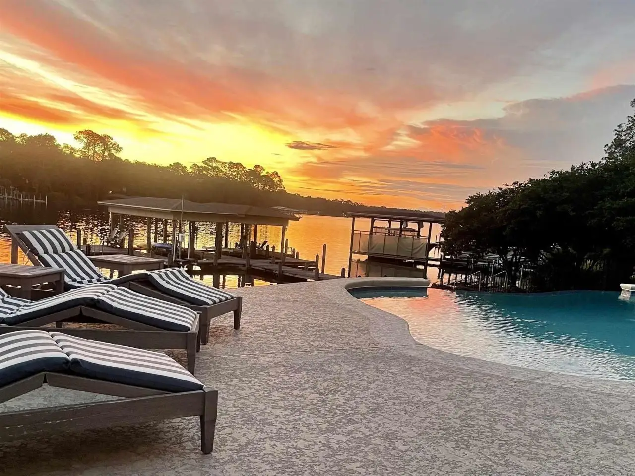 This custom home epitomizes luxury waterfront living. The mahogany arched front door opens to a grand 2 story foyer adorned with crown moldings & 12 foot ceilings. Water views are abundant throughout the downstairs living areas. French doors open onto the large covered lanai that overlooks the perfectly landscaped backyard, custom, pool, dock, & boathouse. The elegant family room features custom built-in cabinetry, a wet bar & a cozy gas fireplace. The spacious dining room includes custom drapes & offers plenty of room for large family gatherings. The gourmet kitchen is a chef's dream, boasting top-of-the-line appliances including a Subzero refrigerator, Thermador gas cooktop with six burners, double oven, a warming drawer, wine refrigerator & a double drawer dishwasher. The kitchen area offers ample space for a large family table, ensuring everyone can gather together & be part of the action. Sitting between the dining room & the kitchen, the butler's pantry is perfect for overflow appliances & hosting gatherings. A custom walk-in wine cellar, includes a wet bar & a 12 foot high wine cabinet. The wine cellar has its own cooling system & thermostat. The owner's suite is a private retreat & spans the length of the waterfront side of the home. This area includes an office/sitting room with a gas fireplace, hardwood flooring, a spacious 16 x 20 bedroom & a large walk-in closet. The luxurious master bathroom features a walk-in shower with three shower heads, soaking tub & dual vanities. The owner's suite also has private terrace overlooking Bayou Texar. There are 3 additional bedrooms upstairs, each with their own fully renovated bathroom. The fifth bedroom is conveniently located on the first floor.A bonus room/game room on the second level is the perfect spot for watching sporting events or hosting family movie night. The laundry room is also conveniently located upstairs. This home is completely Move In Ready! Buyer to verify all measurements and information.