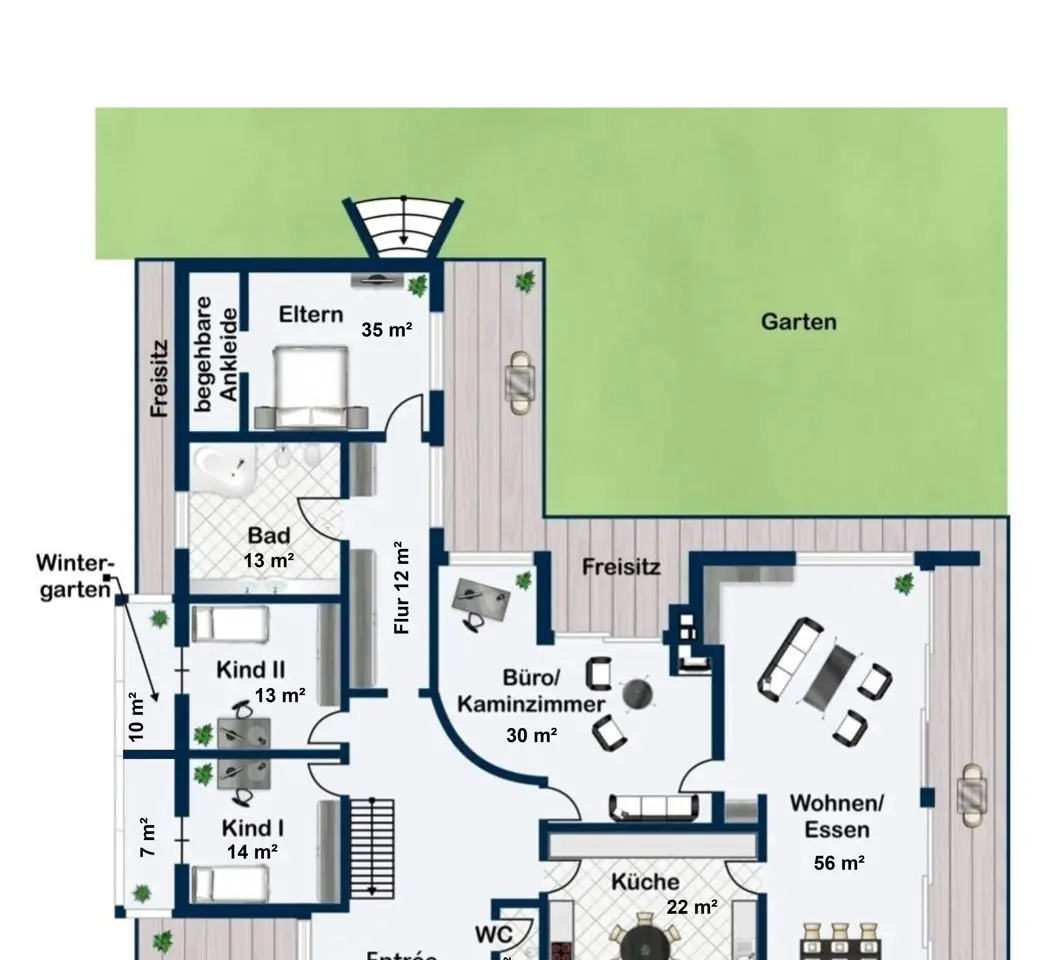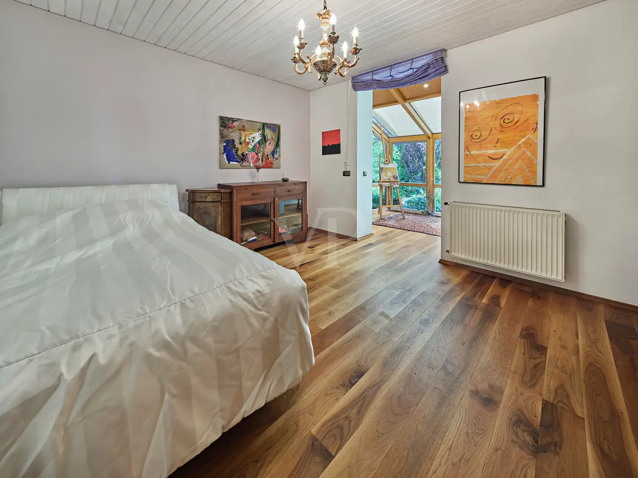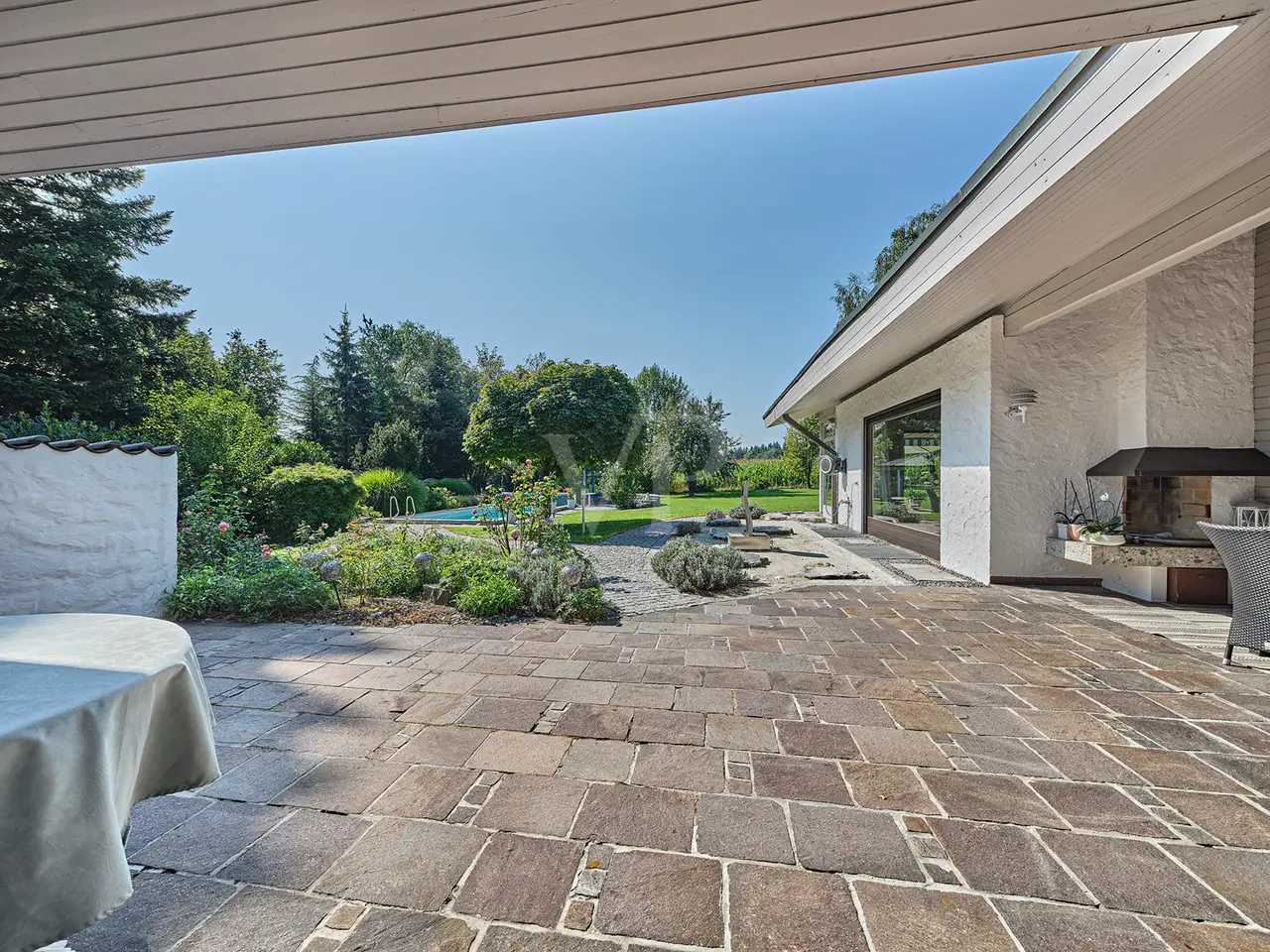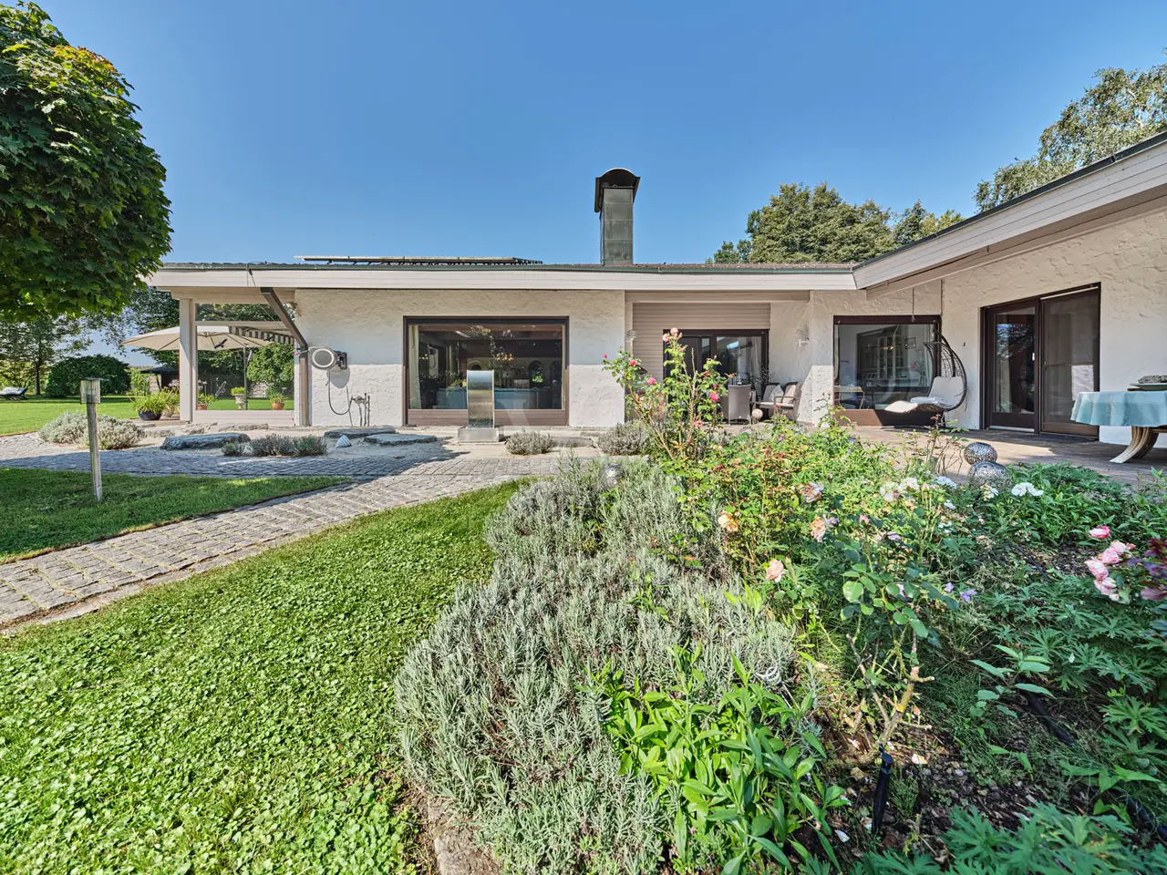 This spacious bungalow-style villa with room heights of up to 5 meters is located on a spacious 3,159 m² plot and offers a living space of around 330 m². The rooms are furnished to a high standard throughout and offer superior living comfort. Upon entering the house, you are greeted by a bright and spacious entrance area with a checkroom and access to the double garage. Numerous windows, some of which are floor-to-ceiling, provide plenty of natural light and an inviting atmosphere. The spacious living/dining room has a water-bearing tiled stove and large panoramic windows that lead onto the terrace and into the garden on the south side. The dining area forms a successful transition from the open-plan living area to the kitchen, which can be closed off. The fireplace room with indoor and outdoor fireplace is also ideal as a visitor or guest room. The kitchen, with high-quality slate flooring, has exclusive furnishings and brand-name electrical appliances. The master bedroom has a separate dressing room. The adjoining hallway is designed as a closet room and leads to two further bedrooms or children's rooms, each of which has its own conservatory. The daylight bathroom impresses with its comfortable fittings. A separate WC is available for guests. A particularly practical feature is that all rooms on the ground floor have their own terrace or garden access. The almost all-round natural stone terrace is partially covered and offers a variety of uses in almost any weather. The floors on the first floor are laid with very high-quality solid floorboards and parquet flooring. The doors are made of solid wood in an elegant arched style. The predominantly newly glazed wooden windows are fitted with custom-made fly screens. The basement offers additional comfort with a large spa area, including a swimming pool with counter-current system, a shower room, a sauna for 6-8 people, lounging areas and daylight windows. Four further basement rooms offer space for fitness/yoga, laundry, hobbies and a workshop. The fitness/yoga room has its own shower and WC. The heating is provided by district heating (wood chips). A photovoltaic system with an output of 10 kW and a Tesla buffer battery of the same size as well as a solar thermal system with a 750-liter buffer storage tank ensure an environmentally friendly energy supply. The outdoor area includes a tiled outdoor pool with a roll-down cover, a pavilion with thermal insulation glazing and a copper roof as well as two garden sheds. There is also a double garage with electric doors and 2-3 outdoor parking spaces. An alarm system for the house and garden provides additional security. This villa offers a wide range of possible uses and a high level of living comfort. As it was built in a mixed area as a former business villa, commercial use can also be considered here. If required, a commercial space of up to approx. 700 m² can be leased in the neighboring commercial hall. The location is very quiet despite the proximity to the commercial enterprises. The south-facing garden in particular offers unparalleled privacy and an unobstructed view of meadows and fields. As the businesses close at 6 p.m. at the latest and there is generally no work at all at weekends, the villa on offer is virtually a quiet, secluded location during these periods. You will receive further information with our detailed exposé.