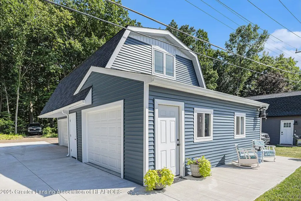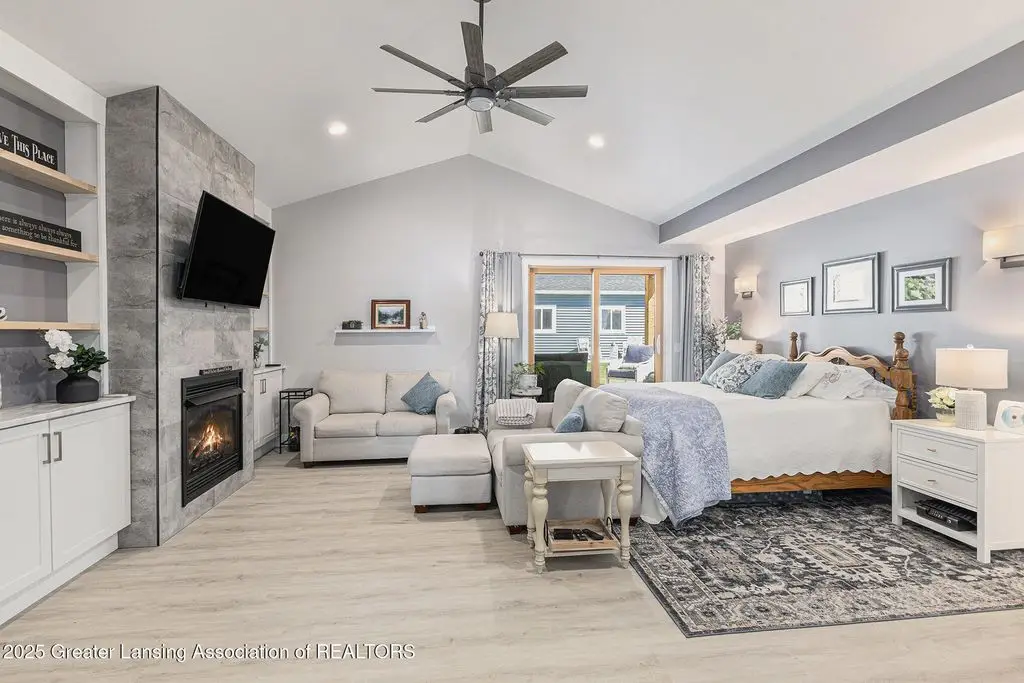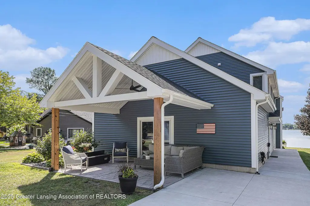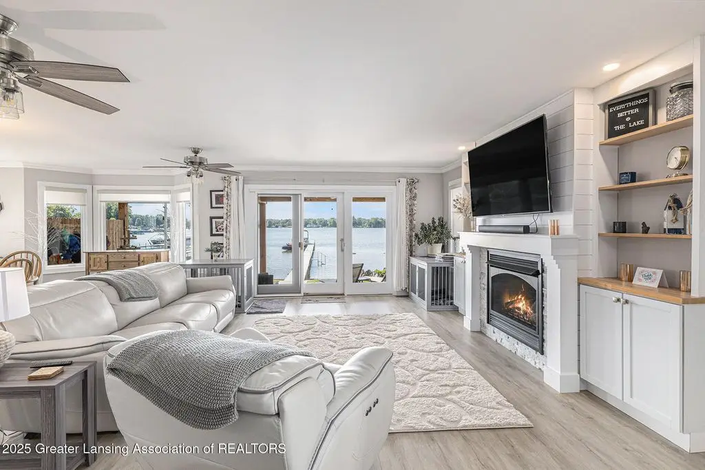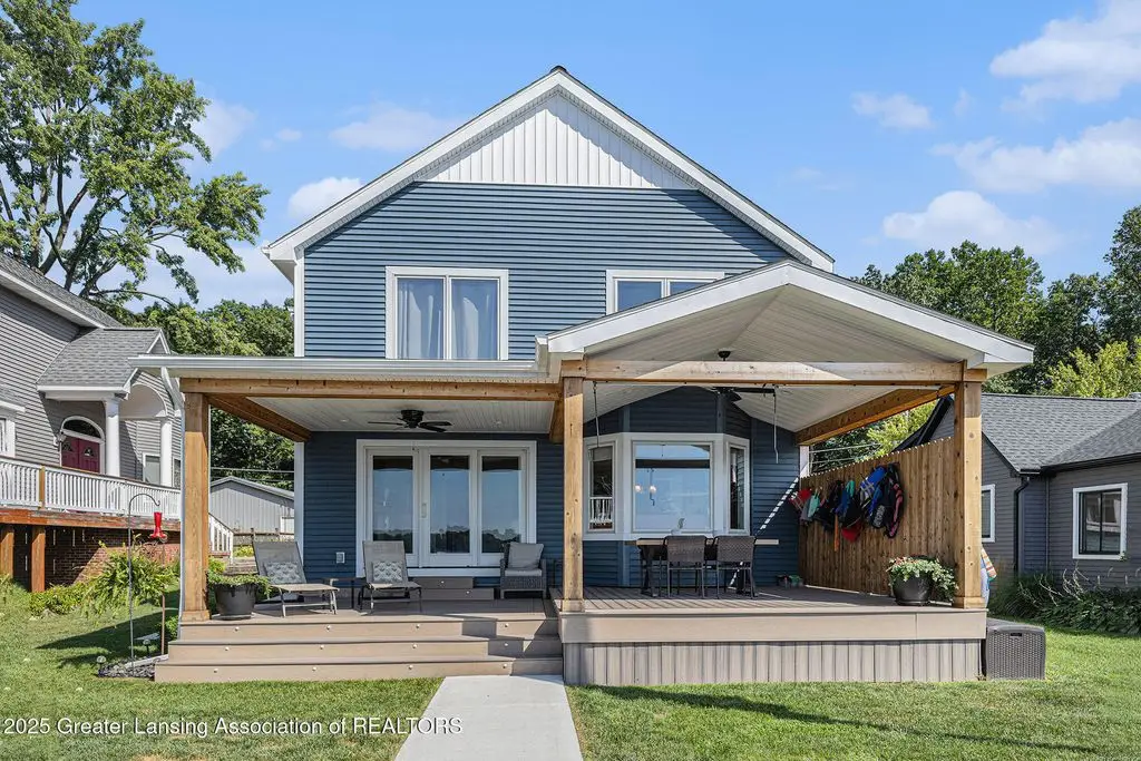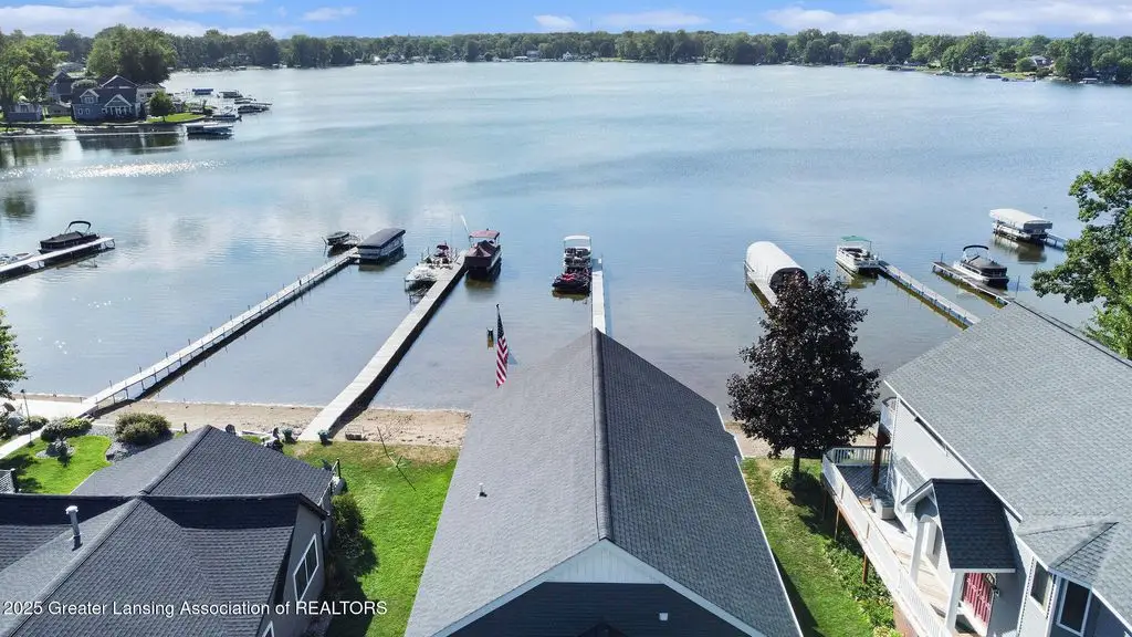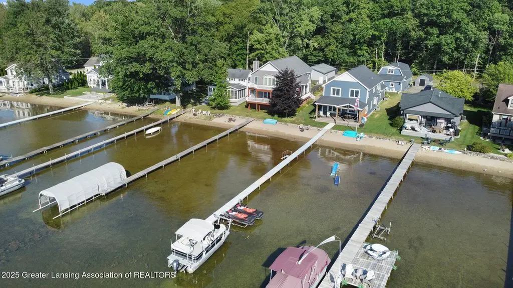 If you've been searching for a one-of-a-kind home on the Huron chain of lakes, this is it! The entire 3,216 square foot two-story home has been professionally and tastefully updated on the exterior and interior. Features five bedrooms, 3.5 bathrooms, main floor primary suite is massive with soaring ceilings, a cozy built in fireplace surrounded by shelves, a huge custom built WI closet, large bathroom w/dual sinks, tiled walk-in shower and granite countertops, complete with door to your own private covered concrete patio with recessed lighting and ceiling fan. 2nd floor features remodeled primary suite with fireplace, updated bath with dual sinks, tiled walk-in shower, closet and additional laundry area. Three additional spacious bedrooms and a full bath are located on the second level. Gorgeous kitchen with SS appliances and quartz countertops that wraps around to the spacious open dining/living room area facing the lake and new Trex deck with recessed lighting and ceiling fans. Three-car detached finished, heated garage with stairs to a loft for extra storage. All new concrete drive, (lots of parking) patio space and sidewalk to dock/lake. Within the last few years this home has had all new flooring throughout, a new roof (house and garage), new siding, new two-zoned unit furnace and air conditioning, new water heater, too many upgrades to mention. Basically a brand new home with 49 feet of lake frontage, an outdoor shower convenient for rinsing yourself or your pets after a lake day/swim. Also includes generator that is wired to run the entire house.