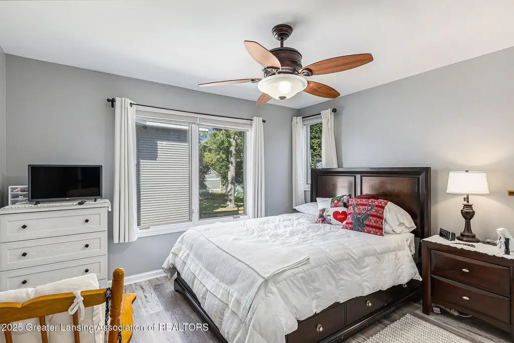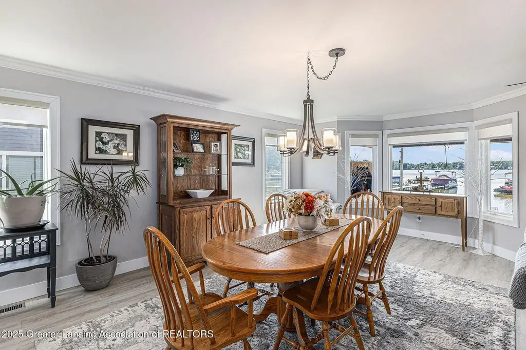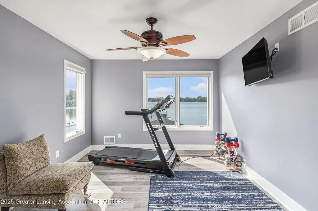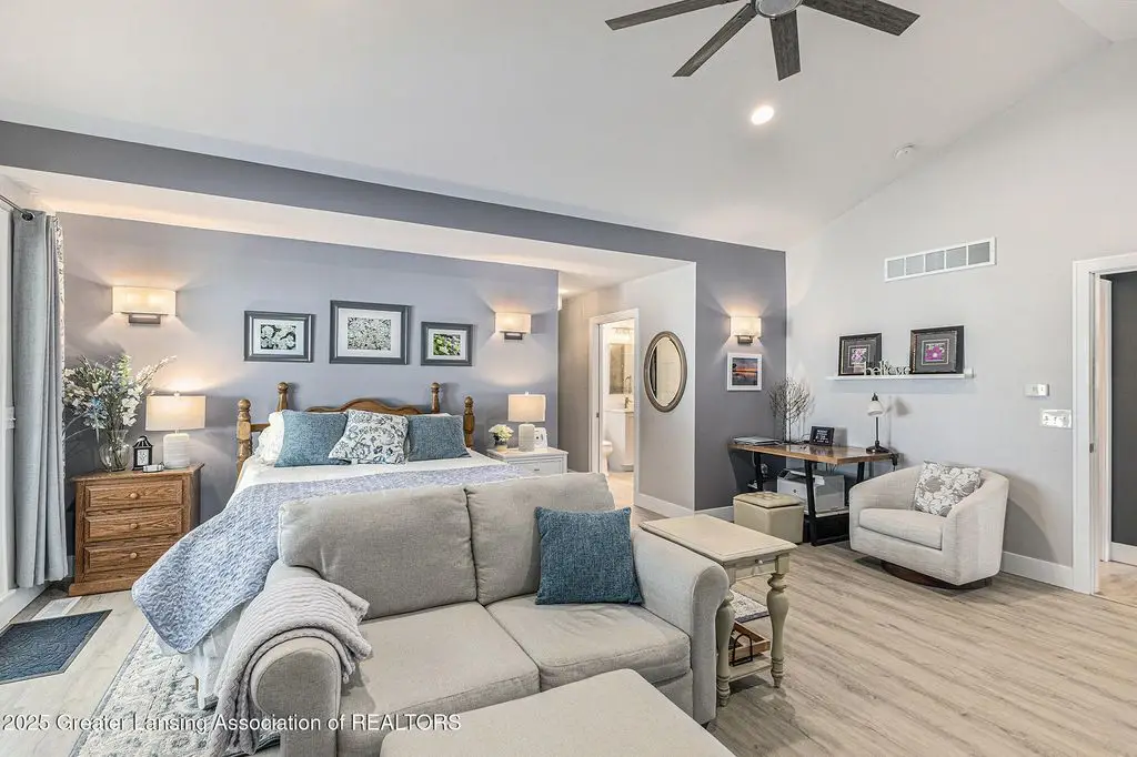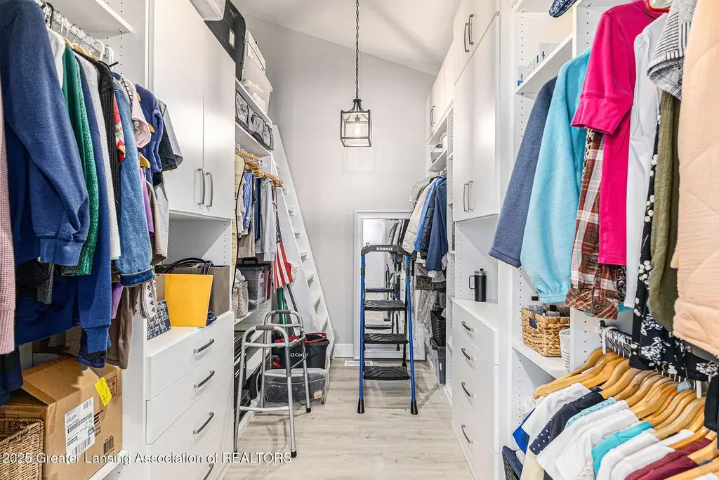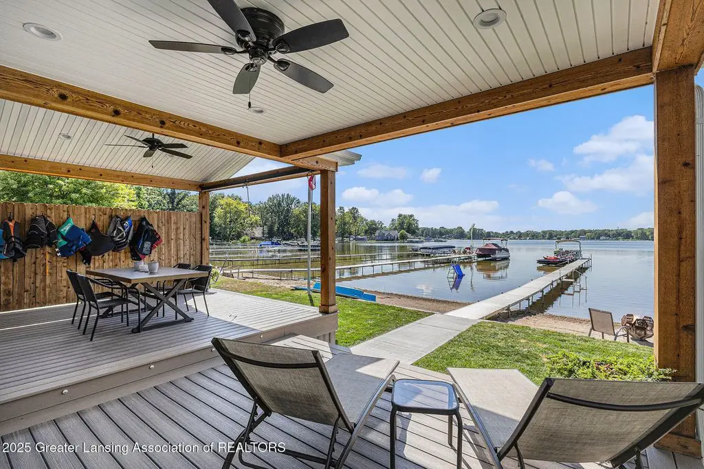 If you've been searching for a one-of-a-kind home on the Huron chain of lakes, this is it! The entire 3,216 square foot two-story home has been professionally and tastefully updated on the exterior and interior. Features five bedrooms, 3.5 bathrooms, main floor primary suite is massive with soaring ceilings, a cozy built in fireplace surrounded by shelves, a huge custom built WI closet, large bathroom w/dual sinks, tiled walk-in shower and granite countertops, complete with door to your own private covered concrete patio with recessed lighting and ceiling fan. 2nd floor features remodeled primary suite with fireplace, updated bath with dual sinks, tiled walk-in shower, closet and additional laundry area. Three additional spacious bedrooms and a full bath are located on the second level. Gorgeous kitchen with SS appliances and quartz countertops that wraps around to the spacious open dining/living room area facing the lake and new Trex deck with recessed lighting and ceiling fans. Three-car detached finished, heated garage with stairs to a loft for extra storage. All new concrete drive, (lots of parking) patio space and sidewalk to dock/lake. Within the last few years this home has had all new flooring throughout, a new roof (house and garage), new siding, new two-zoned unit furnace and air conditioning, new water heater, too many upgrades to mention. Basically a brand new home with 49 feet of lake frontage, an outdoor shower convenient for rinsing yourself or your pets after a lake day/swim. Also includes generator that is wired to run the entire house.