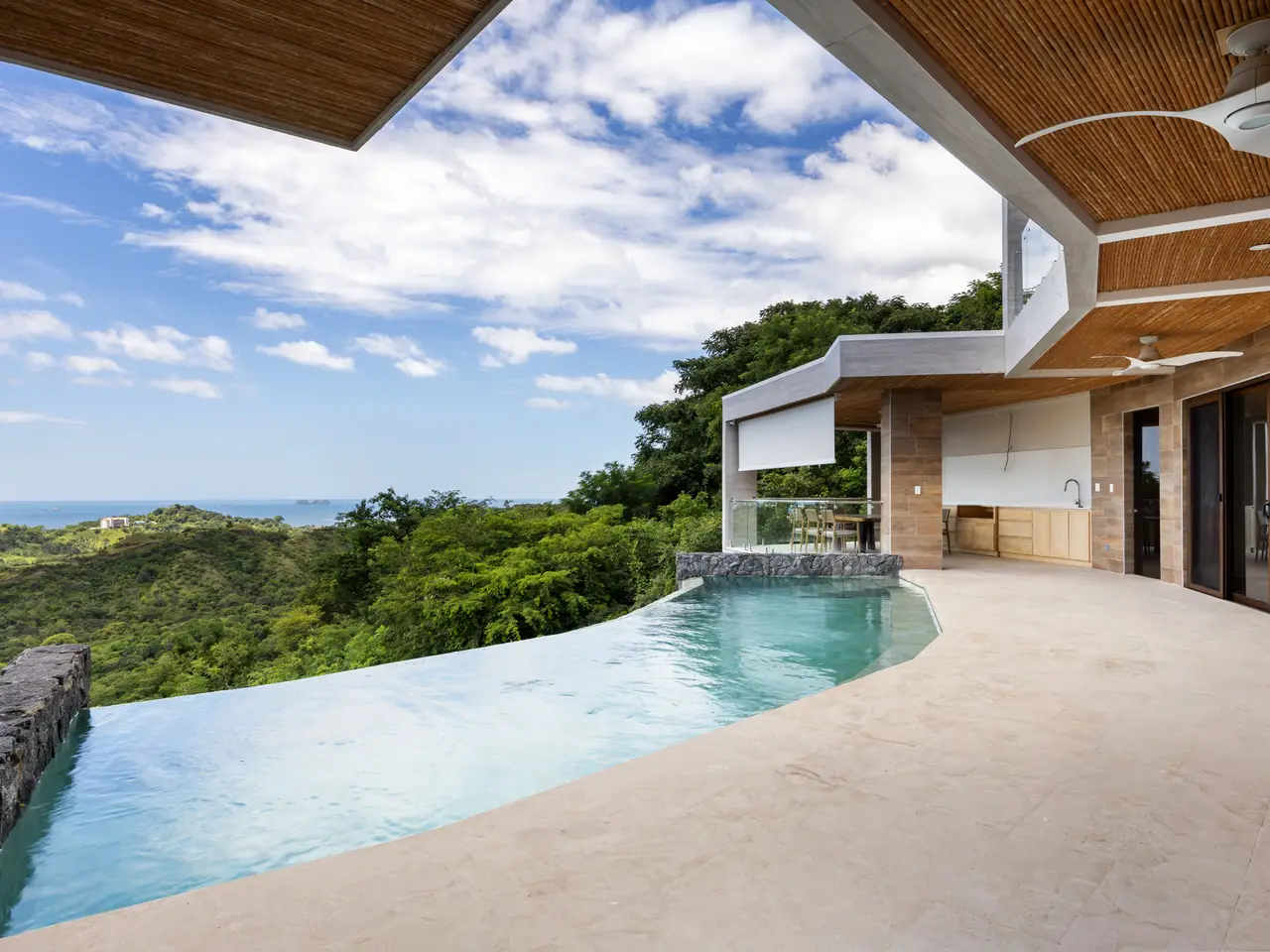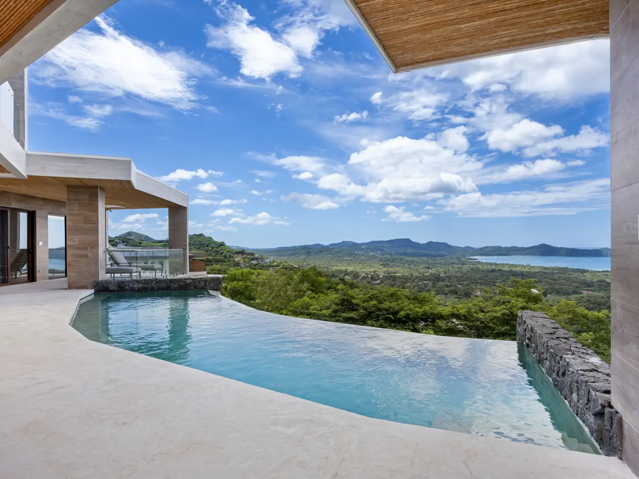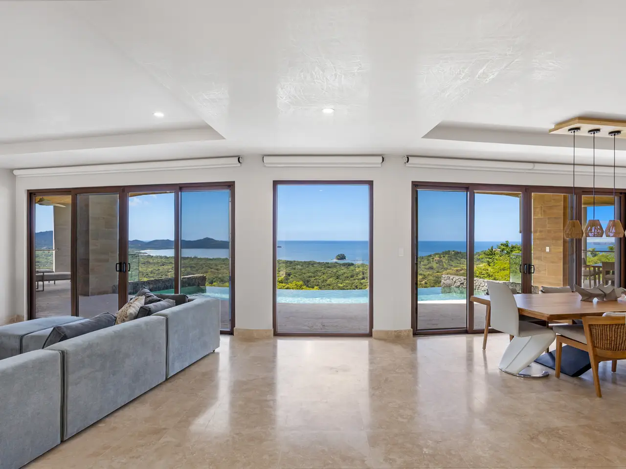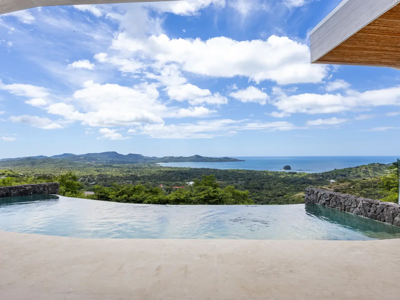 Welcome to Casa Manta Ray, a beautiful brand new luxury 6165 sq ft home with breathtaking ocean views, located at the top of the gated Miramar neighborhood in Mar Vista, Playa Flamingo. This exceptional property was designed and built by the famous Costa Rican architect José Mora. This special home has a shape that resembles a manta ray and offers many unique architectural features and includes curated, large, original paintings by José Mora throughout the home. There are travertine floors and walls throughout, venetian stucco walls and ceilings, locally hand-crafted melina wood furniture, custom artwork, and full walls of glass facing the Pacific Ocean. Upon entering through the huge wooden door, you are greeted by a bright and airy open living area. This layout boasts a neutral color palette with abundant natural light as the back of the house is all glass that frames captivating ocean views and opens up to the covered outdoor space. An expansive 12-seater sectional sofa invites you to unwind, while a custom-built entertainment center, with natural wood accents, complements the room's elegant, minimalist decor. Amid the area, decor accentuates splashes of ocean colors. The dining and kitchen areas are perfect for entertaining. The dining table, made of local hardwood, is surrounded by modern chairs and sits under a unique light fixture. The kitchen is sleek and functional, with plenty of light wood cabinets, a spacious island with seating, and top-quality stainless steel appliances, ideal for cooking and gathering. Casa Manta Ray features four spacious bedrooms, each with its en-suite bathroom; plus a convenient half bath, providing ample comfort and privacy for family and guests. The downstairs bedrooms are the guest bedrooms and offer queen beds. The top floor offers 2 master bedrooms, each with custom king wood beds, beautiful artwork done by José Mora, massive walk-through closets with seated vanities and mirrors, and patio doors to an upstairs balcony offering luxurious and relaxing seating. The ensuite bathrooms have travertine floors and walls, unique stone sinks, wrap-around quartz countertops, and massive ceiling rain showers which include windows that have incredible ocean views. Another architectural highlight of Casa Manta Ray is its grand staircase, which rises gracefully under soaring ceilings and is framed by large windows overlooking the lush, green surroundings. At the landing on the second floor, a unique, oversized window creates a breathtaking "aquarium effect," offering an uninterrupted view of the surrounding landscape that feels as if you’re immersed in nature. Casa Manta Ray’s outdoor areas are perfect for both relaxing and entertaining. The spacious terrace includes an outdoor kitchen with a built-in grill, prep area, and dining space, ideal for enjoying meals with family and friends. Next to the dining area, the infinity poolside lounge offers cozy seating and stunning ocean views, creating an inviting space to unwind. The sparkling curved infinity pool is perfect for a refreshing dip, surrounded by ample space for lounging and taking in the beautiful scenery. As a bonus, there are solar panels on this home! The Miramar neighborhood, located within the Mar Vista community in Playa Flamingo, combines luxury with natural beauty. Known for its amazing ocean views, gated security, and peaceful setting, Miramar is ideal for those seeking privacy and an active lifestyle in one of Guanacaste's top areas. The Mar Vista community covers 750 acres and focuses on sustainability and preserving nature. Residents enjoy a range of amenities like a gym, tennis and pickleball courts, hiking trails, and Gracia restaurant with an infinity pool and stunning ocean views. There is a private school at the entrance, making it a great choice for families. Nearby are the famous Playa Flamingo and Playa Conchal beaches, grocery stores, restaurants, medical facilities, and the new Flamingo Marina. Ready to make Casa Manta Ray your own? Contact us today to schedule a viewing and experience the beauty and serenity of this incredible property firsthand. Don’t miss the chance to live in your dream home in Playa Flamingo!