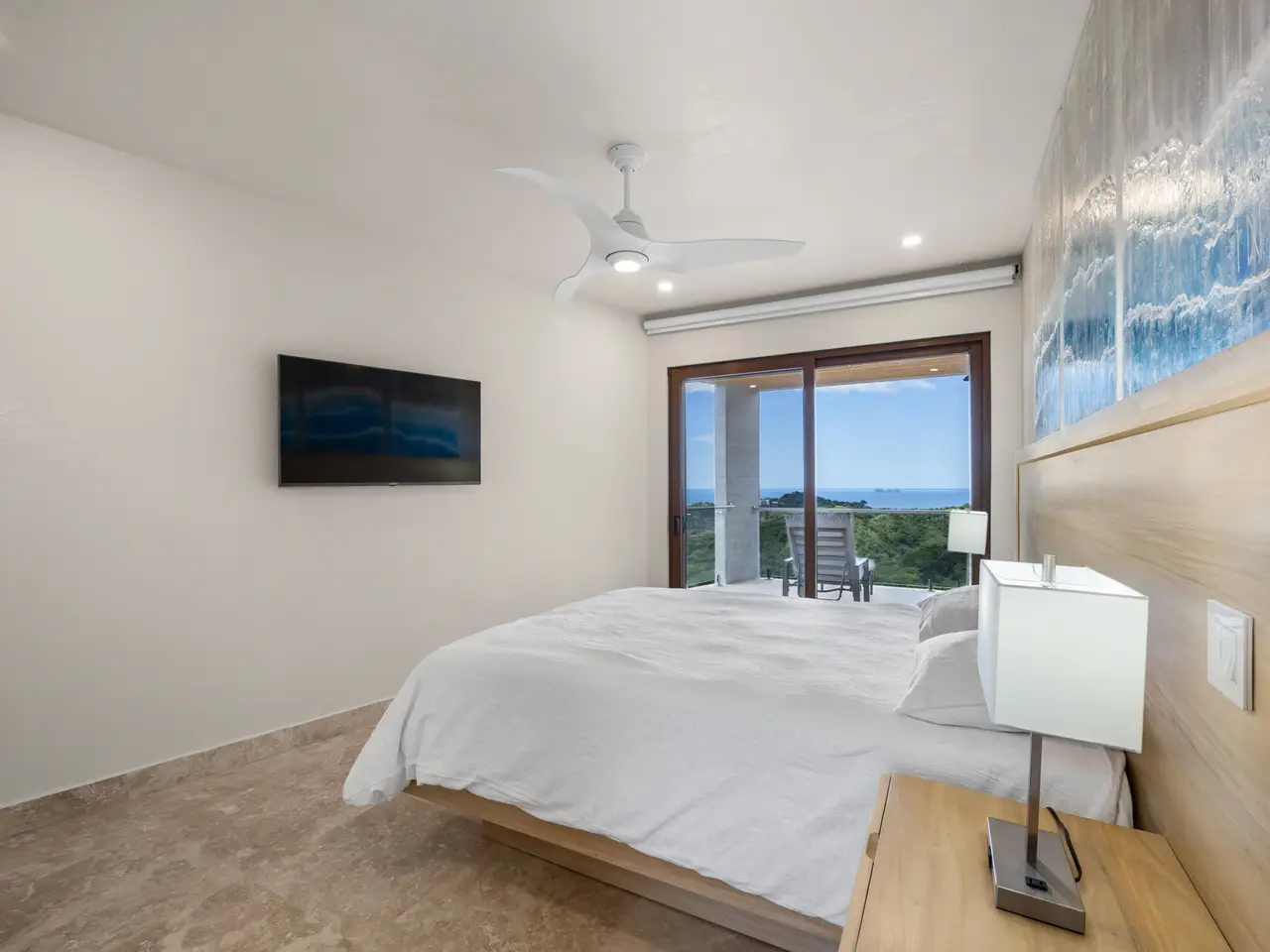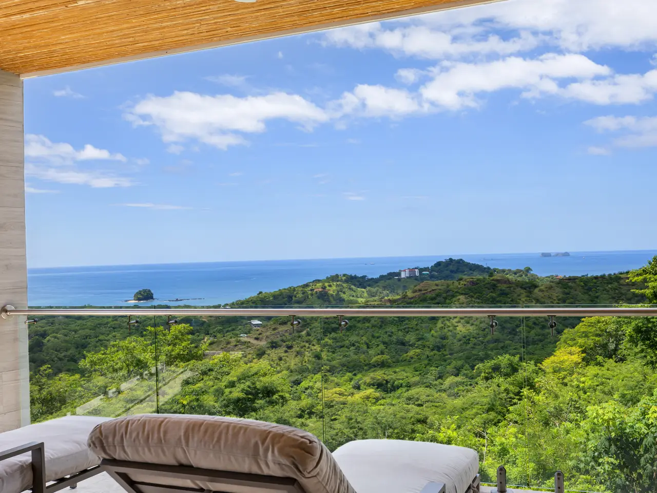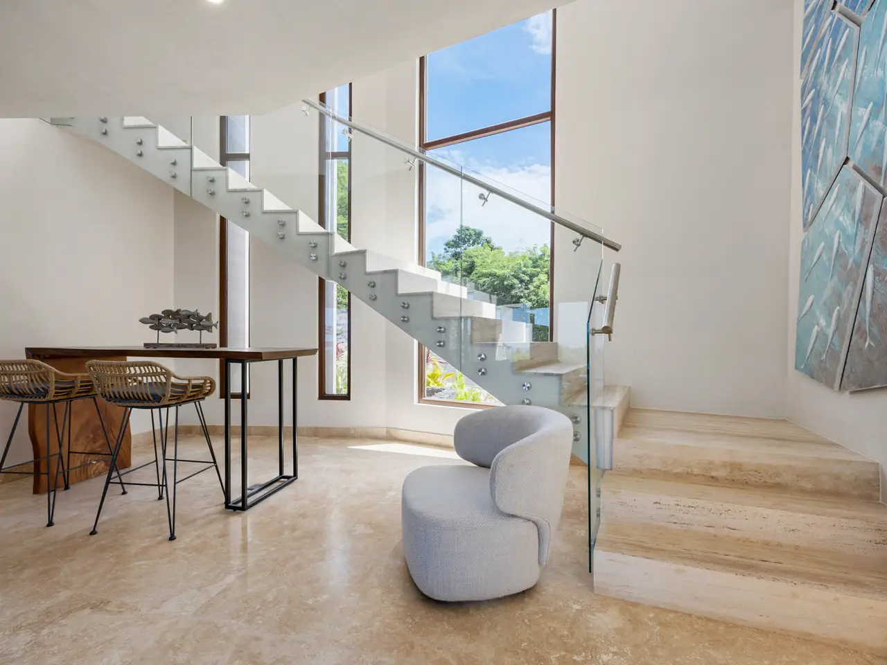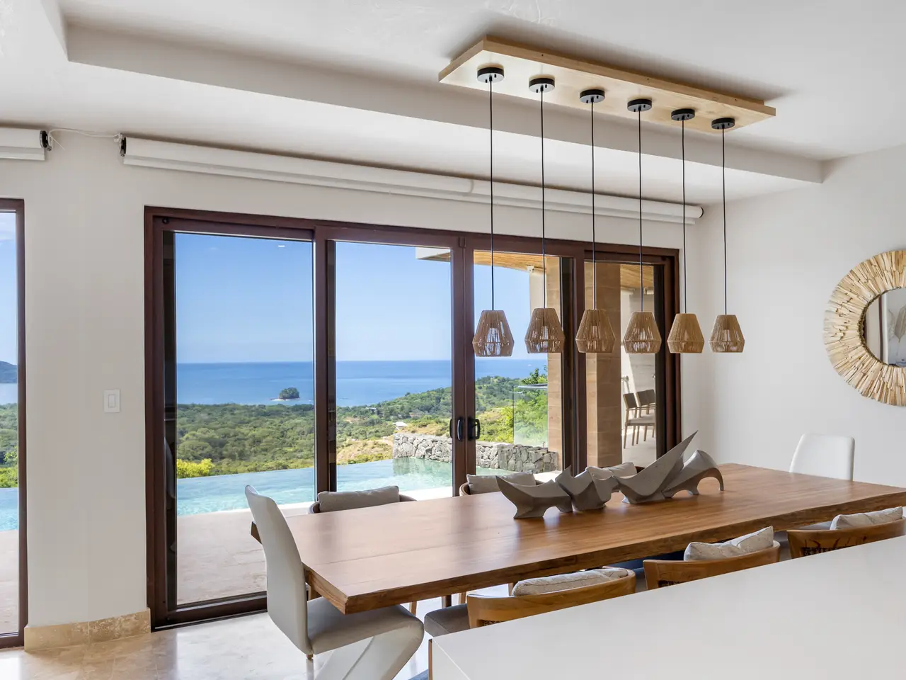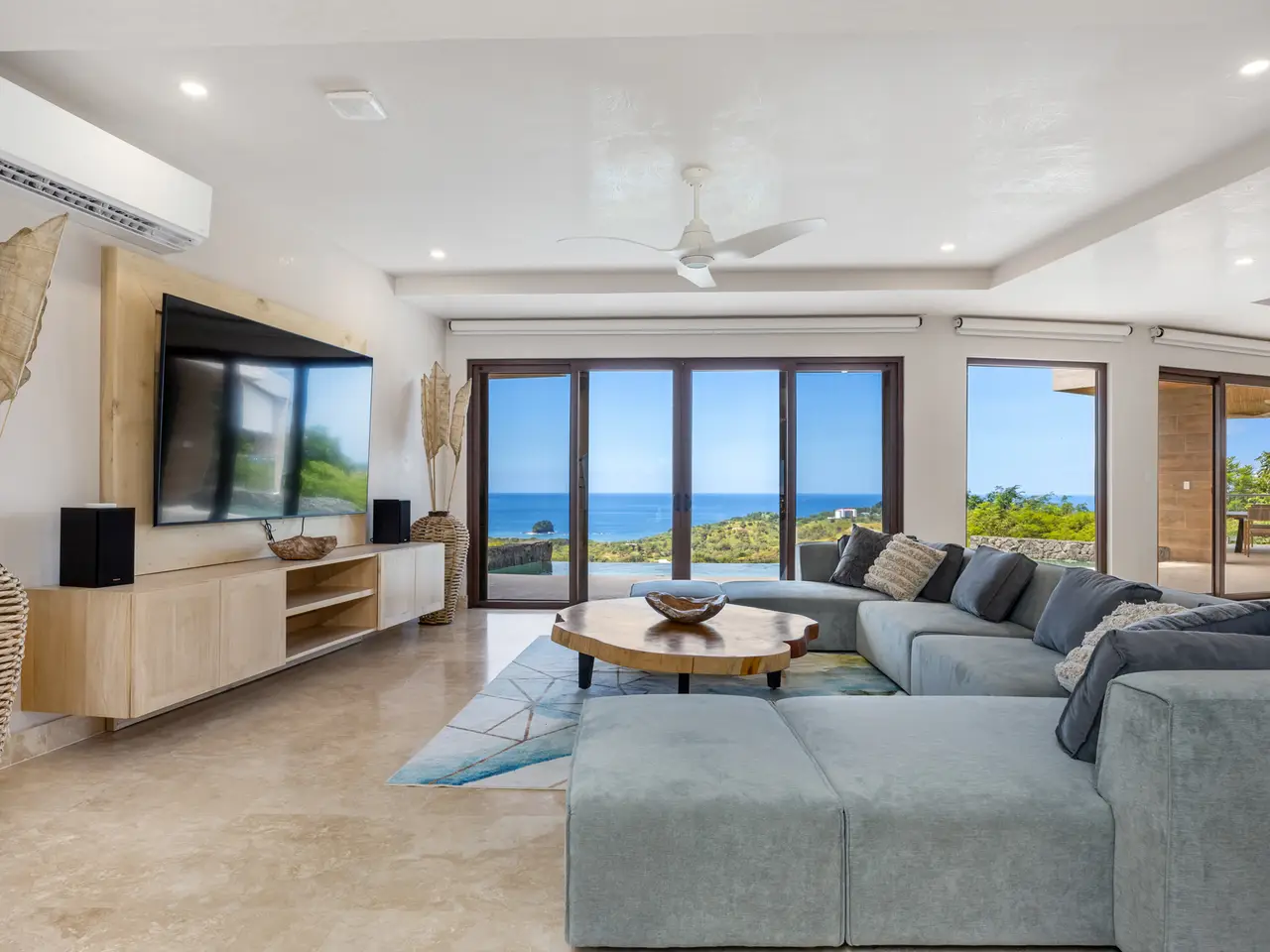 Welcome to Casa Manta Ray, a beautiful brand new luxury 6165 sq ft home with breathtaking ocean views, located at the top of the gated Miramar neighborhood in Mar Vista, Playa Flamingo. This exceptional property was designed and built by the famous Costa Rican architect José Mora. This special home has a shape that resembles a manta ray and offers many unique architectural features and includes curated, large, original paintings by José Mora throughout the home. There are travertine floors and walls throughout, venetian stucco walls and ceilings, locally hand-crafted melina wood furniture, custom artwork, and full walls of glass facing the Pacific Ocean. Upon entering through the huge wooden door, you are greeted by a bright and airy open living area. This layout boasts a neutral color palette with abundant natural light as the back of the house is all glass that frames captivating ocean views and opens up to the covered outdoor space. An expansive 12-seater sectional sofa invites you to unwind, while a custom-built entertainment center, with natural wood accents, complements the room's elegant, minimalist decor. Amid the area, decor accentuates splashes of ocean colors. The dining and kitchen areas are perfect for entertaining. The dining table, made of local hardwood, is surrounded by modern chairs and sits under a unique light fixture. The kitchen is sleek and functional, with plenty of light wood cabinets, a spacious island with seating, and top-quality stainless steel appliances, ideal for cooking and gathering. Casa Manta Ray features four spacious bedrooms, each with its en-suite bathroom; plus a convenient half bath, providing ample comfort and privacy for family and guests. The downstairs bedrooms are the guest bedrooms and offer queen beds. The top floor offers 2 master bedrooms, each with custom king wood beds, beautiful artwork done by José Mora, massive walk-through closets with seated vanities and mirrors, and patio doors to an upstairs balcony offering luxurious and relaxing seating. The ensuite bathrooms have travertine floors and walls, unique stone sinks, wrap-around quartz countertops, and massive ceiling rain showers which include windows that have incredible ocean views. Another architectural highlight of Casa Manta Ray is its grand staircase, which rises gracefully under soaring ceilings and is framed by large windows overlooking the lush, green surroundings. At the landing on the second floor, a unique, oversized window creates a breathtaking "aquarium effect," offering an uninterrupted view of the surrounding landscape that feels as if you’re immersed in nature. Casa Manta Ray’s outdoor areas are perfect for both relaxing and entertaining. The spacious terrace includes an outdoor kitchen with a built-in grill, prep area, and dining space, ideal for enjoying meals with family and friends. Next to the dining area, the infinity poolside lounge offers cozy seating and stunning ocean views, creating an inviting space to unwind. The sparkling curved infinity pool is perfect for a refreshing dip, surrounded by ample space for lounging and taking in the beautiful scenery. As a bonus, there are solar panels on this home! The Miramar neighborhood, located within the Mar Vista community in Playa Flamingo, combines luxury with natural beauty. Known for its amazing ocean views, gated security, and peaceful setting, Miramar is ideal for those seeking privacy and an active lifestyle in one of Guanacaste's top areas. The Mar Vista community covers 750 acres and focuses on sustainability and preserving nature. Residents enjoy a range of amenities like a gym, tennis and pickleball courts, hiking trails, and Gracia restaurant with an infinity pool and stunning ocean views. There is a private school at the entrance, making it a great choice for families. Nearby are the famous Playa Flamingo and Playa Conchal beaches, grocery stores, restaurants, medical facilities, and the new Flamingo Marina. Ready to make Casa Manta Ray your own? Contact us today to schedule a viewing and experience the beauty and serenity of this incredible property firsthand. Don’t miss the chance to live in your dream home in Playa Flamingo!