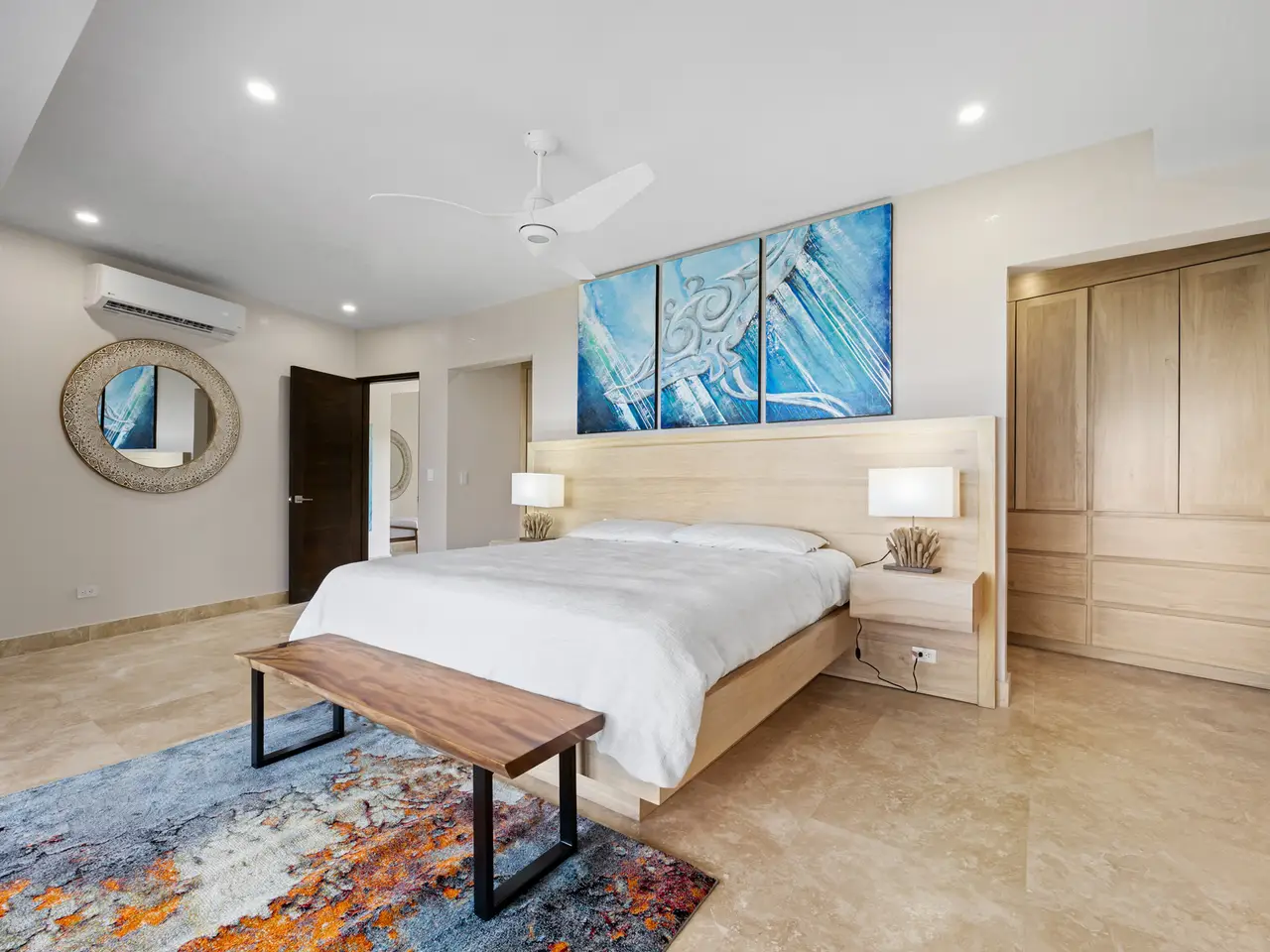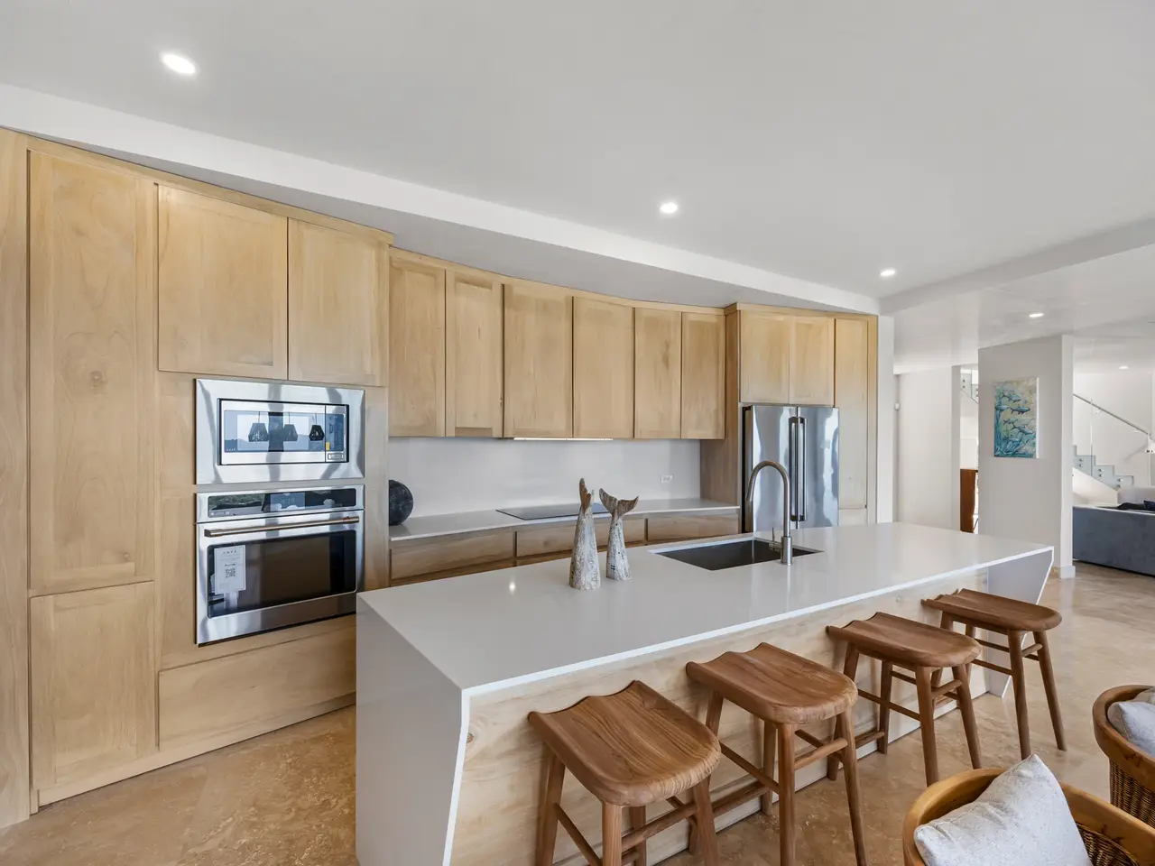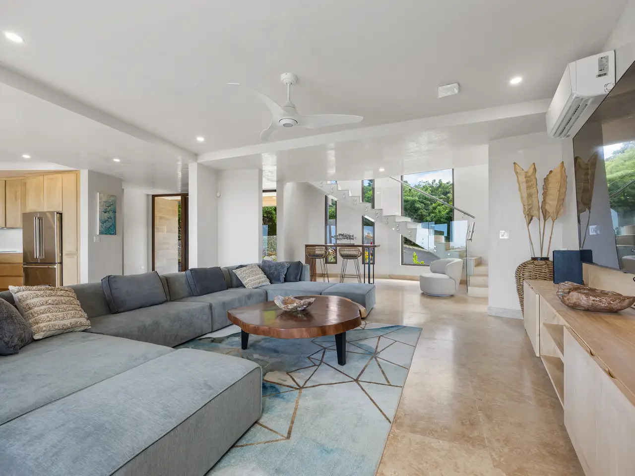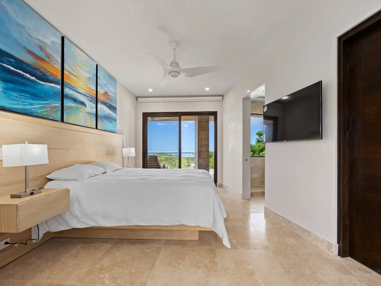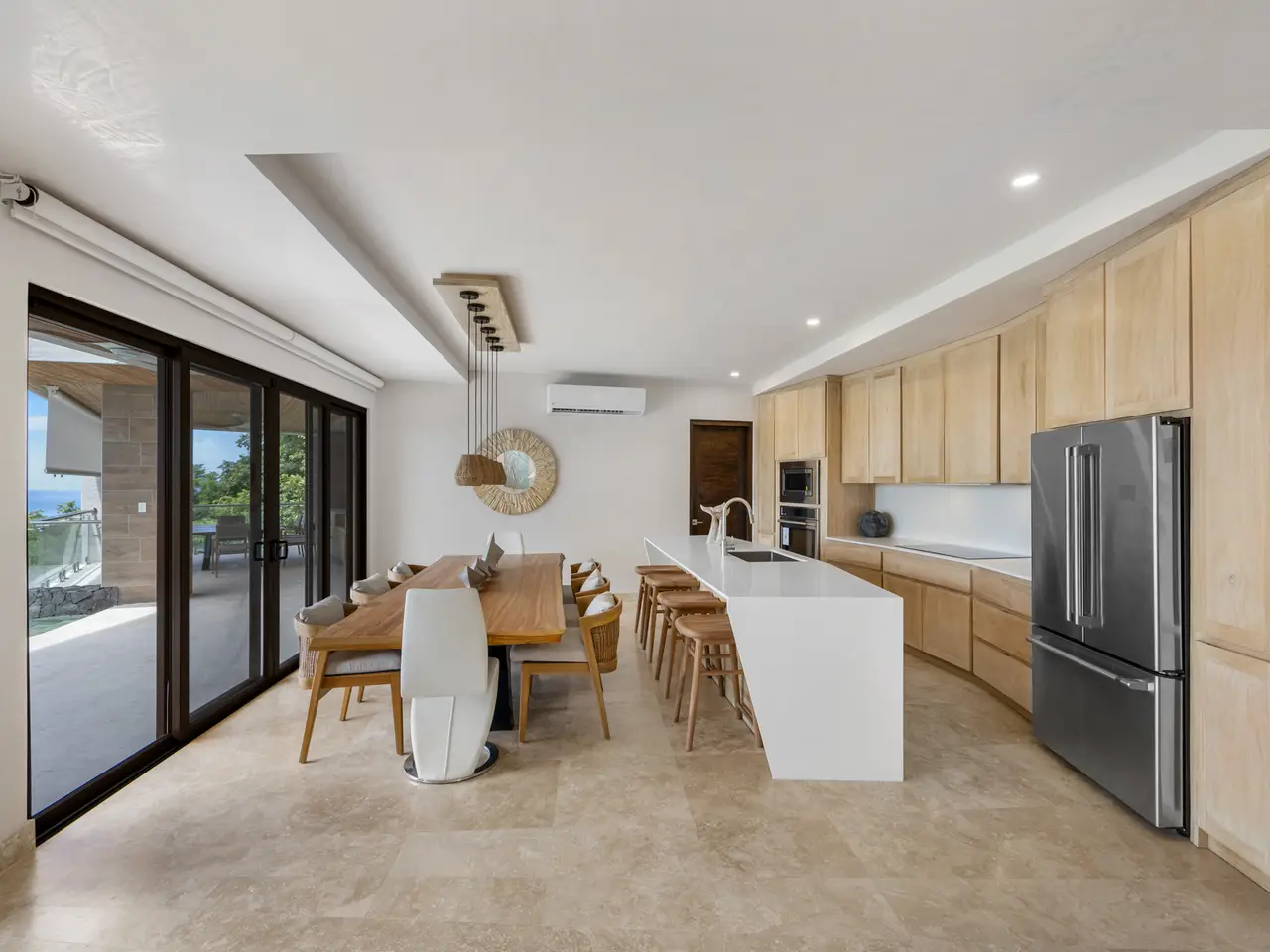 Welcome to Casa Manta Ray, a beautiful brand new luxury 6165 sq ft home with breathtaking ocean views, located at the top of the gated Miramar neighborhood in Mar Vista, Playa Flamingo. This exceptional property was designed and built by the famous Costa Rican architect José Mora. This special home has a shape that resembles a manta ray and offers many unique architectural features and includes curated, large, original paintings by José Mora throughout the home. There are travertine floors and walls throughout, venetian stucco walls and ceilings, locally hand-crafted melina wood furniture, custom artwork, and full walls of glass facing the Pacific Ocean. Upon entering through the huge wooden door, you are greeted by a bright and airy open living area. This layout boasts a neutral color palette with abundant natural light as the back of the house is all glass that frames captivating ocean views and opens up to the covered outdoor space. An expansive 12-seater sectional sofa invites you to unwind, while a custom-built entertainment center, with natural wood accents, complements the room's elegant, minimalist decor. Amid the area, decor accentuates splashes of ocean colors. The dining and kitchen areas are perfect for entertaining. The dining table, made of local hardwood, is surrounded by modern chairs and sits under a unique light fixture. The kitchen is sleek and functional, with plenty of light wood cabinets, a spacious island with seating, and top-quality stainless steel appliances, ideal for cooking and gathering. Casa Manta Ray features four spacious bedrooms, each with its en-suite bathroom; plus a convenient half bath, providing ample comfort and privacy for family and guests. The downstairs bedrooms are the guest bedrooms and offer queen beds. The top floor offers 2 master bedrooms, each with custom king wood beds, beautiful artwork done by José Mora, massive walk-through closets with seated vanities and mirrors, and patio doors to an upstairs balcony offering luxurious and relaxing seating. The ensuite bathrooms have travertine floors and walls, unique stone sinks, wrap-around quartz countertops, and massive ceiling rain showers which include windows that have incredible ocean views. Another architectural highlight of Casa Manta Ray is its grand staircase, which rises gracefully under soaring ceilings and is framed by large windows overlooking the lush, green surroundings. At the landing on the second floor, a unique, oversized window creates a breathtaking "aquarium effect," offering an uninterrupted view of the surrounding landscape that feels as if you’re immersed in nature. Casa Manta Ray’s outdoor areas are perfect for both relaxing and entertaining. The spacious terrace includes an outdoor kitchen with a built-in grill, prep area, and dining space, ideal for enjoying meals with family and friends. Next to the dining area, the infinity poolside lounge offers cozy seating and stunning ocean views, creating an inviting space to unwind. The sparkling curved infinity pool is perfect for a refreshing dip, surrounded by ample space for lounging and taking in the beautiful scenery. As a bonus, there are solar panels on this home! The Miramar neighborhood, located within the Mar Vista community in Playa Flamingo, combines luxury with natural beauty. Known for its amazing ocean views, gated security, and peaceful setting, Miramar is ideal for those seeking privacy and an active lifestyle in one of Guanacaste's top areas. The Mar Vista community covers 750 acres and focuses on sustainability and preserving nature. Residents enjoy a range of amenities like a gym, tennis and pickleball courts, hiking trails, and Gracia restaurant with an infinity pool and stunning ocean views. There is a private school at the entrance, making it a great choice for families. Nearby are the famous Playa Flamingo and Playa Conchal beaches, grocery stores, restaurants, medical facilities, and the new Flamingo Marina. Ready to make Casa Manta Ray your own? Contact us today to schedule a viewing and experience the beauty and serenity of this incredible property firsthand. Don’t miss the chance to live in your dream home in Playa Flamingo!