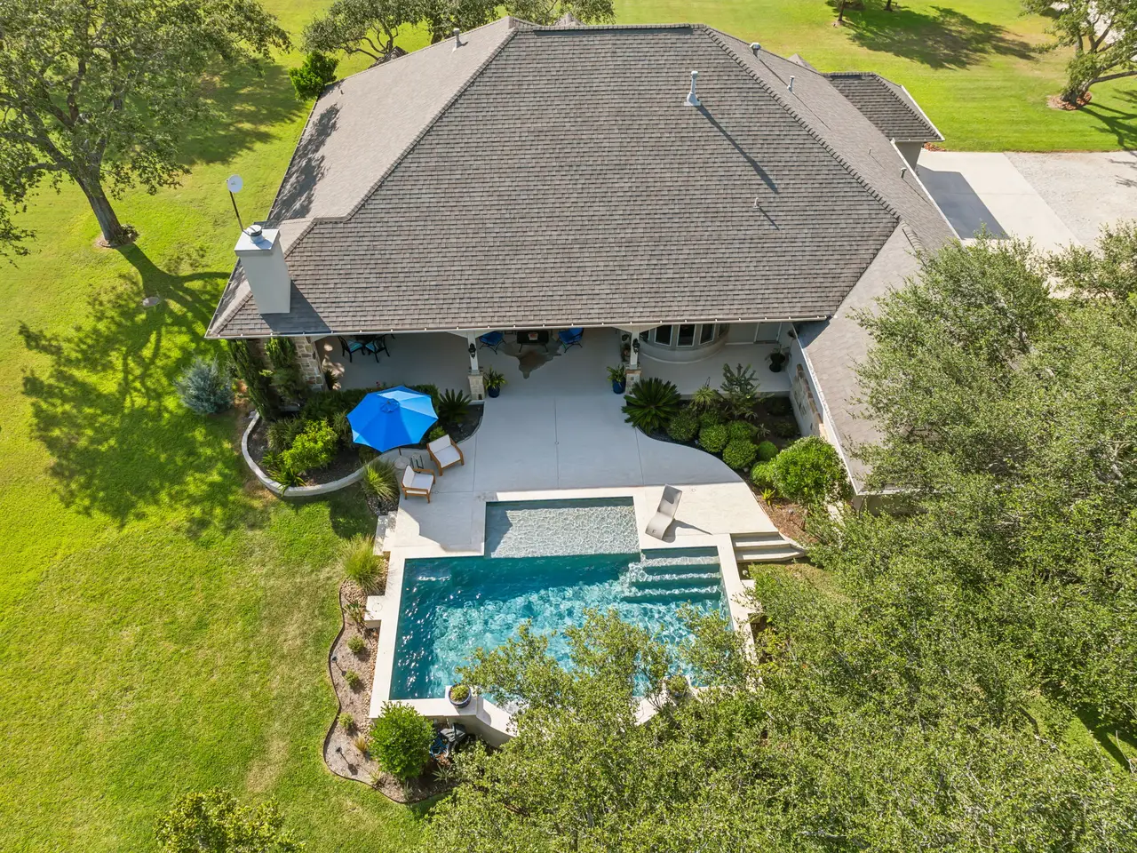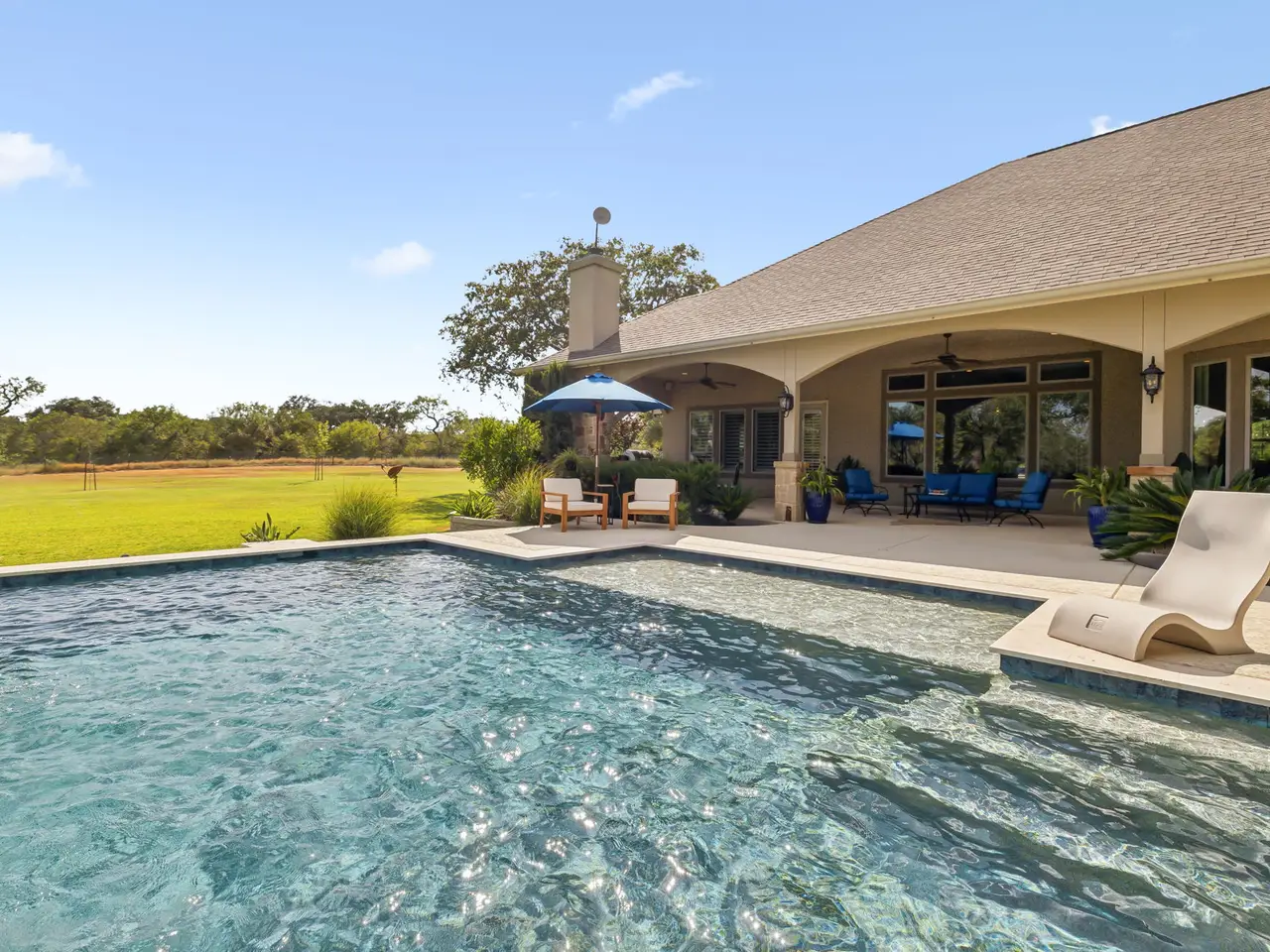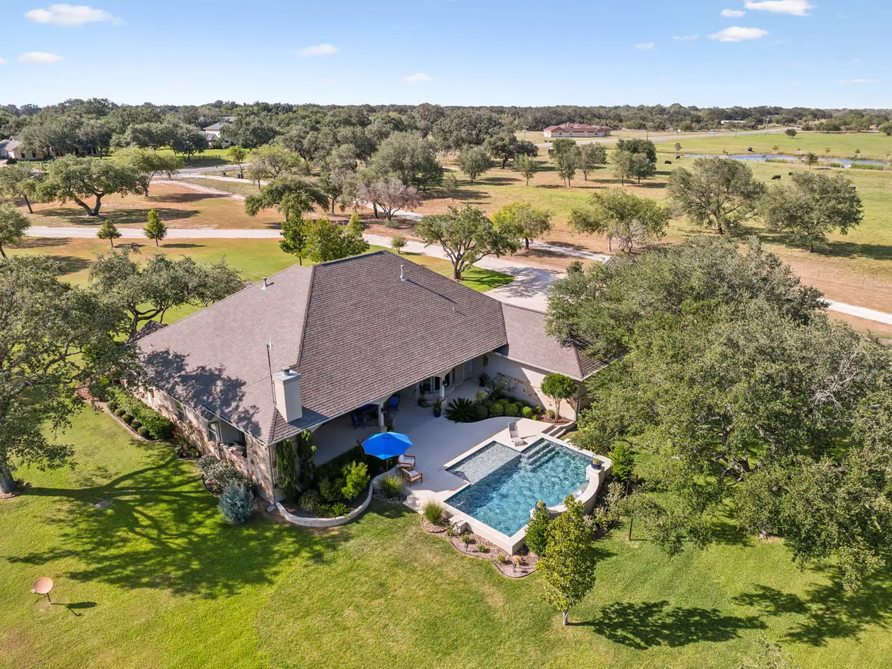 Luxury properties like this one don't become available very often, especially less than half an hour from downtown San Antonio. Welcome to your dream home nestled on 5 acres! This meticulously maintained paradise offers a single-story transitional custom home and a custom built workshop. The home features 3 bedrooms, 2 full bathrooms and 1 half bath, which has outdoor access to the sparkling pool and patio. Upon entry, you are greeted by a bright and open design with views of the pool through the seamless wall of windows. To the right is the home office/flex space with glass & wood French doors and views of the lushly landscaped front yard. As you enter into the living room, you are greeted with a wall of televisions for the ultimate entertainment experience, including surround sound speakers that extend to the primary bedroom and bath as well as the front and back patios: all controlled from the designated media closet. The fabulous open floorplan is perfect for entertaining family and friends. The gourmet island kitchen is a chef’s dream, complete with state-of-the-art JennAir appliances: 6 burner gas cook top, under counter microwave drawer, plus double wall ovens, dishwasher, and refrigerator in the open concept butler's kitchen and a walk-in pantry. The breakfast area offers plenty of space for casual dining or adding a more formal touch with the coffee/wine bar and mini wine refrigerator. The peaceful primary suite enjoys outside access to the patio and pool and features a stunning bath with his and her walk-in closets, dual vanities, oversized walk-in shower that includes a rain shower system with body jets, walk-in linen closet, and custom drawers with leather granite counters (this space is plumbed for a garden tub). The separate guest wing offers two additional bedrooms and a magnificent bathroom with oversized dual vanity space. The laundry room has a farm sink, separate utility closet and plenty of space for an additional refrigerator. The garage entry space welcomes you with a catch-all custom cabinetry, wall of hooks and a bench. The residence also features a generous oversized two-car garage with separate bays and additional storage space. The custom workshop is approximately 1,200 square feet, fully insulated and plumbed for bathroom, with single car garage door, attached carport: can equip two cars, RV, boat, or lawn equipment. The resort-style backyard is a serene oasis complete with gorgeous pool (built in late 2023), wood burning fireplace, and outdoor kitchen: Bull gas grill, sink and mini refrigerator. It's perfect for hosting and enjoying the evenings under the big Texas starlit sky. The property is professionally landscaped, including a sprinkler system that extends approximately 1 1/2 acres and drip irrigation for all the flower beds, filled with a variety of oak trees and highlighted by professional lighting. The property has its own water well, in addition to access to the co-op water supply system. It is secured by an automatic custom iron gate, surrounded by five-row barbwire fencing and overlayed with ranch fencing. With the convenience of being just a few minutes from both IH-37 and US Hwy 281 and less than 30 minutes to downtown San Antonio, this is your opportunity to make this exceptional property your home!