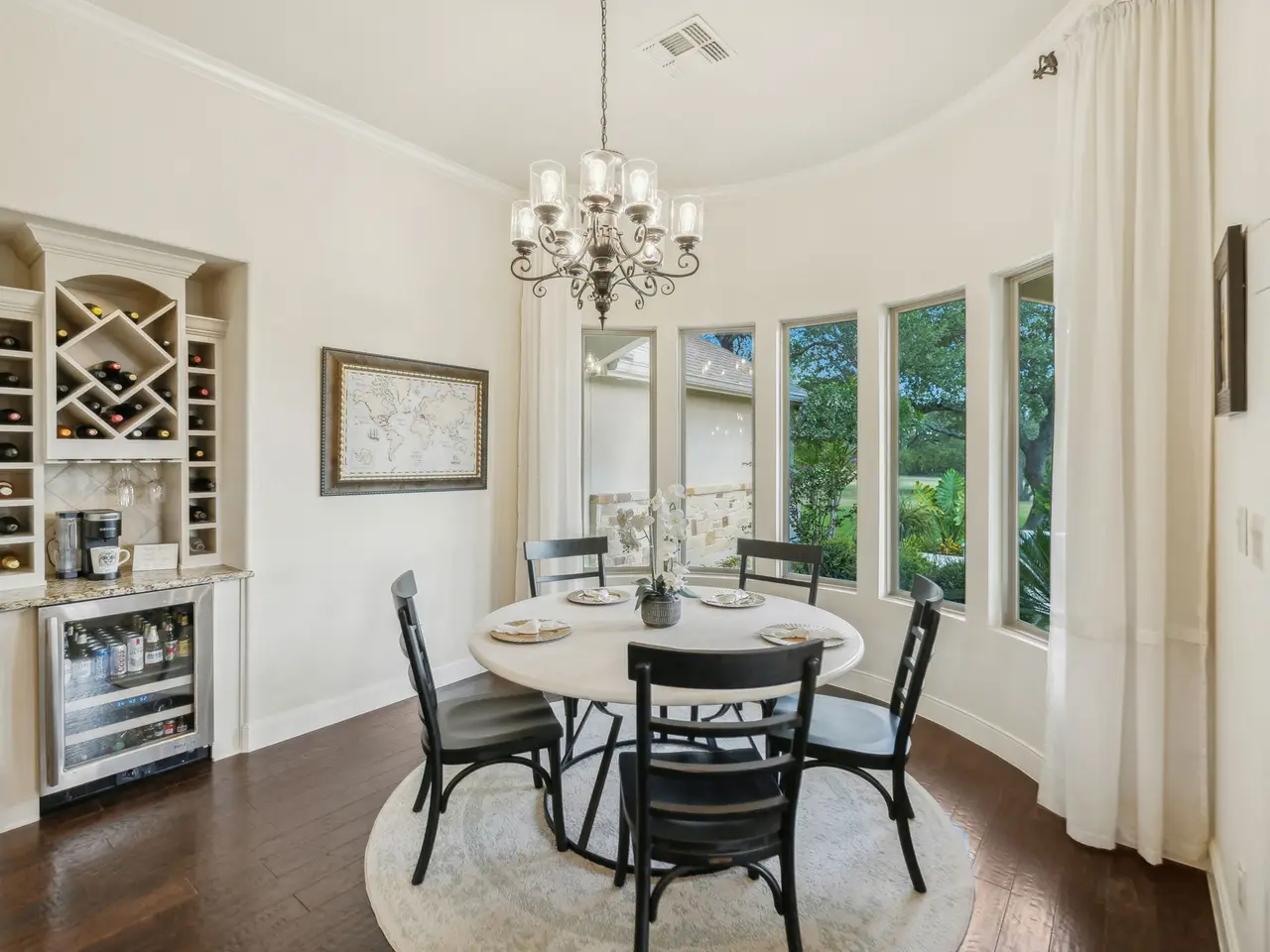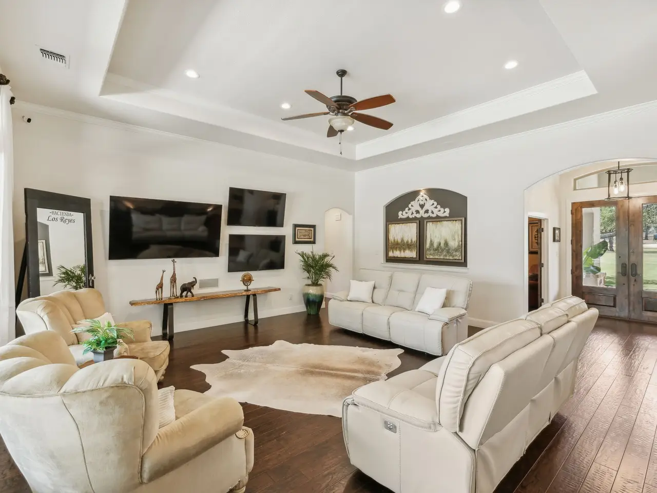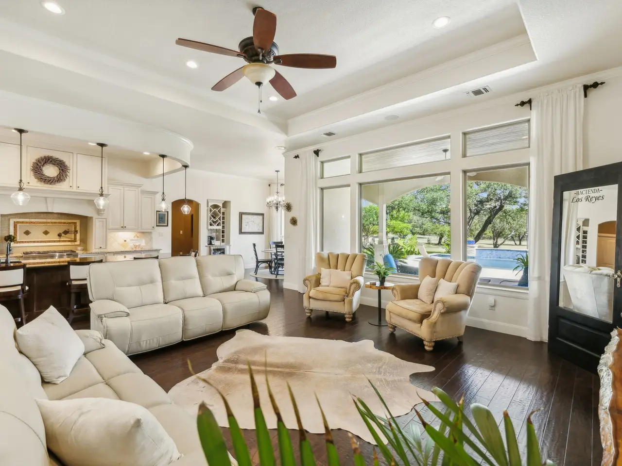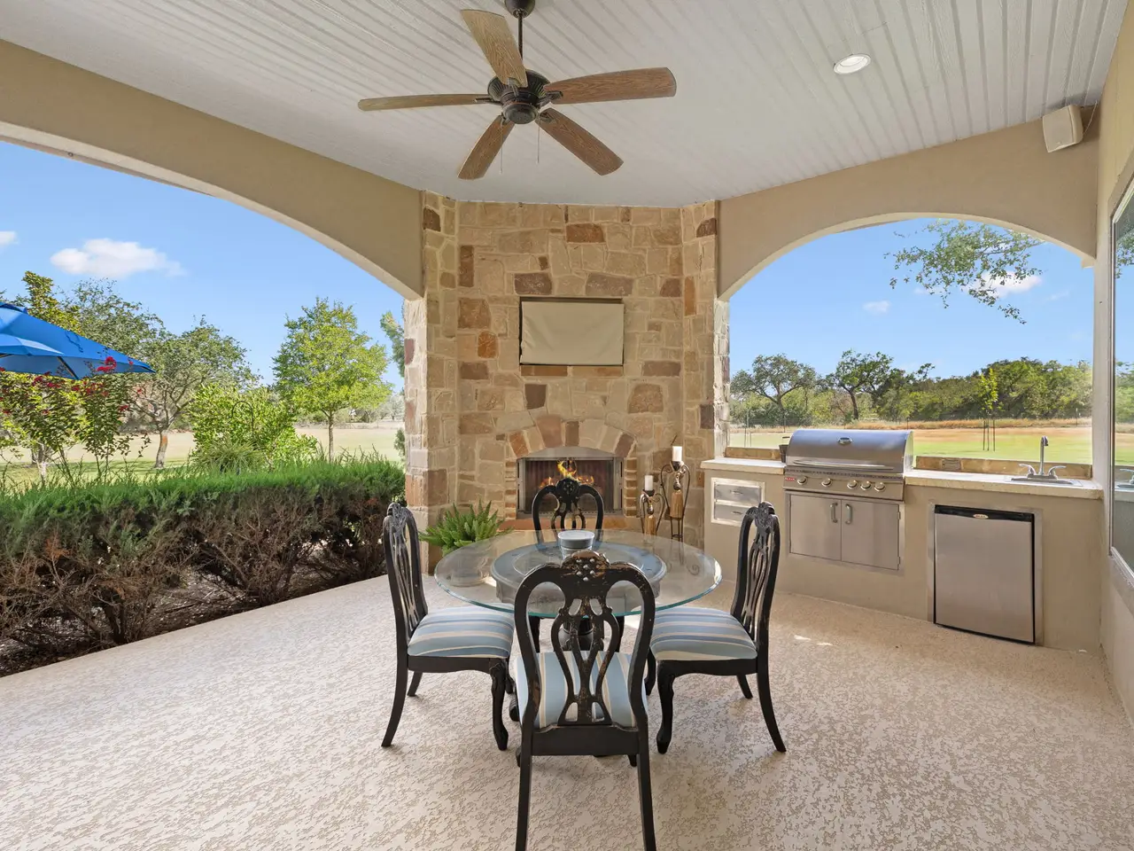 Luxury properties like this one don't become available very often, especially less than half an hour from downtown San Antonio. Welcome to your dream home nestled on 5 acres! This meticulously maintained paradise offers a single-story transitional custom home and a custom built workshop. The home features 3 bedrooms, 2 full bathrooms and 1 half bath, which has outdoor access to the sparkling pool and patio. Upon entry, you are greeted by a bright and open design with views of the pool through the seamless wall of windows. To the right is the home office/flex space with glass & wood French doors and views of the lushly landscaped front yard. As you enter into the living room, you are greeted with a wall of televisions for the ultimate entertainment experience, including surround sound speakers that extend to the primary bedroom and bath as well as the front and back patios: all controlled from the designated media closet. The fabulous open floorplan is perfect for entertaining family and friends. The gourmet island kitchen is a chef’s dream, complete with state-of-the-art JennAir appliances: 6 burner gas cook top, under counter microwave drawer, plus double wall ovens, dishwasher, and refrigerator in the open concept butler's kitchen and a walk-in pantry. The breakfast area offers plenty of space for casual dining or adding a more formal touch with the coffee/wine bar and mini wine refrigerator. The peaceful primary suite enjoys outside access to the patio and pool and features a stunning bath with his and her walk-in closets, dual vanities, oversized walk-in shower that includes a rain shower system with body jets, walk-in linen closet, and custom drawers with leather granite counters (this space is plumbed for a garden tub). The separate guest wing offers two additional bedrooms and a magnificent bathroom with oversized dual vanity space. The laundry room has a farm sink, separate utility closet and plenty of space for an additional refrigerator. The garage entry space welcomes you with a catch-all custom cabinetry, wall of hooks and a bench. The residence also features a generous oversized two-car garage with separate bays and additional storage space. The custom workshop is approximately 1,200 square feet, fully insulated and plumbed for bathroom, with single car garage door, attached carport: can equip two cars, RV, boat, or lawn equipment. The resort-style backyard is a serene oasis complete with gorgeous pool (built in late 2023), wood burning fireplace, and outdoor kitchen: Bull gas grill, sink and mini refrigerator. It's perfect for hosting and enjoying the evenings under the big Texas starlit sky. The property is professionally landscaped, including a sprinkler system that extends approximately 1 1/2 acres and drip irrigation for all the flower beds, filled with a variety of oak trees and highlighted by professional lighting. The property has its own water well, in addition to access to the co-op water supply system. It is secured by an automatic custom iron gate, surrounded by five-row barbwire fencing and overlayed with ranch fencing. With the convenience of being just a few minutes from both IH-37 and US Hwy 281 and less than 30 minutes to downtown San Antonio, this is your opportunity to make this exceptional property your home!