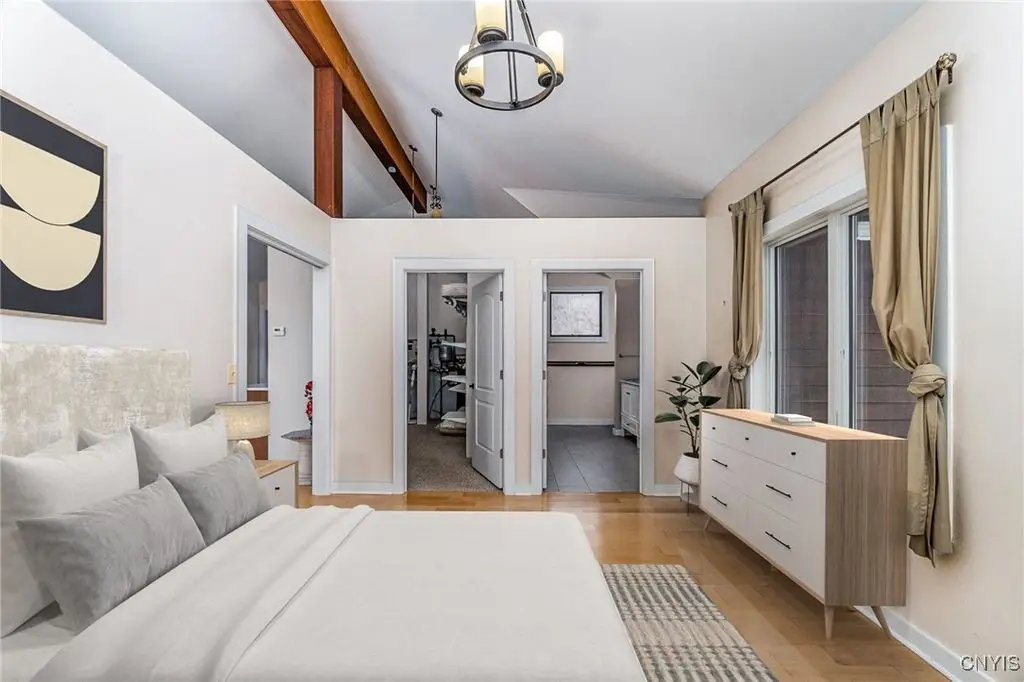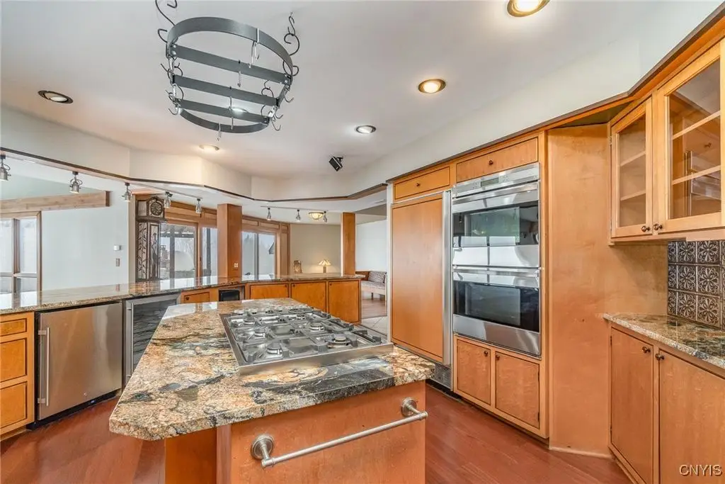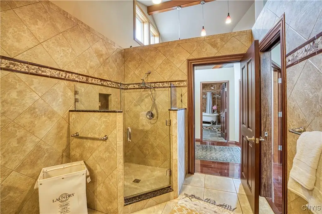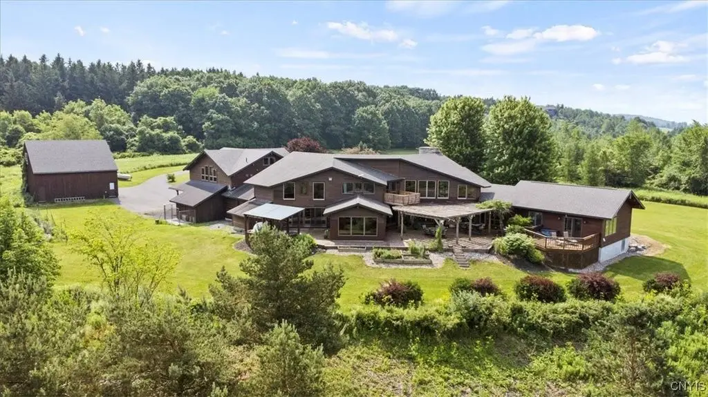 As a FEATURED HOUSE OF THE WEEK "LongView "is true to its name. This private gated property offers expansive and breathtaking views. Situated on over 12 acres of pristine land this resort level residence offers both luxury and tranquility all within minutes of the city center, hospitals and universities. On a clear day one sees Onondaga, Oneida lakes and Jamesville reservoir. The freshly painted first floor indoor living area boasts an open floor plan perfect for entertaining and embracing the warmth of the double-sided two-story fireplace, chef's dream kitchen, dining room and sitting room all overlooking the spectacular views. There is a separate living space for guests/in law apartment with its own private deck, living room, ensuite bedroom and kitchenette which account for the additional square footage. Another wing offers an ensuite bedroom and sports room completing the first floor. The outdoor living space includes a dome pizza oven, the Pine Tavern area that has hosted weddings and parties. A perfect retreat and place to unwind and soak in nature. The second floor primary suite has another stunning double sided stone fireplace and resort like bath and changing room. A balcony off the primary suites allows you to step outside to embrace the mornings or toast the sunset vistas. Each of the two additional bedrooms upstairs have spa like en suite bathrooms. An office/nursery connects the primary suite to the additional bedrooms with a staircase to the first floor. There is a sports room with shower off the three car garage and another two story garage/barn for your vehicles "LongView is not just a home; it's a lifestyle. Experience the serenity and the vistas of LongView- a place where every view speaks to you.
