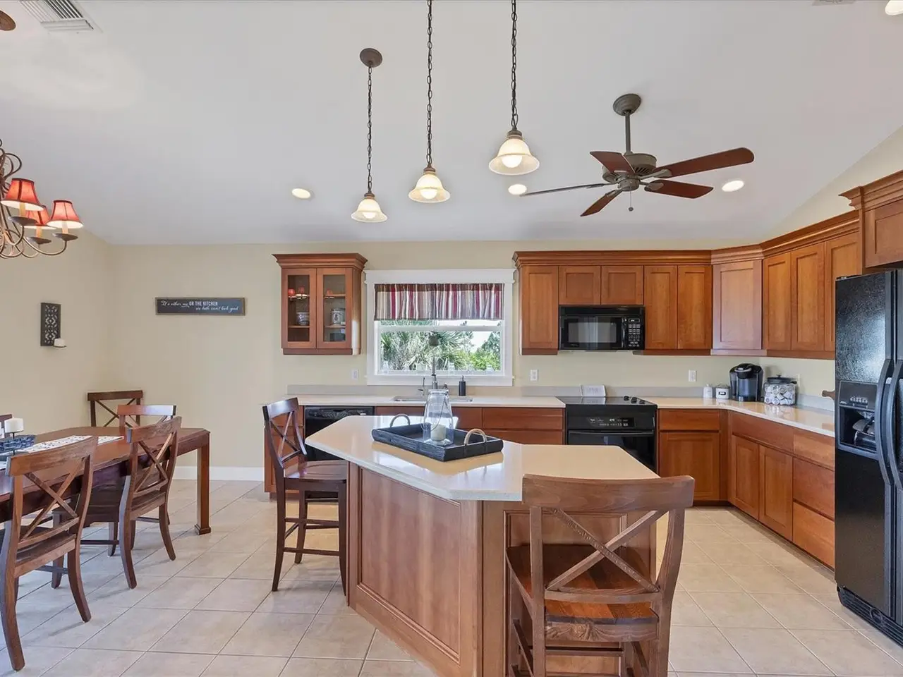 Spacious kitchen with warm wood cabinetry and pantry