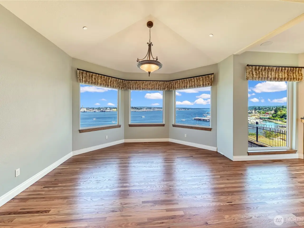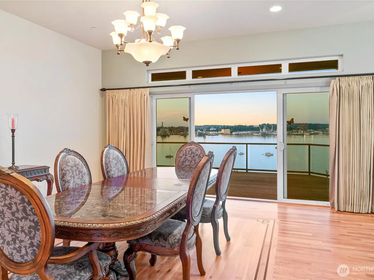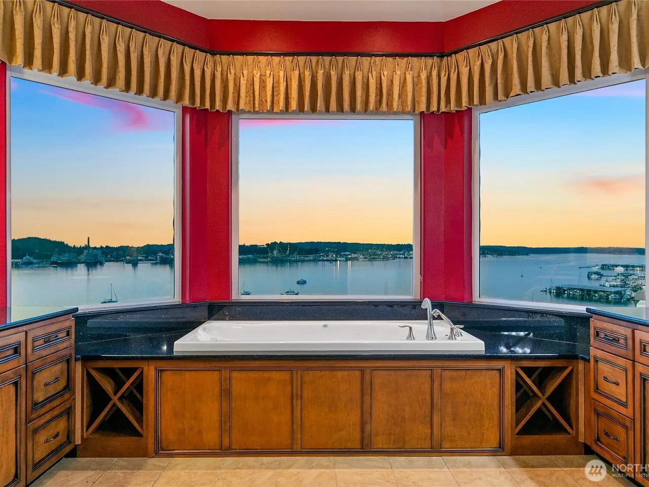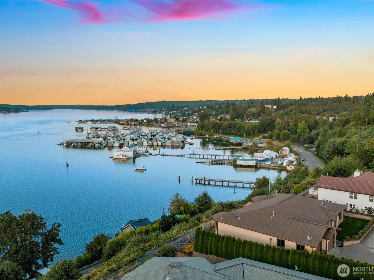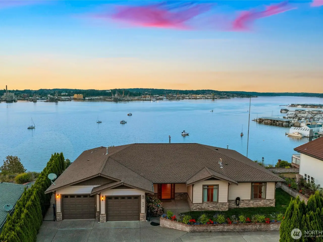 Experience unparalleled luxury in this beautiful view home overlooking Sinclair Inlet. Unobstructed panoramic views of the Puget Sound Naval Shipyard and breathtaking water views fill every room of this 5360sqft estate. Step inside the high ceiling grand entry and bast in the abundant natural lighting. Hand laid hardwood floors walk you throughout this exquisite home, with gourmet chef's kitchen, two master suites, and a leisure area with full service wet bar. This main-level-living home hosts 4 full bedrooms and 4 bathrooms. Additionally, the walkout lower-level leads to an expansive private patio. This home is perfectly designed for both sophisticated entertaining and serene relaxation. Experience this must view property today!