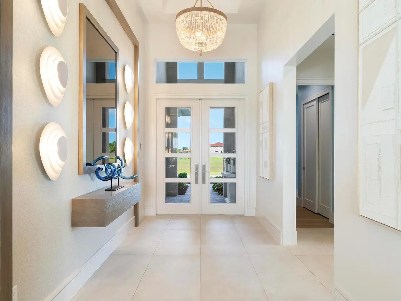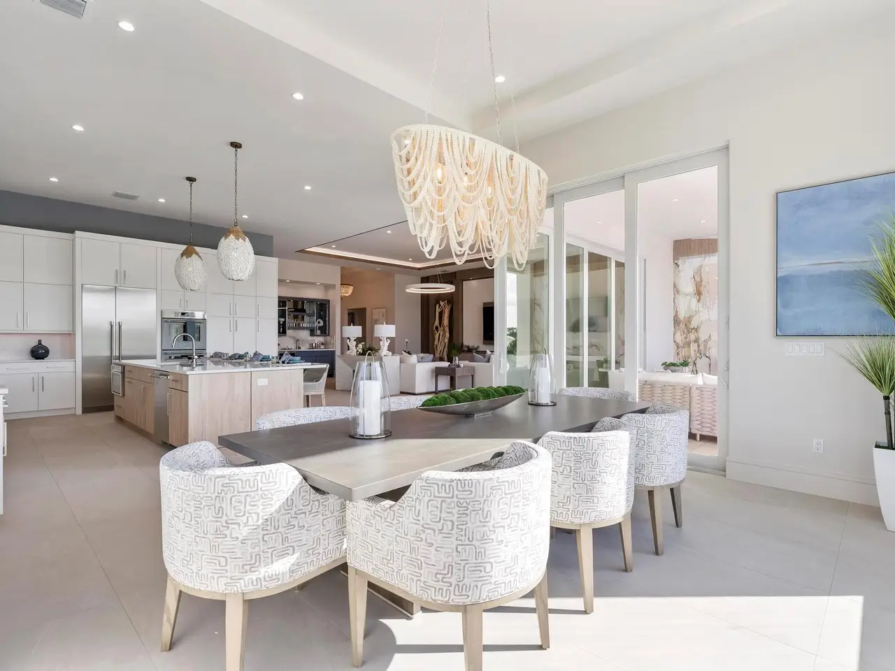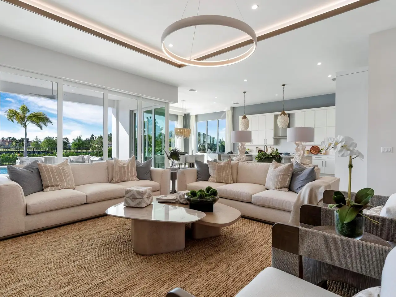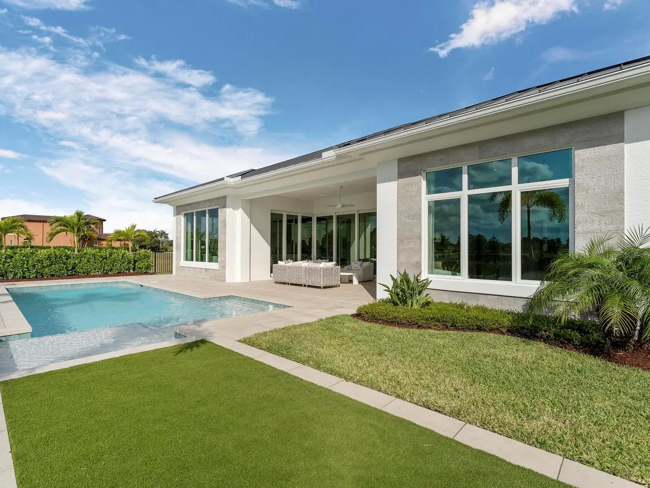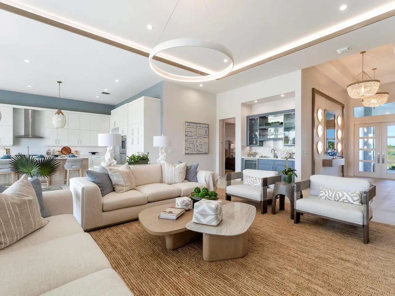 As you enter the gates of Tesoro, you are welcomed into a realm of luxury living. Elevate your lifestyle with a beautifully appointed model home from Ecclestone Signature Homes, featuring breathtaking views of the golf course and serene water. This residence offers three bedrooms, along with a den or flexible space, and is adorned with high-quality upgrades and finishes. The Coastal Modern Design promotes an open-concept layout with soaring ceilings, creating an ideal environment for entertaining. A spacious patio, complete with a custom-built TV wall, enhances outdoor living. With impact windows and doors throughout, homeownership is effortless. This residence has been meticulously decorated by one of South Florida's most esteemed designers, making it a true turnkey opportunity.