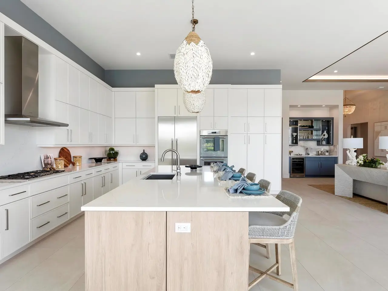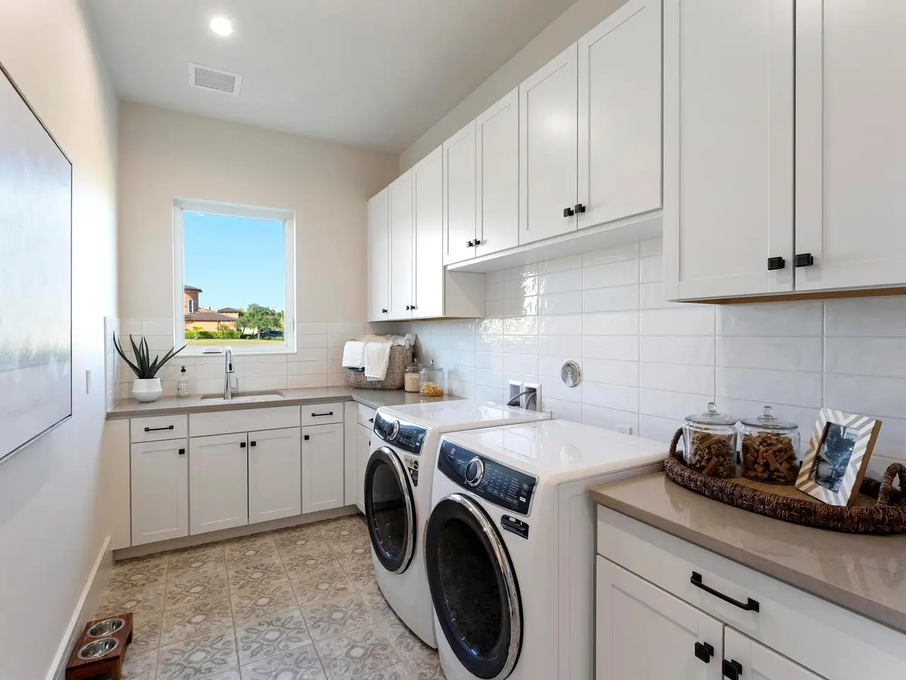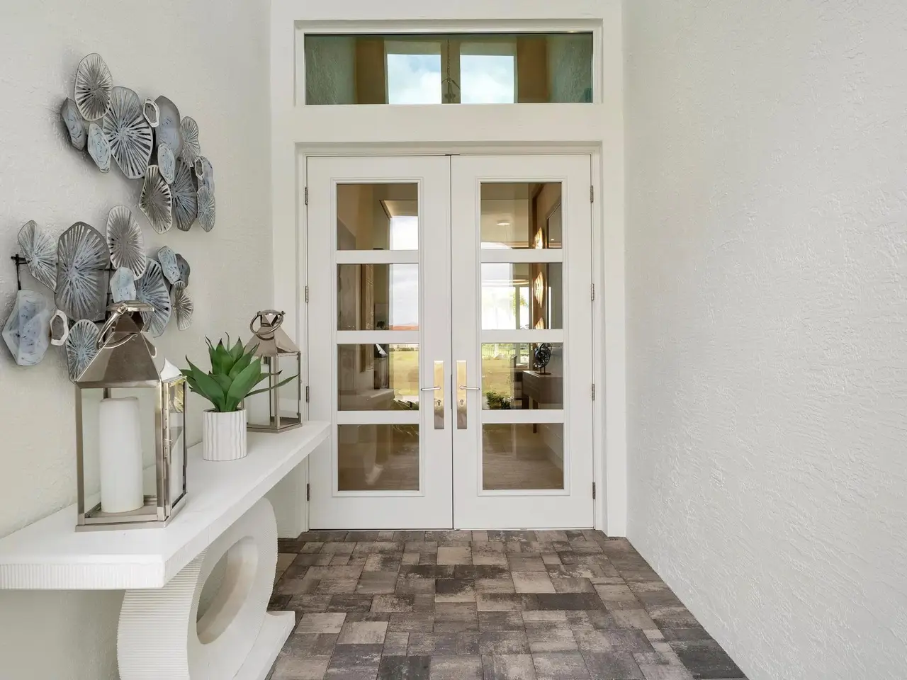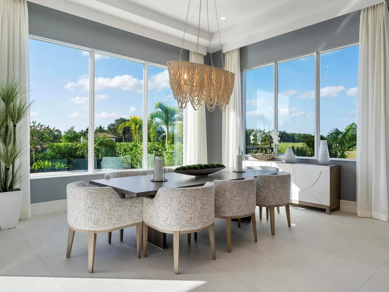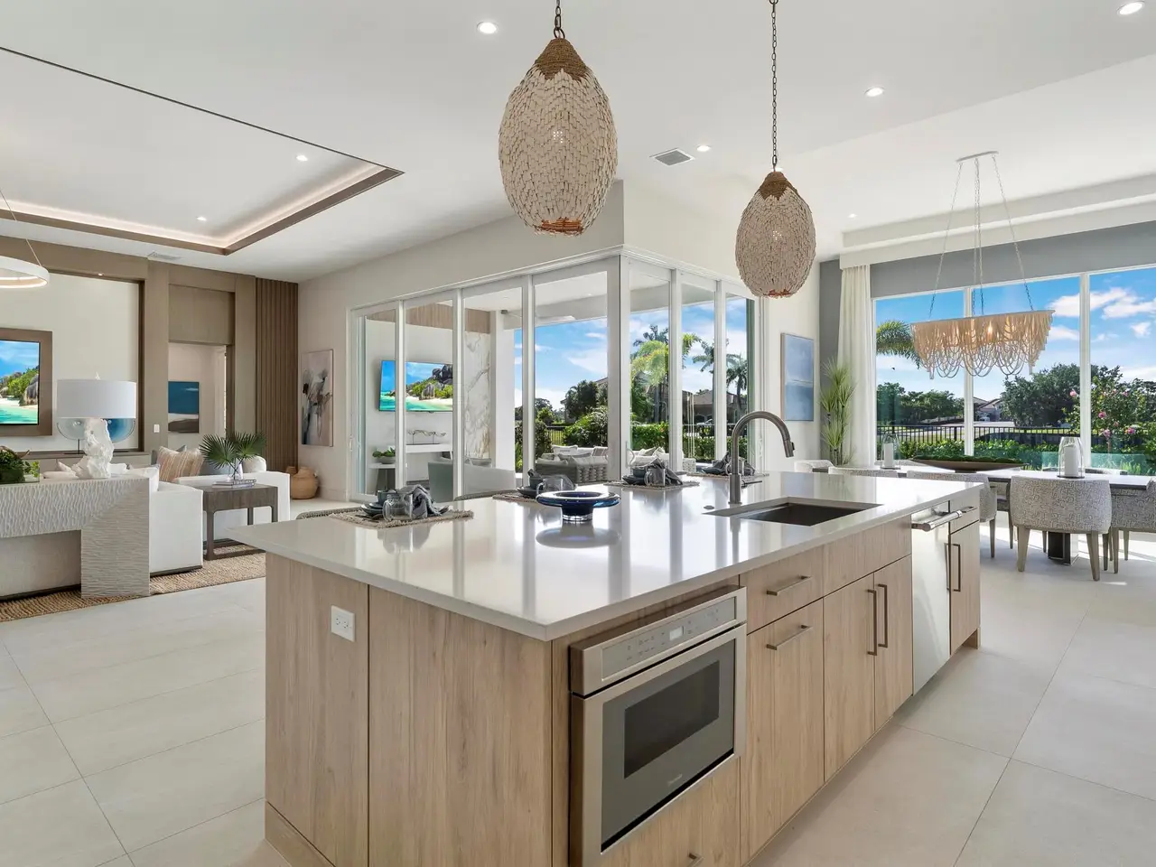 As you enter the gates of Tesoro, you are welcomed into a realm of luxury living. Elevate your lifestyle with a beautifully appointed model home from Ecclestone Signature Homes, featuring breathtaking views of the golf course and serene water. This residence offers three bedrooms, along with a den or flexible space, and is adorned with high-quality upgrades and finishes. The Coastal Modern Design promotes an open-concept layout with soaring ceilings, creating an ideal environment for entertaining. A spacious patio, complete with a custom-built TV wall, enhances outdoor living. With impact windows and doors throughout, homeownership is effortless. This residence has been meticulously decorated by one of South Florida's most esteemed designers, making it a true turnkey opportunity.