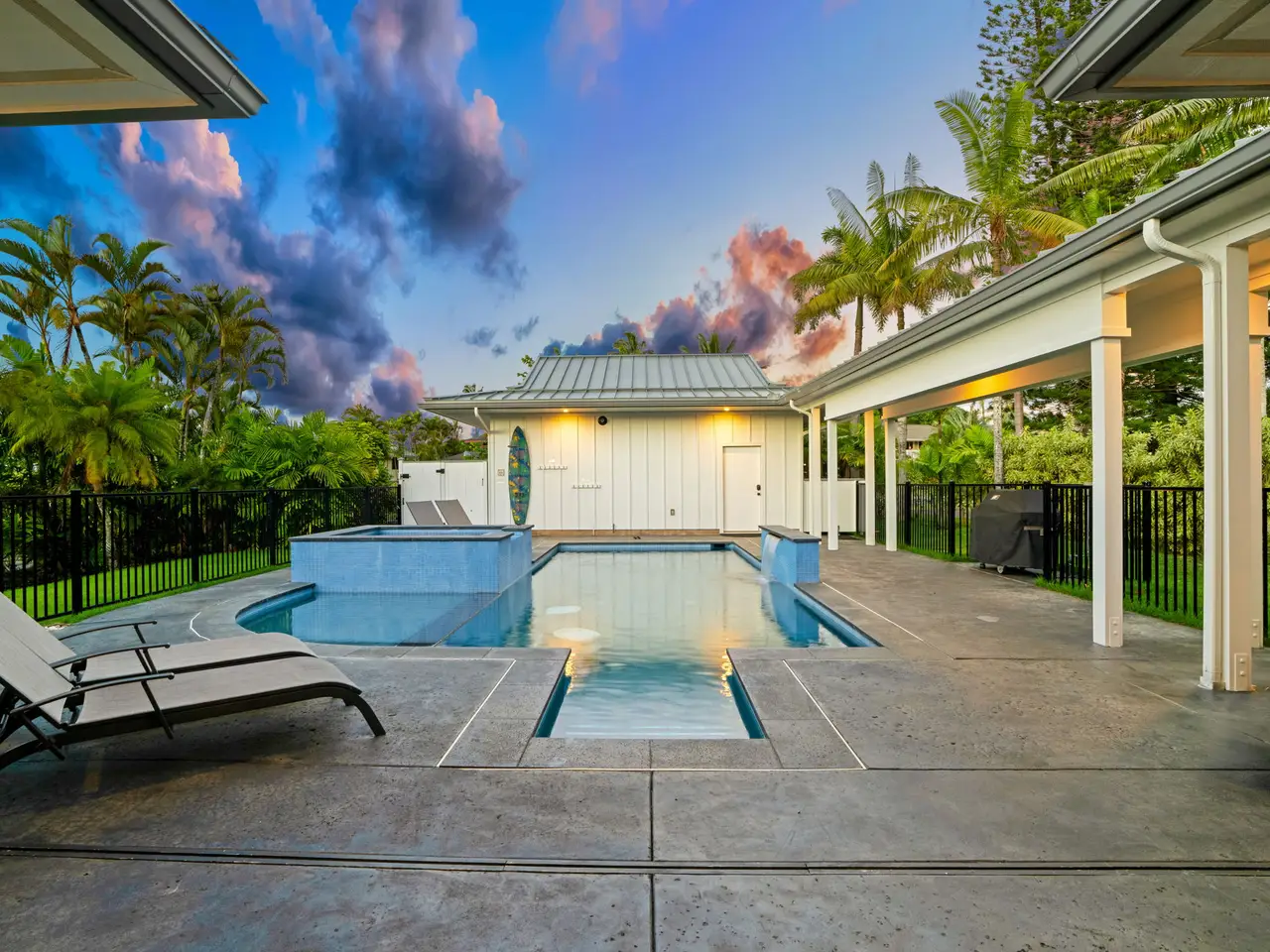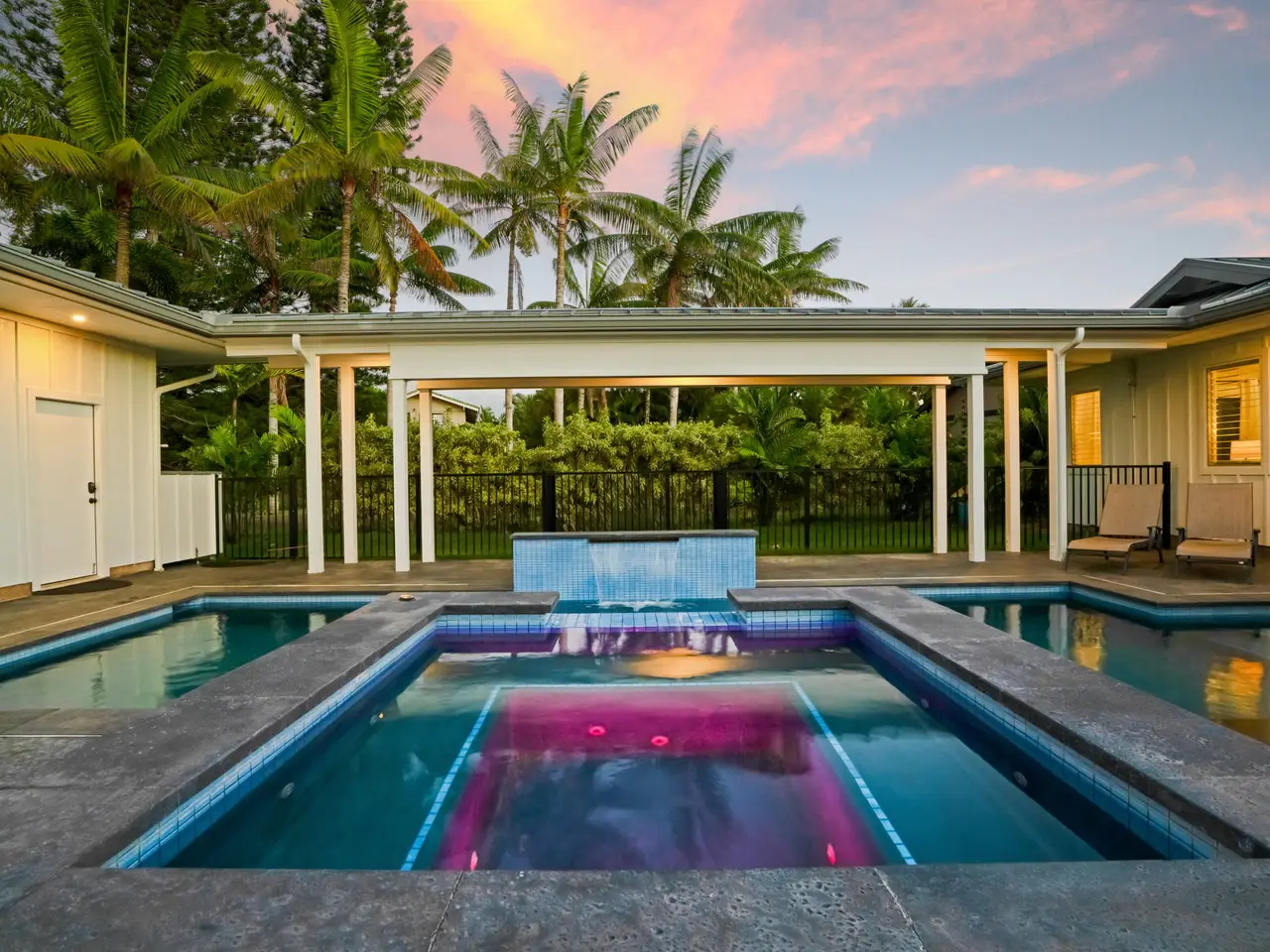 Perfectly positioned on the Princeville Golf Course with breathtaking ocean, sunset, and mountain views, this vacation rental retreat known as "Tradewinds" offers the ultimate North Shore lifestyle. From the moment you arrive, you’ll be captivated by the private courtyard anchored by a stunning swimming pool with a swim-up bar, built-in spa, kids’ pool and cascading waterfall. An expansive poolside entertainment area that sets the stage for wonderful gatherings. The home incorporates approximately 2,500 square feet of living area, centered around seamless indoor-outdoor living. Two sliding glass walls, totaling 30 feet, open into the poolside lanai, blurring the line between home and paradise. The great room with vaulted fir ceilings incorporates ample seating, a massive 86-inch TV, and a gourmet kitchen appointed with Wolf, and Bosch appliances and a striking blue glass island countertop. Polished floors and elegant tones of white, grey, and blue create a fresh, modern island aesthetic. Designed for both privacy and connection, the home’s H-shaped layout places each of the four main bedrooms on a corner. With three-sided ventilation and the natural cooling of the trade winds, the home enjoys constant breezes—though individually controlled A/C units are also available in each room. Each of the four main bathrooms is luxuriously appointed with rain showers and soaker tubs, while the two primary suites feature private lava rock garden showers. A unique surfboard-mounted outdoor shower adds a playful island touch by the pool. Every bedroom opens to a covered lanai, and two expansive great-room lanais on opposite sides of the home provide the perfect balance of sun and shade throughout the day. The home totals four king bedrooms, plus a fifth sleeping area with sofa bed, desk, and full bath. This resort-style sanctuary with its stunning setting and panoramic views embodies the very best of Princeville living.