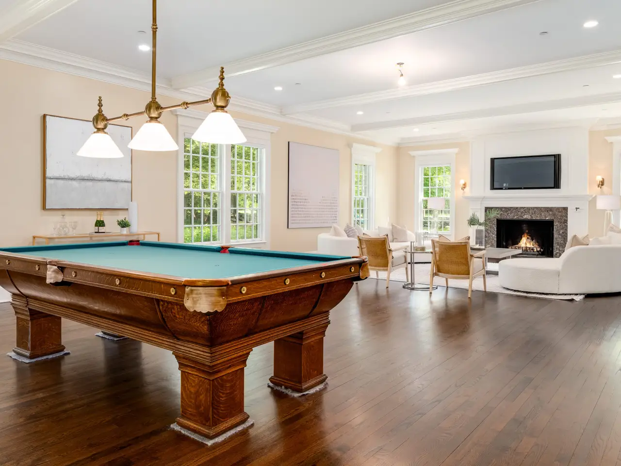 Privately nestled behind gates on 2.89 lush acres, this classically updated 8-bedroom, 8.3-bath New England Colonial offers unmatched elegance, space, and serenity. With a picturesque natural pond in front and sweeping golf course views in back, this estate is a rare and refined offering. From the moment you arrive, the charm is undeniable - from the stately approach to the beautifully maintained grounds. Inside, the first floor features a formal living or greeting room, a richly paneled library with bespoke millwork, a private office with custom built-ins, and a spectacular great room/game room perfect for large-scale entertaining or intimate gatherings. The formal dining room is graciously sized for hosting and filled with natural light. At the heart of the home is the dream kitchen: Christopher Peacock cabinetry, an oversized island, two Sub-Zero refrigerators, two Bosch dishwashers, and seamless flow into the adjacent family room with fireplace and French doors leading to the expansive covered patio. Upstairs, discover four ensuite bedrooms, two additional bedrooms with a Jack-and-Jill bath, and a luxurious primary suite with a fireplace, private terrace, spa-like bathroom, custom dressing room, walk-in closet, and an additional full bath. The finished lower level is designed for recreation and relaxation, featuring a full home theater, gym, guest suite, game room, TV lounge, and abundant storage all beautifully finished and thoughtfully arranged. Outdoors, enjoy resort-style living with a sparkling pool and spa, perfectly manicured lawns, mature perennial gardens, and a full pool house with kitchenette, full bath, and laundry. This estate is a rare blend of timeless design, modern luxury, and extraordinary setting a true one-of-a-kind offering.