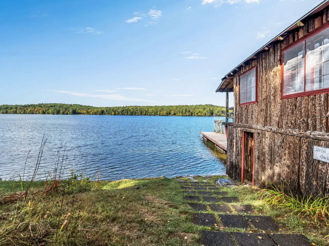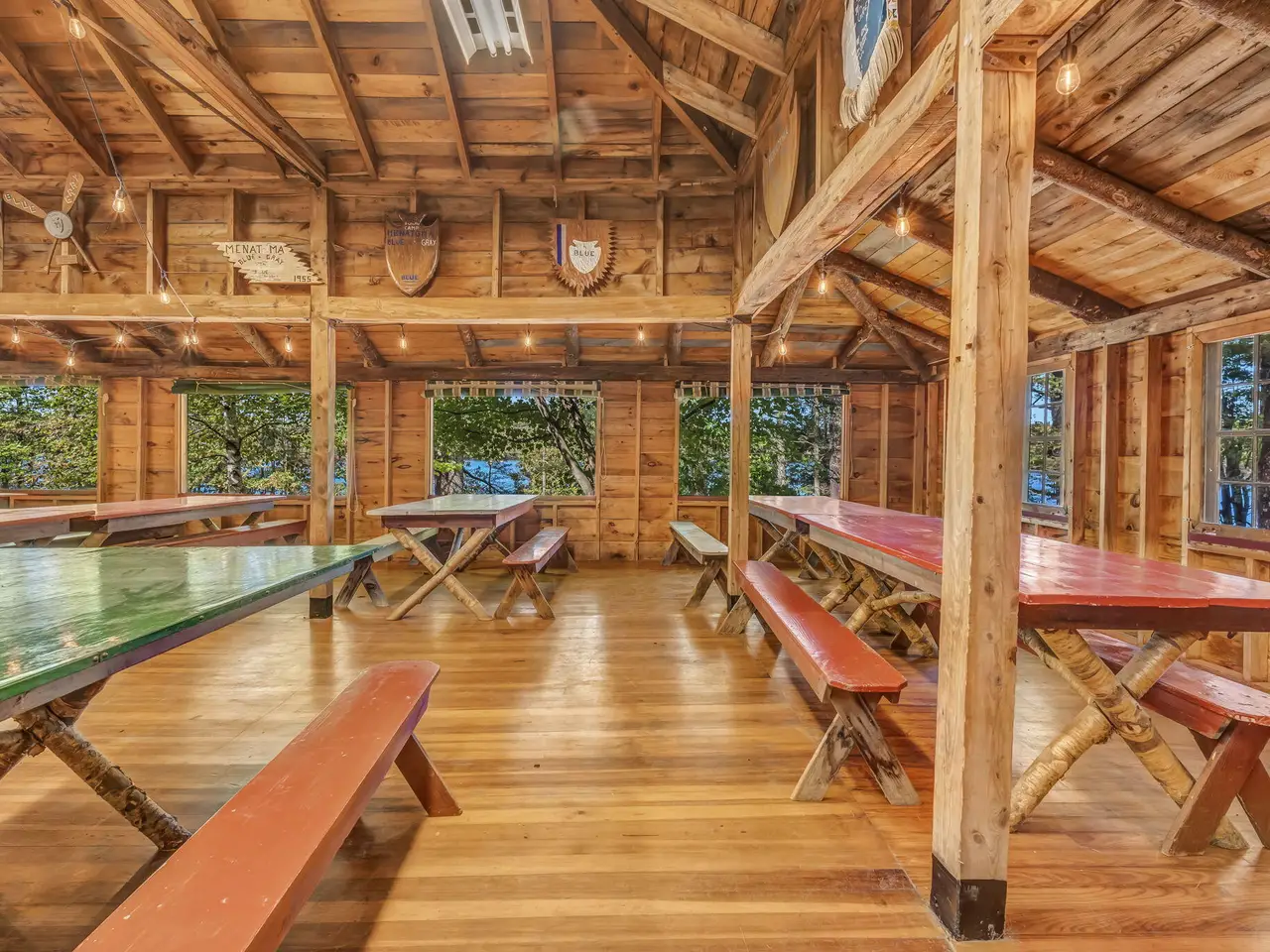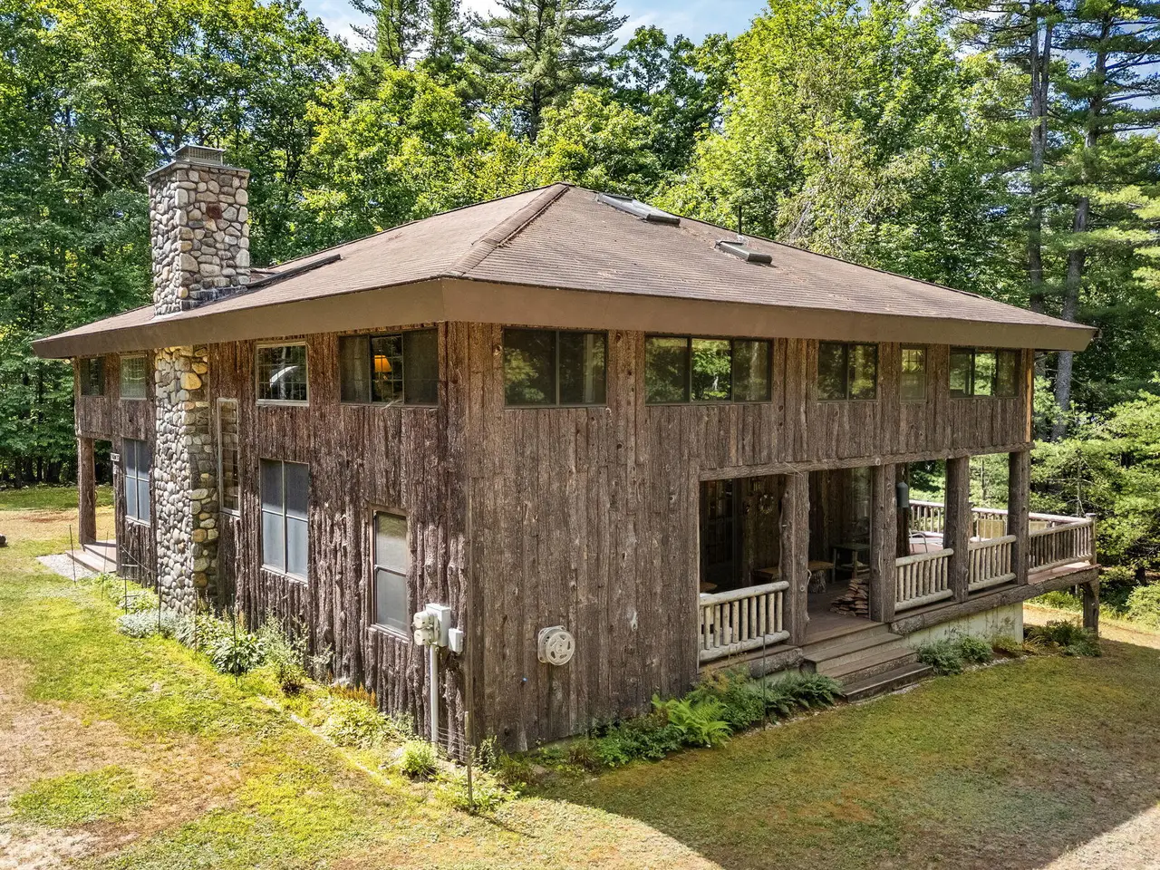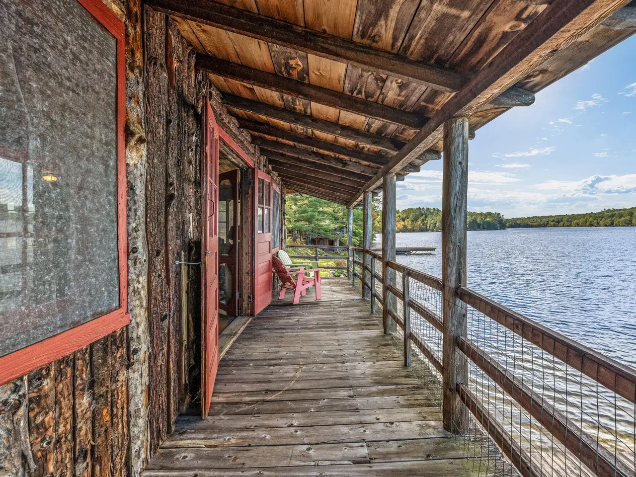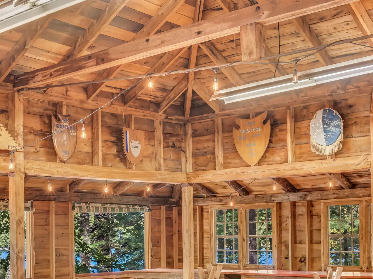LOVEJOY POND Magnificent custom built Maine lodge architecturally designed to provide that classic, rustic feel with all the modern day amenities & system! Originally the Menatoma Camp ''Lodge'' sadly destroyed in a fire, this 2001 structure was built to encompass everything it means to be in nature at the lake with loved ones! The central living room is a wonderful place to gather around the gorgeous natural stone fireplace that reaches to a lofty ceiling with grand staircases on each side. Open game room & two dedicated dining areas adjacent to a fully equipped kitchen is ideal for entertaining large groups. Office/den & laundry room with half bath complete the main level, while 4 spacious bedrooms, two full baths, 2 walk-in linen closets & a nice sitting area complete the second level. Outside is a covered porch, 2 open decks & a wonderful screen porch allowing you to enjoy the outdoors while listening to the loons. The property is made up of 2 separate lots with 400' of beautiful lakefront with a gently sloping, pebble bottom swim area & private dock which can be accessed by a park-like walking path through the woods, or your own private road. While surrounded by woodlands on 3.74 acres, the rest of the association's amenities next door can easily be accessed by footpath or road. Dues include access to over 36 acres, 770' of shared lakefront with a sandy beach, protected swimming area with float, 2 large permanent docks, swim float & diving platform, Dining Hall, Laundry Building, Craft Shop, Tennis/Basketball/Pickleball Courts, Baseball Field, dumpster, grounds & tree service. Lovejoy is a beautiful lake with no public boat ramp, no invasive aquatic plants & excellent sport fishing with breeding pairs of loons that raise chicks on the lake each year! Lodge is fully insulated, has an 18 panel solar array supporting all needs, private septic system & access high speed internet if desired. Welcome to a comfortable, easy life at the lake with room for all!