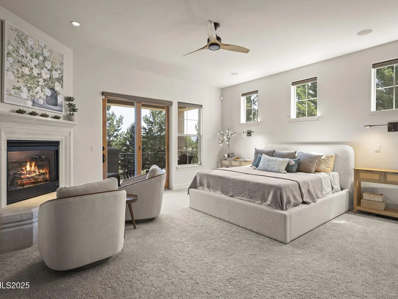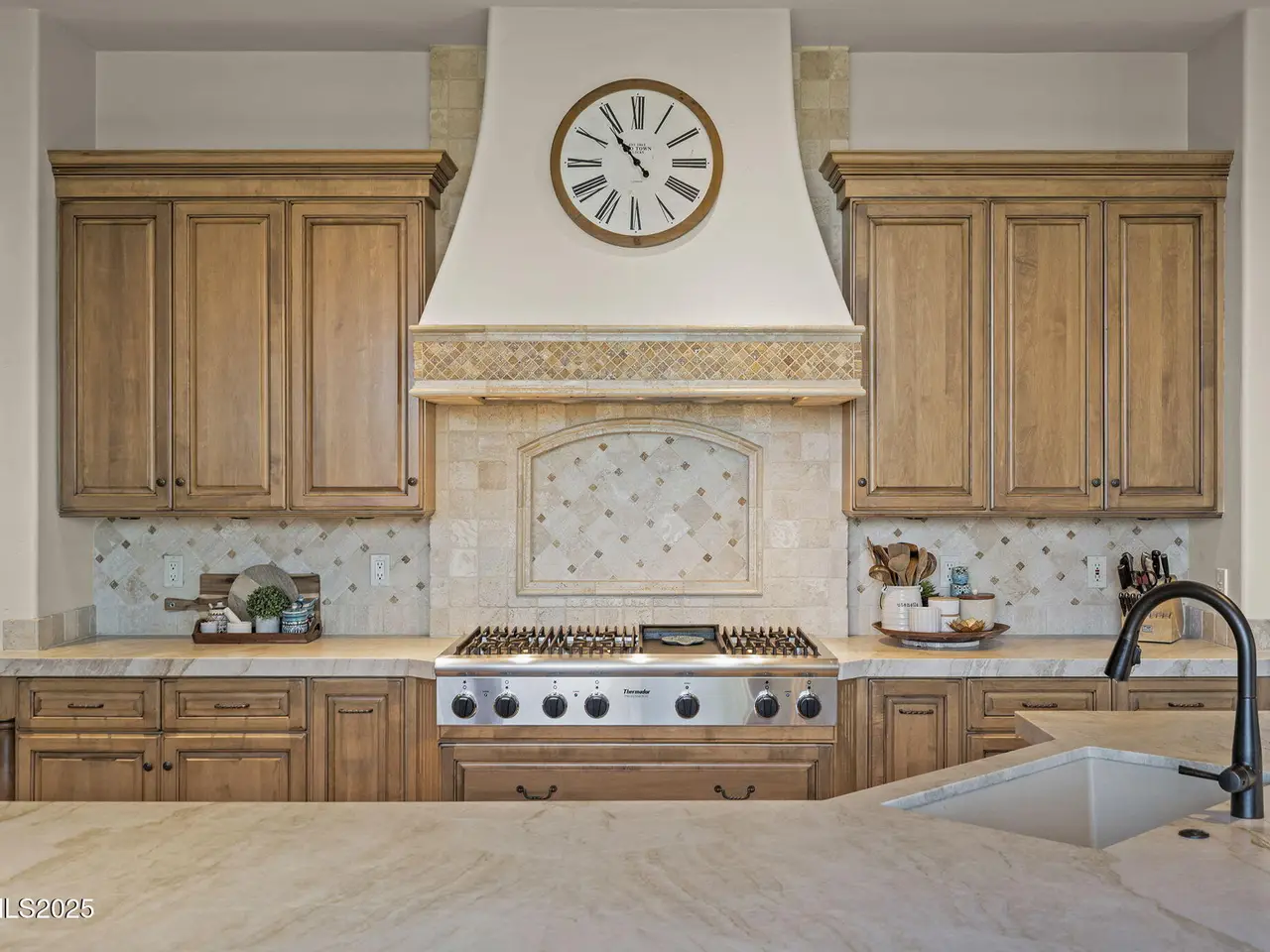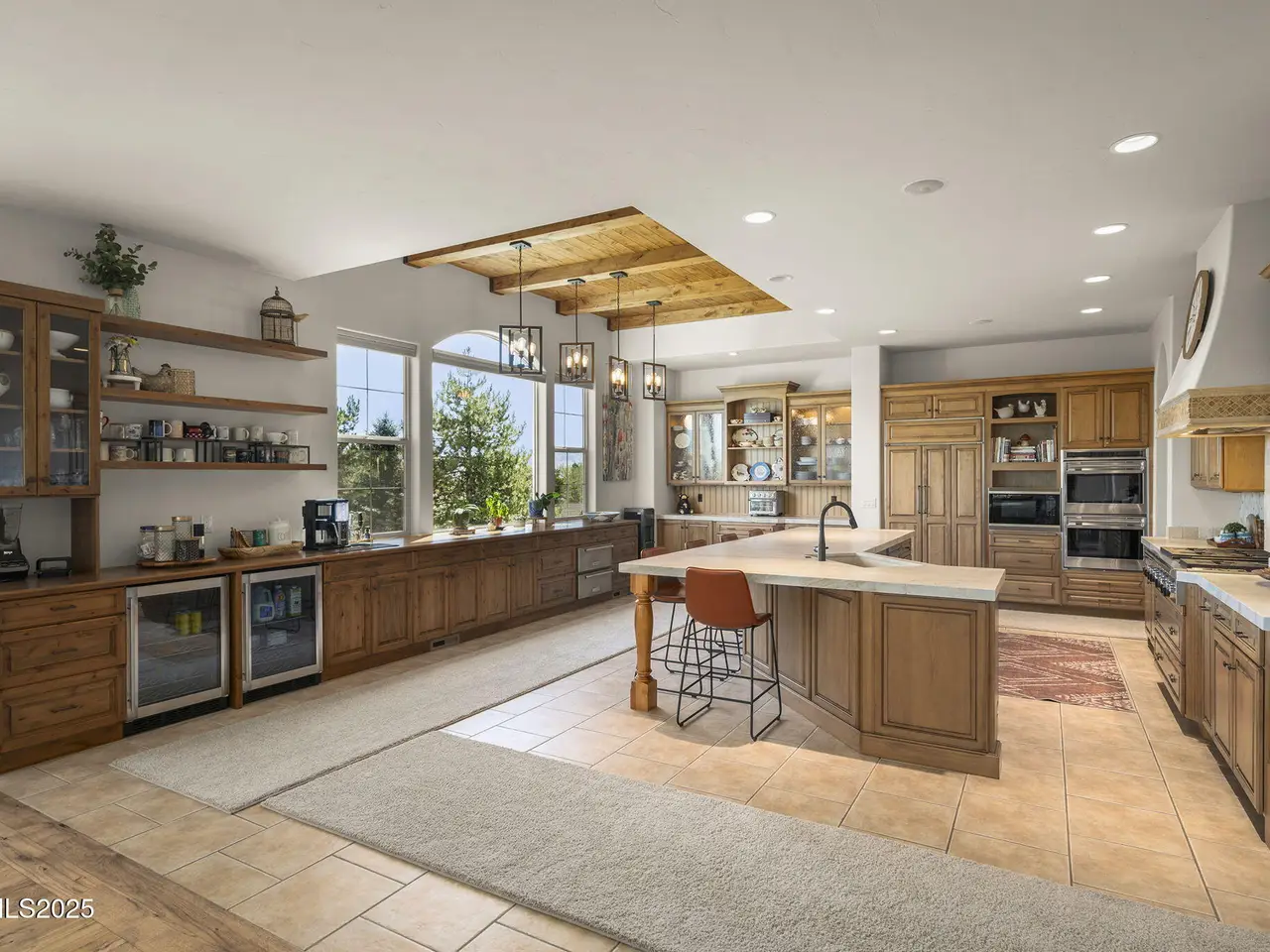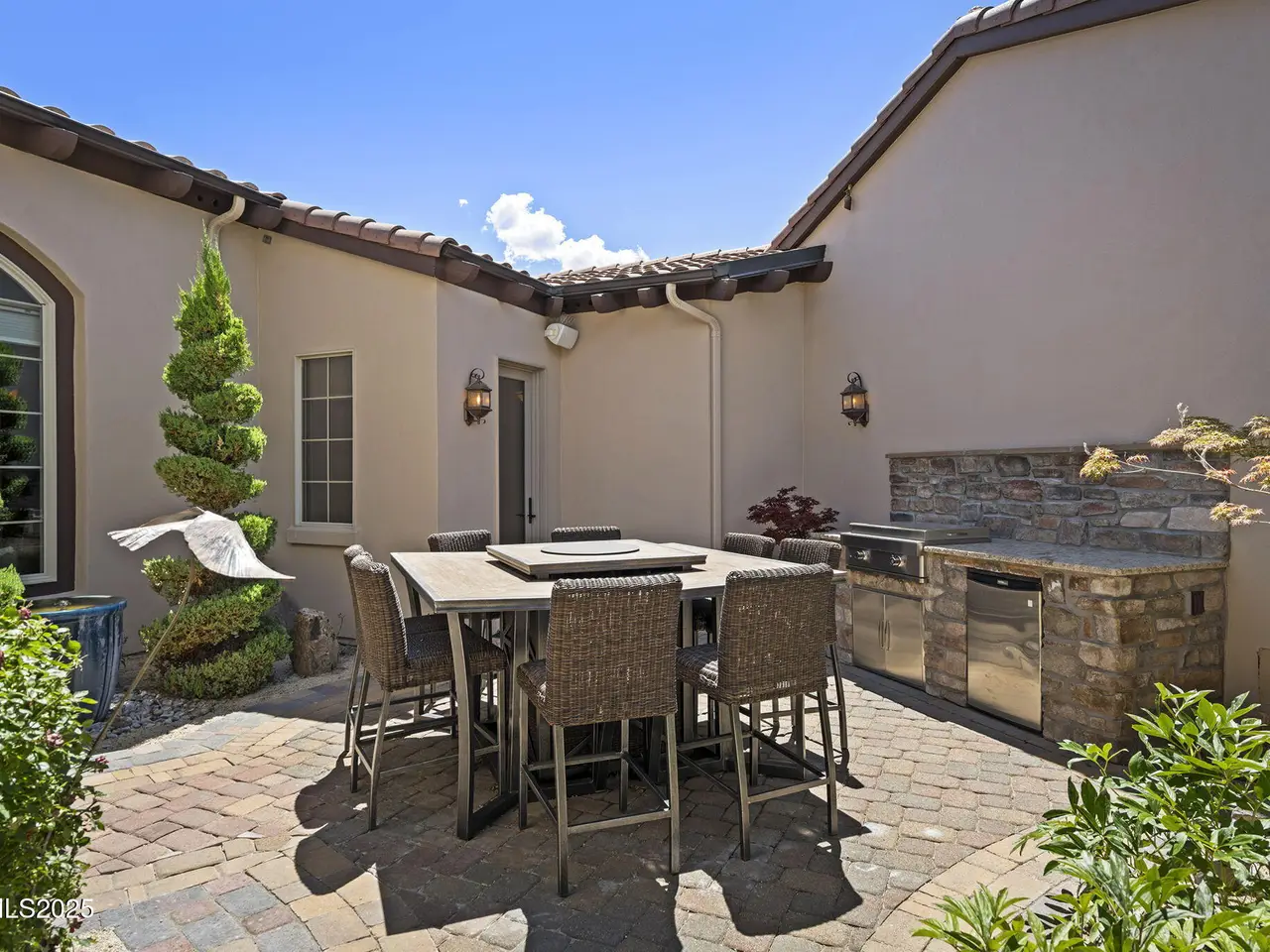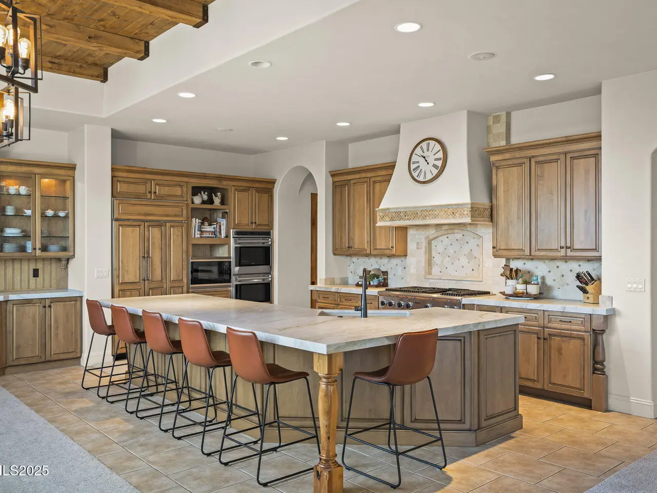 Welcome to this stunning luxury estate property, located in the prestigious Saddlehorn community. Nestled on a serene cul-de-sac, this exquisite 5 bedroom, 5 1/2 bath residence has undergone a multitude of designer renovations, offering the finest in upscale living. The chef's kitchen is a true showpiece—featuring leathered Taj Mahal quartzite countertops, two built-in refrigerators, dual Bosch dishwashers, warming drawers, added custom soft-close cabinetry, and three spacious pantries. Expanded custom built-ins elevate both functionality and elegance, making this kitchen a culinary dream. Relax and unwind in the spa-inspired primary suite on the main level which includes a steam shower, gas fireplace, custom lighting, and sophisticated tilework. Downstairs you will find a spacious in-law suite including its own kitchenette with l Leather Taj Mahal quartzite counter, new sink, dishwasher, and beverage fridge- plus a versatile bonus space perfect for a game room, home theater, or additional living quarters creating the ultimate entertaining space, and two additional private bedrooms with ensuites. Additional interior highlights include a double-sided gas fireplace between the living and great rooms, a custom bunk room with exposed beam detail, a private man cave, updated designer lighting, and extensive electrical upgrades throughout. Step outside to enjoy the resort-style grounds—complete with an expanded paver patio, grand fountain, raised vegetable gardens, privacy hedging, and a swim spa with new pump & cover, custom decking for easy maintenance access. A built-in outdoor BBQ with griddle enhances alfresco living. Premium appliances include two washers, two dryers, five beverage refrigerators, and so much more. This turnkey luxury retreat combines timeless elegance with modern comfort in one of Reno's most sought-after neighborhoods. See newly remodeled upgrade list in documents for additional information.