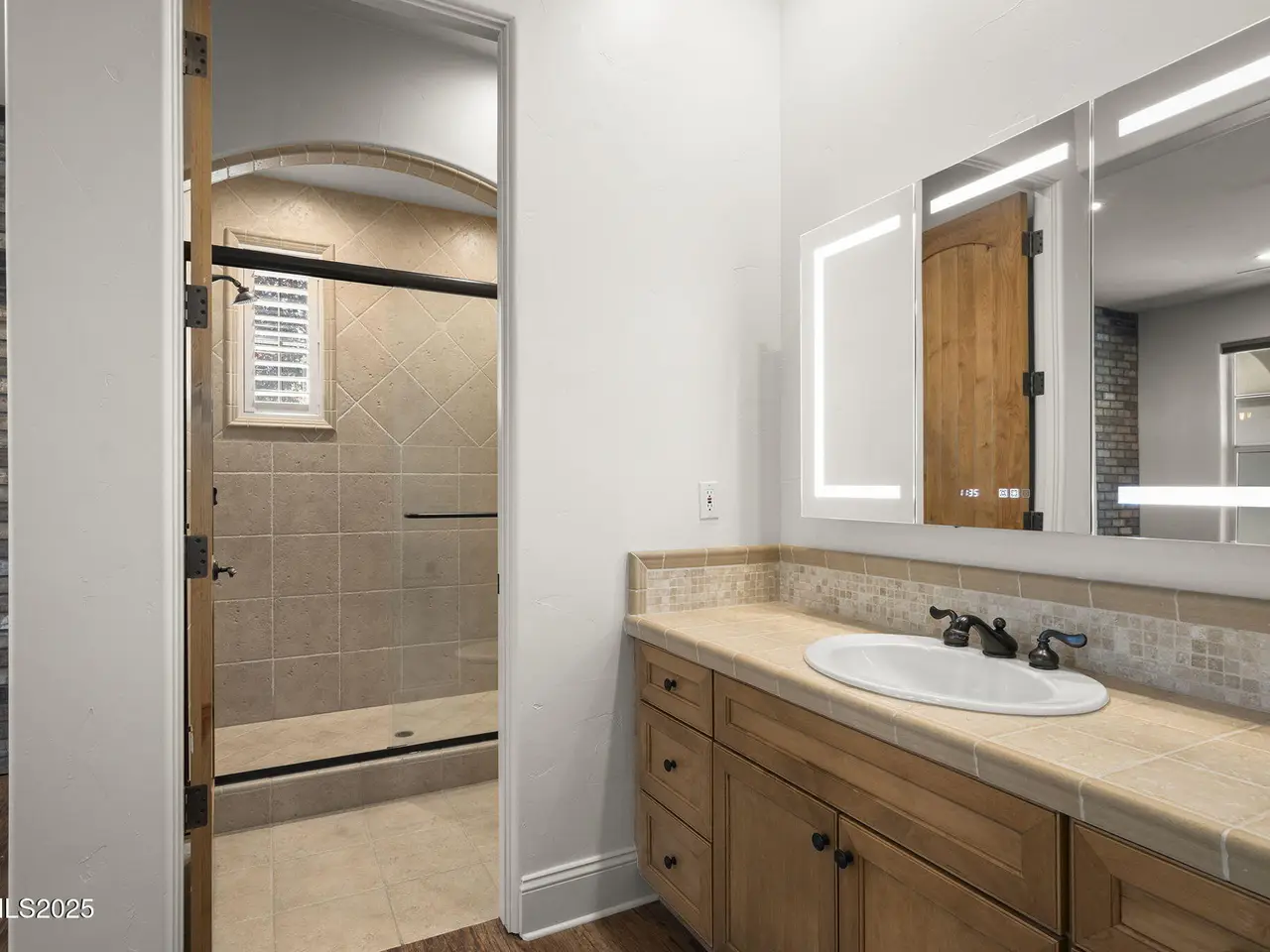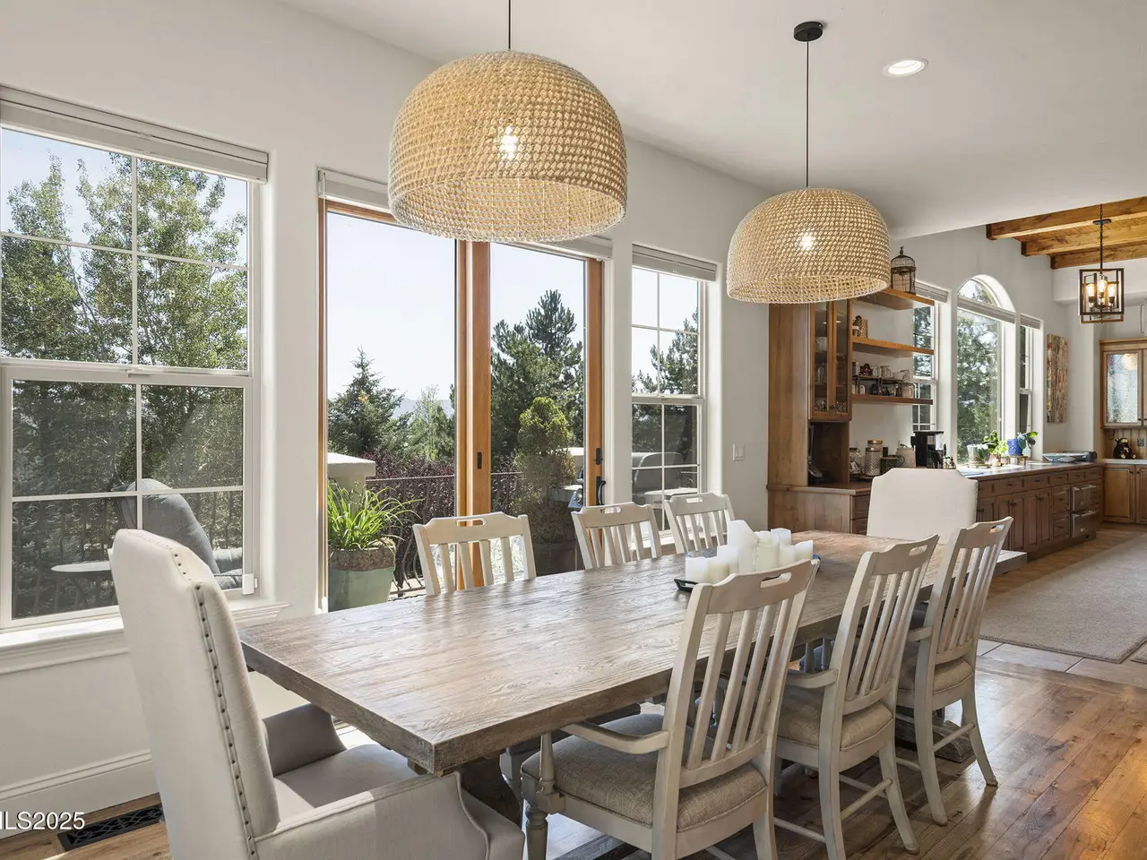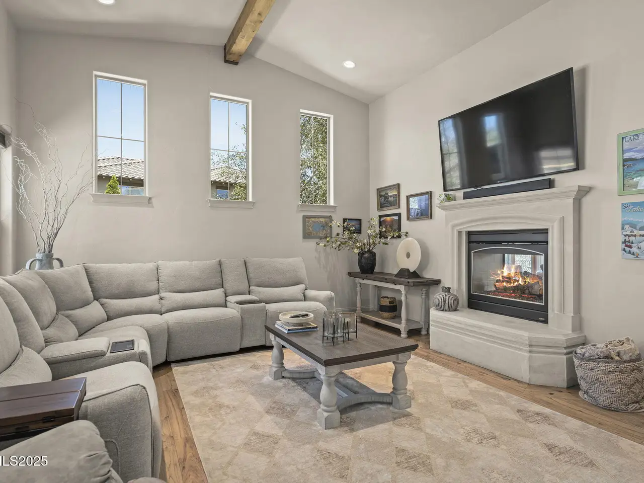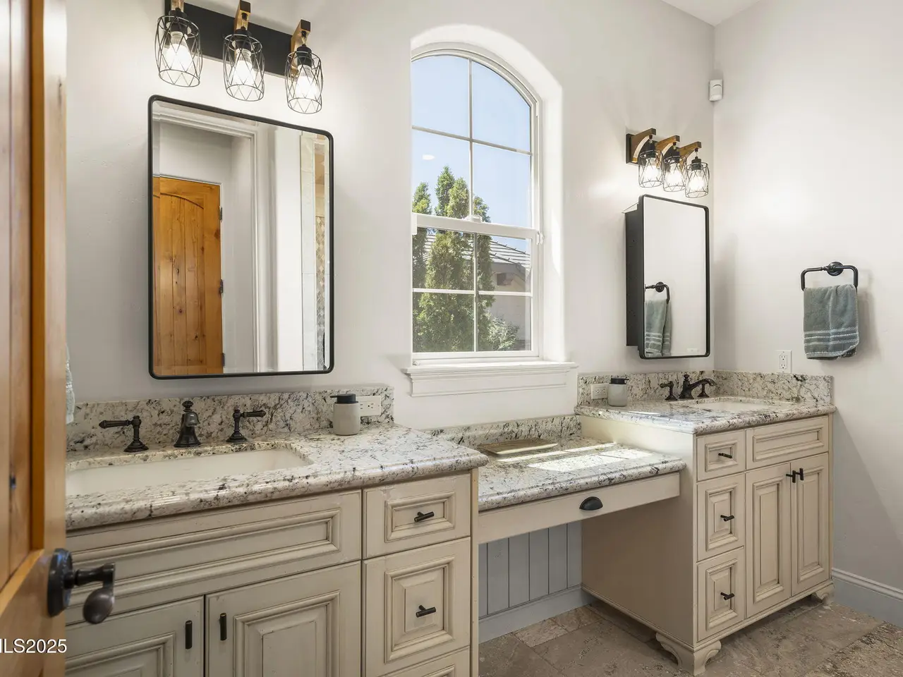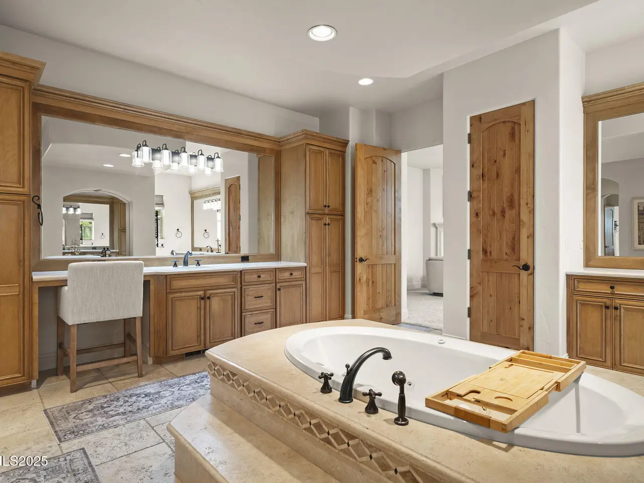 Welcome to this stunning luxury estate property, located in the prestigious Saddlehorn community. Nestled on a serene cul-de-sac, this exquisite 5 bedroom, 5 1/2 bath residence has undergone a multitude of designer renovations, offering the finest in upscale living. The chef's kitchen is a true showpiece—featuring leathered Taj Mahal quartzite countertops, two built-in refrigerators, dual Bosch dishwashers, warming drawers, added custom soft-close cabinetry, and three spacious pantries. Expanded custom built-ins elevate both functionality and elegance, making this kitchen a culinary dream. Relax and unwind in the spa-inspired primary suite on the main level which includes a steam shower, gas fireplace, custom lighting, and sophisticated tilework. Downstairs you will find a spacious in-law suite including its own kitchenette with l Leather Taj Mahal quartzite counter, new sink, dishwasher, and beverage fridge- plus a versatile bonus space perfect for a game room, home theater, or additional living quarters creating the ultimate entertaining space, and two additional private bedrooms with ensuites. Additional interior highlights include a double-sided gas fireplace between the living and great rooms, a custom bunk room with exposed beam detail, a private man cave, updated designer lighting, and extensive electrical upgrades throughout. Step outside to enjoy the resort-style grounds—complete with an expanded paver patio, grand fountain, raised vegetable gardens, privacy hedging, and a swim spa with new pump & cover, custom decking for easy maintenance access. A built-in outdoor BBQ with griddle enhances alfresco living. Premium appliances include two washers, two dryers, five beverage refrigerators, and so much more. This turnkey luxury retreat combines timeless elegance with modern comfort in one of Reno's most sought-after neighborhoods. See newly remodeled upgrade list in documents for additional information.