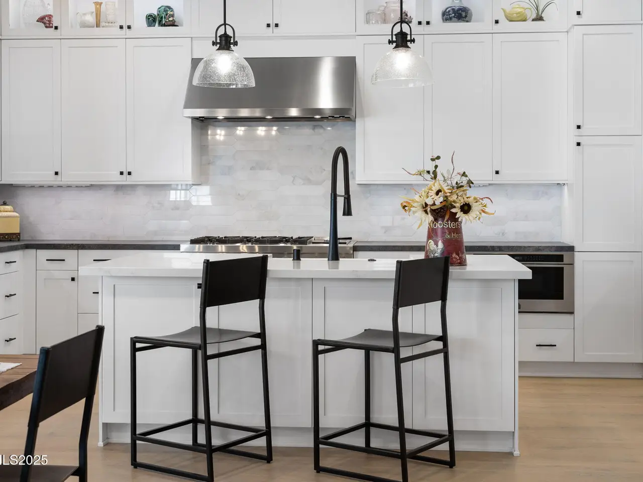 Single-level living behind the private gates of Rancharrah. This true lock-and-leave modern farmhouse combines luxury, comfort, and convenience with timeless design details including custom beam ceilings, shiplap, and an abundance of natural light. The thoughtfully designed floorplan offers a spacious primary ensuite, a secondary ensuite, and a private office with gorgeous custom built-ins. The heart of the home features a chef's kitchen with quartz countertops, craftsman-style cabinetry with rollout drawers and black hardware accents, JennAir stainless steel appliances, and farmhouse porcelain sink at kitchen island. The dining area is a focal point with a show-stopping chandelier and flows right into the great room anchored by a dramatic floor-to-ceiling stone fireplace, perfect for cozy evenings. European oak flooring flows seamlessly throughout the main living areas. Outdoor living is equally impressive with a covered patio, built-in barbecue, firepit, low-maintenance landscaping, and a tranquil water feature. Living in Rancharrah, Northern Nevada's most luxurious development, means enjoying incomparable amenities. The reimagined Club at Rancharrah is just a short walk away and offers resort-style living with a pool, outdoor cantina with poolside service, private dining at Nineteen 57, a three-level fitness center, group classes, kids' clubs, summer camps, family movie nights, seasonal events, and even a full-service spa and salon. Outdoor recreation includes pickleball and bocce courts, while private meeting and event spaces add to the exclusivity. Beyond the gates, enjoy easy access to the Village at Rancharrah with fine dining, shops, and wellness services. The location also places you minutes from Bartley Ranch's trails and amphitheater, Reno-Tahoe International Airport, Midtown, and Downtown Reno. Mt. Rose Ski Resort is just 18 minutes away, with Lake Tahoe only 40 minutes from your door. This home is a perfect balance of refined interiors, effortless lifestyle, and unmatched amenities in one of Reno's most prestigious communities.