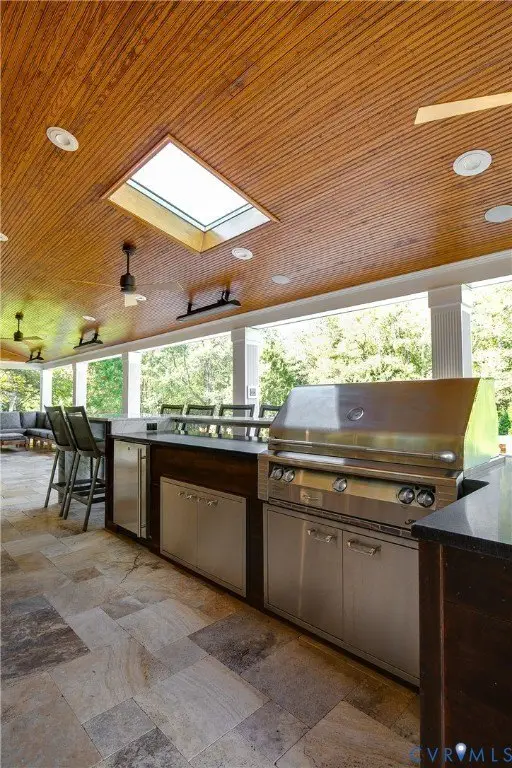Welcome to this stately brick Colonial set on over 5 acres of professionally landscaped, private grounds in the gated community of Pembroke Farms. Enjoy exclusive neighborhood access to a wide, navigable stretch of the James River conveniently located on the River Road Corridor. Spanning three finished levels, this home offers 5 bedrooms, numerous formal and informal living spaces and multiple flex rooms that could serve a variety of purposes. The thoughtfully designed interior includes a first floor with 10 ft ceilings, a formal living and dining room, an office, a sitting room enveloped by windows, and a large family room that seamlessly opens to the renovated gourmet kitchen with quartz countertops, marble backsplash, custom cabinetry, and top-tier appliances. A butler's pantry/drop zone connects to the attached garage for everyday convenience. Upstairs, the primary suite is a private retreat with a spa-inspired en suite bath, a dressing room, and a custom walk-in closet. Three spacious bedrooms complete the second floor, each with walk-in closets, and two featuring en suite baths. The lower level has a rec room with projector, a kitchenette with bar style seating, and a wine cellar-perfect for entertaining. Additionally, there is another kitchenette, one bedroom and full bath, two flex rooms as well as ample storage closets. This exceptional home offers an 8-bay garage, 4 bays attached and 4 bays detached. The detached 4 bay garage includes car lifts and over 900 sq. ft. of unfinished space-already roughed in for a bath-ideal for a future guest suite or studio. The outdoor living space is equally impressive with a multi-tiered travertine terrace, complete with a grilling station, space heaters, and a striking stone fireplace, all overlooking serene, manicured grounds. A rare offering of craftsmanship, privacy, and luxury in one of Richmond's most sought-after riverfront enclaves.