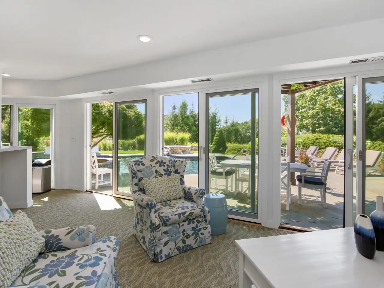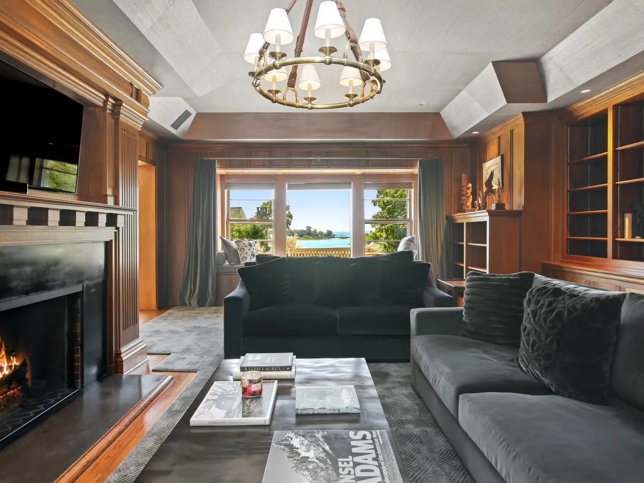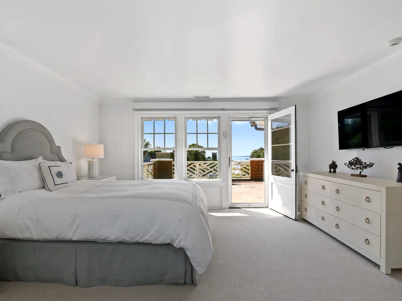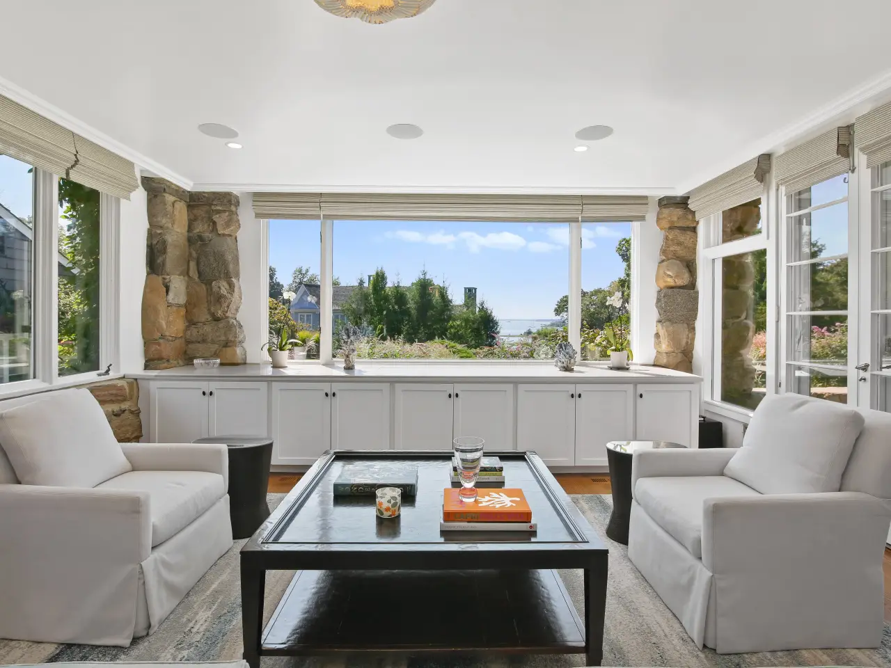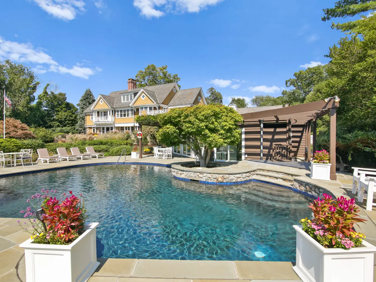 Overlooking Long Island Sound and the NYC skyline, this extraordinary Riverside estate sits on 1.35 acres at the end of a quiet, tree-lined cul-de-sac. Offering breathtaking, unobstructed water views from nearly every room, the three-story Colonial home blends timeless coastal charm with modern luxury. Completely renovated in 2022 and thoughtfully updated over the years, the main house features a sun-drenched interior designed by Gregory McGuire, with elegant architectural details. A grand foyer with intricate woodwork and living room share a double sided fireplace; office with built-ins and French doors to terrace overlooking the Sound. The gourmet kitchen flows seamlessly into the family room and outdoor seating area, perfect for both entertaining and everyday living. Spacious primary suite offers a private balcony, dual walk-in closets, a dressing room, and a spa bath. The top floor features a bright studio or gym space with potential for an additional bath. Elevator provides easy access across three levels. The professionally landscaped grounds feature a resort-style pool with waterfall and spa, outdoor kitchen, vegetable garden, horseshoe court, flagpole, and multiple terraces for enjoying the views. Separate pool house complete with family room, kitchen, bedroom, office, full bath, and a second laundry. Only two families have ever owned this remarkable home, with deeded water access and luxurious amenities in a prime Riverside location. Main house is 5,842 sqft. Cottage is 735 sqft.