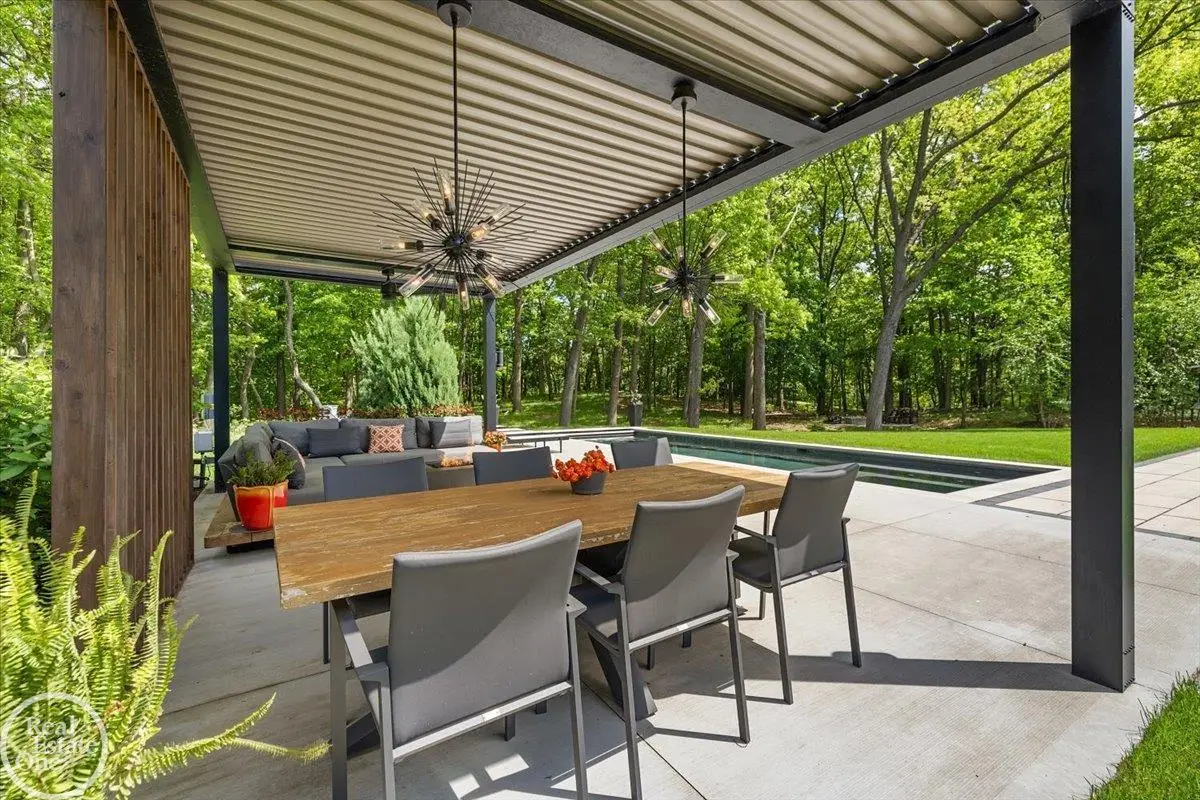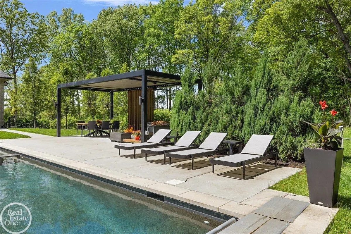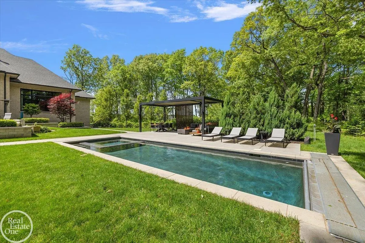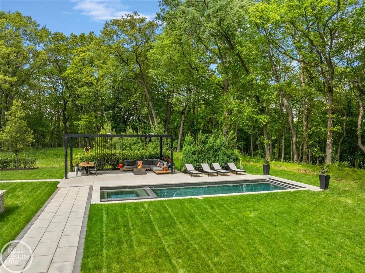 Experience unparalleled modern luxury in this custom-built 2021 Cranbrook masterpiece. Featured in Detroit Design Magazine, this home showcases exquisite interior design by Tutto Interiors, boasting the finest materials and craftsmanship throughout. Situated on 3 private wooded acres, this residence offers a serene escape with an urban edge. The open floor plan, highlighted by soaring 14-foot ceilings and expansive walls of windows, floods the home with natural light and breathtaking views. The gourmet kitchen, equipped with Thermador appliances, is an entertainer's dream. Relax in the stunning great room with its floating fireplace or unwind in the four-seasons glass room, featuring an industrial loft aesthetic and a natural fireplace. The primary suite offers a spa-like experience with a luxurious bath, steam shower, and dual walk-in closets, all overlooking the tranquil wooded landscape. The finished walk-out lower level leads to a 35x12 inground pool, complete with a custom pergola and firepit, perfect for outdoor gatherings.