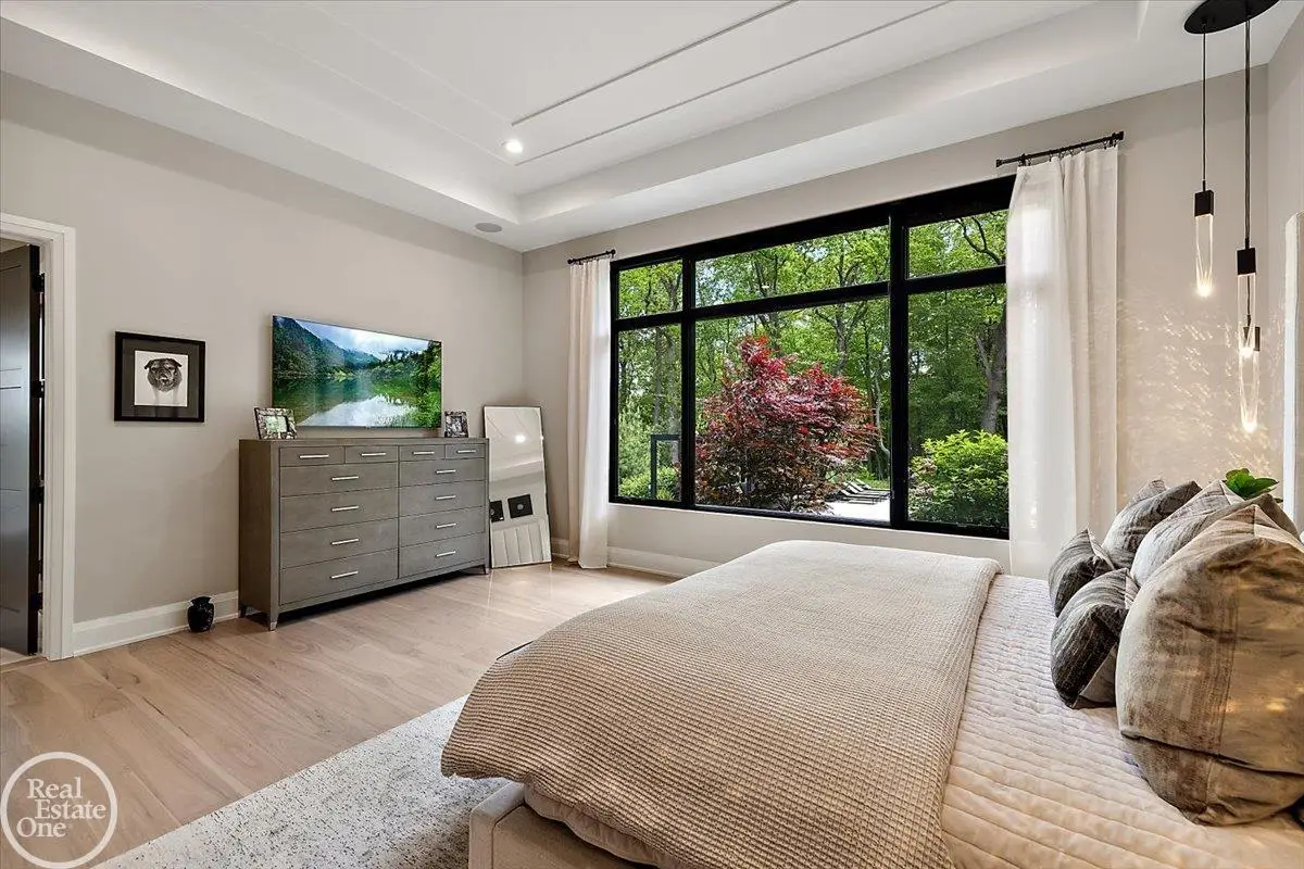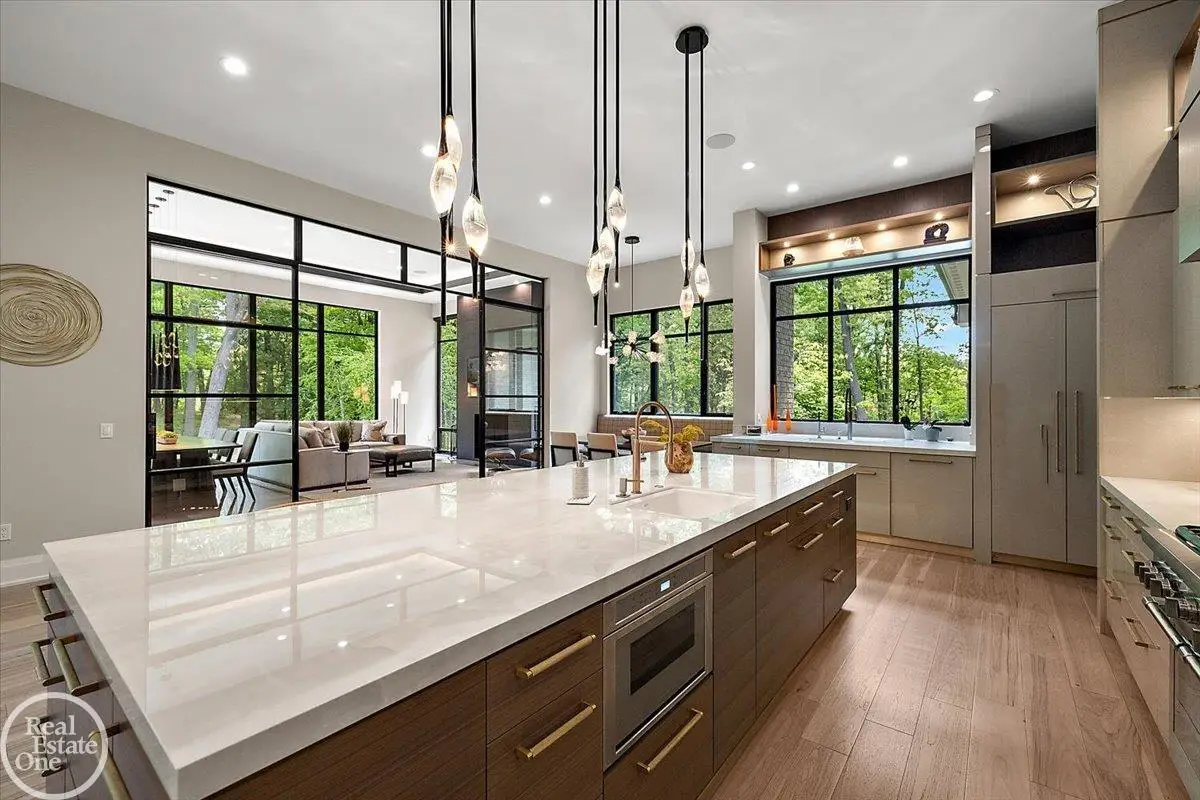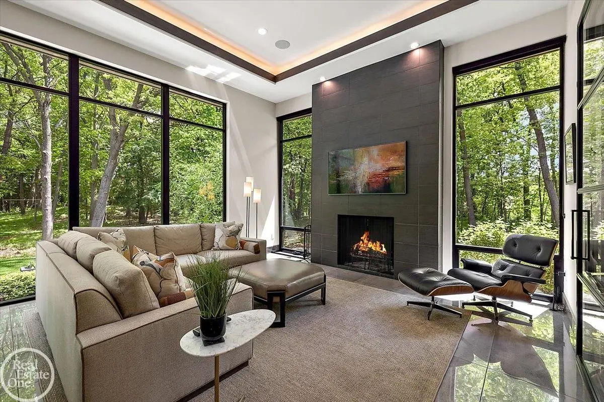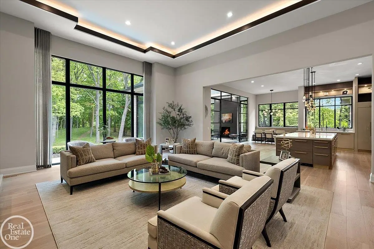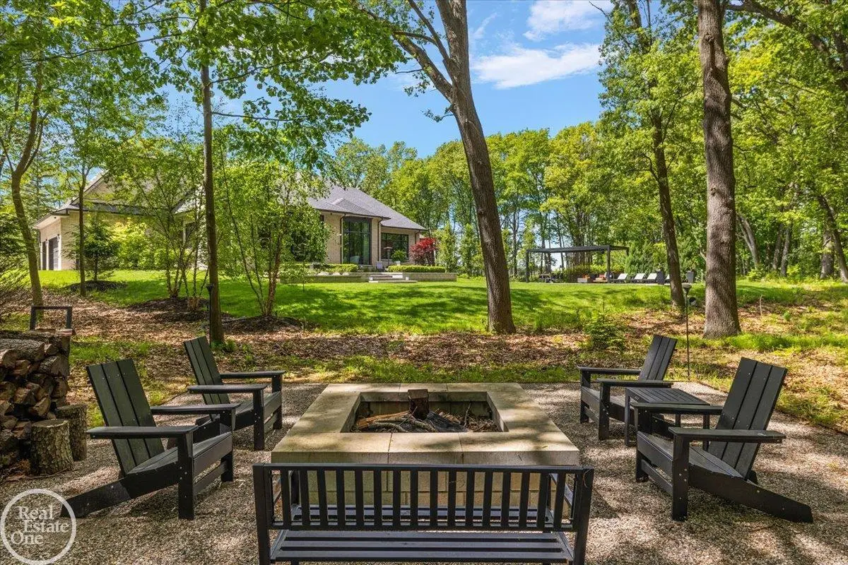 Experience unparalleled modern luxury in this custom-built 2021 Cranbrook masterpiece. Featured in Detroit Design Magazine, this home showcases exquisite interior design by Tutto Interiors, boasting the finest materials and craftsmanship throughout. Situated on 3 private wooded acres, this residence offers a serene escape with an urban edge. The open floor plan, highlighted by soaring 14-foot ceilings and expansive walls of windows, floods the home with natural light and breathtaking views. The gourmet kitchen, equipped with Thermador appliances, is an entertainer's dream. Relax in the stunning great room with its floating fireplace or unwind in the four-seasons glass room, featuring an industrial loft aesthetic and a natural fireplace. The primary suite offers a spa-like experience with a luxurious bath, steam shower, and dual walk-in closets, all overlooking the tranquil wooded landscape. The finished walk-out lower level leads to a 35x12 inground pool, complete with a custom pergola and firepit, perfect for outdoor gatherings.