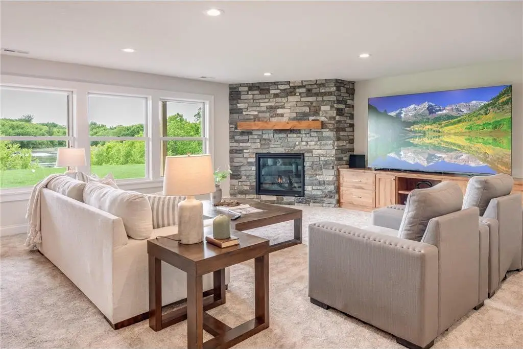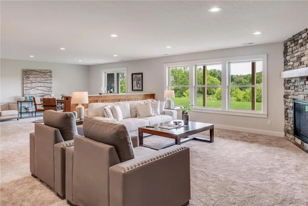 This breathtaking new construction home is perfectly positioned on a sprawling 6-acre lot on the border of Dayton & Rogers! This stunning rambler offers a thoughtfully designed open layout that exudes both comfort and elegance and is loaded with features throughout. From the beautiful white oak flooring to the tiled bathrooms showcasing gorgeous accent walls, this home is meant to impress everyone that sees it. The heart of the home is the dream kitchen, complete with an oversized walk-in pantry, a massive center island and naturally stained white oak cabinets. It is the ideal space for entertaining and daily living alike. The luxurious owner's suite includes stone-tiled flooring, a spa-like ensuite, and private access to a massive 40 x 12 covered porch—perfect for enjoying the serene pond water views year-round. The oversized family room in the lower level is a true showstopper, featuring a wet bar that makes it an entertainer’s paradise. With its blend of modern amenities and timeless style, this home is your opportunity to experience unparalleled craftsmanship in a peaceful, picturesque setting.