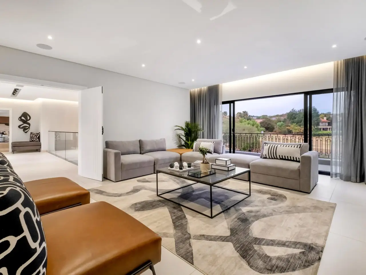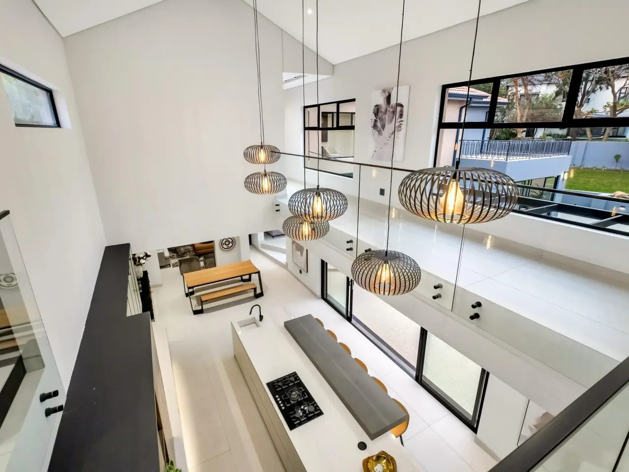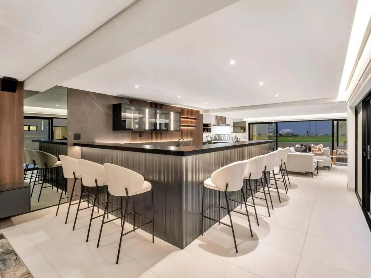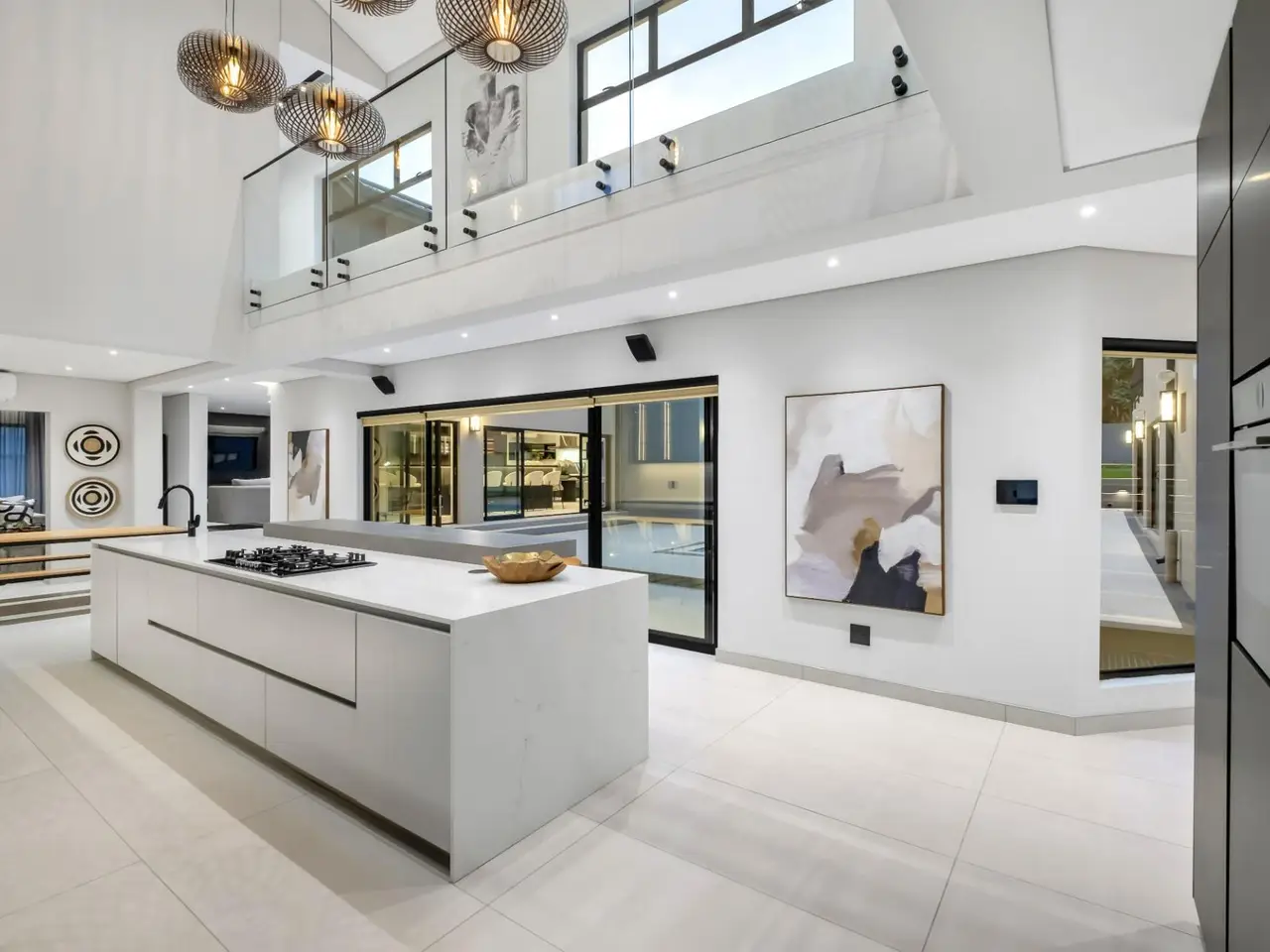 This magnificent residence is a true masterpiece - a symphony of whites, blacks, and greys that come together in perfect harmony. Recently completed with a brand-new renovation and crafted under the vision of a professional interior designer, the home is a flawless blend of contemporary elegance and timeless sophistication. All kitchen appliances and TV are included, with the option to purchase the bespoke furniture and d+¬cor for a complete, move-in-ready lifestyle. From the very first impression, this home captivates. Its striking fa+ºade and meticulous attention to detail create unmatched street appeal, while the elevated open-stand position ensures uninterrupted, breath-taking views of the golf course, clubhouse, and rolling surrounds. With abundant off-road parking for up to six vehicles, plus two expansive double garages accommodating a further four cars, practicality meets prestige at every turn. Ground Floor: Open-Plan Luxury The entrance opens into a soaring double-volume space, instantly enveloping you in light and openness. At the heart of the home lies the gourmet double-volume kitchen GÇô a chefGÇÖs dream with sleek finishes, an enormous pantry, and a fully fitted scullery. The breakfast nook and intimate formal lounge extend seamlessly from this central hub, offering serene views of the courtyard garden and the expansive pool. The open-plan entertainment wing epitomises effortless indoor-outdoor living, featuring two inviting lounges, a grand dining space, and a magnificent pub. Integrated design ensures flow and connection, while a built-in braai and dual guest cloakrooms complete this impressive area. A separate downstairs wing houses the fourth en-suite bedroom with dressing room, enjoying private garden access GÇô ideal for guests or extended family. Upstairs: A Retreat of Pure Indulgence A striking floating lightwood staircase, beautifully underlit at night, leads to the upper level. Here, three magnificent bedroom suites are complemented by an expansive enclosed pyjama lounge with sweeping estate views and an airy study area. The main suite is nothing short of spectacular GÇô oversized, opulent, and crafted to the highest standard. It boasts a designer dressing room and a five-star en-suite bathroom, where luxury and serenity merge. The two additional en-suite bedrooms, each with its own dressing room, provide comfort and privacy for family or guests. Outdoors & Features Set on one of the largest stands within the estate, the property offers landscaped gardens with a full irrigation system. The oversized pool becomes a central feature, framed by the homeGÇÖs entertainment areas. Additional highlights include: - En-suite staff accommodation - 16 kW solar and inverter system for sustainable living - Seamless balance of openness, privacy, and spectacular views This is more than a home GÇô it is a lifestyle statement, designed for the discerning buyer who values exclusivity, sophistication, and effortless comfort.