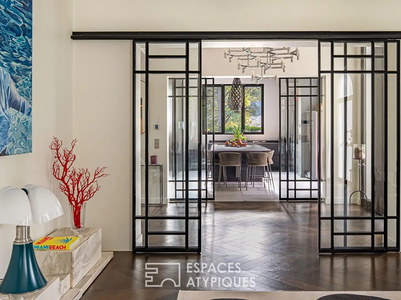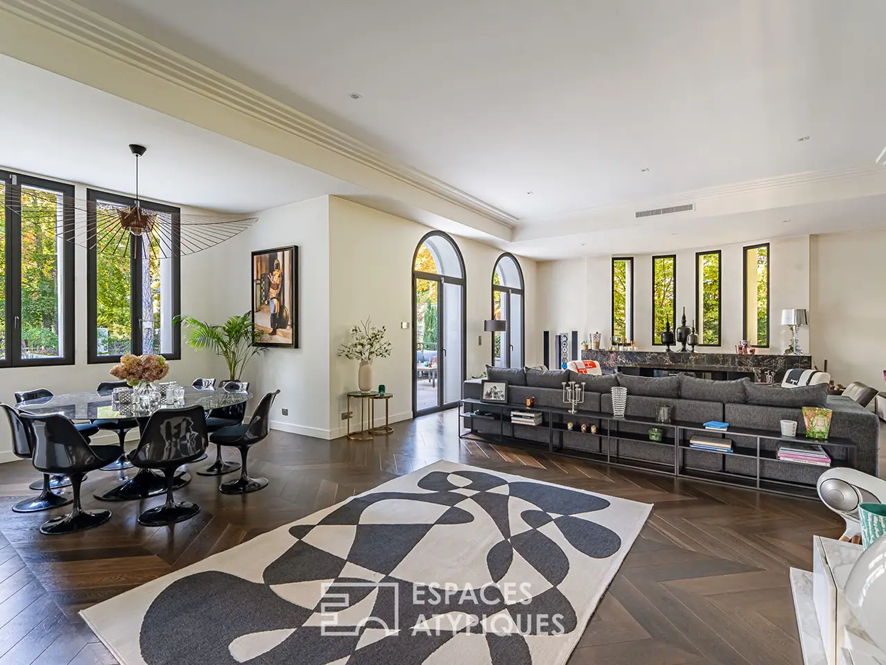 Just minutes from the center of Rueil-Malmaison, nestled in the highly sought-after Hameau de la Jonchere, a private and secure estate bordered by the Saint-Cucufa forest, this exceptional residence offers a rare living experience: that of a contemporary home where refinement blends with the serenity of nature. Behind its discreet gate, the house reveals itself in a refined and contemporary architecture, bathed in light. Its immaculate facades, highlighted by modern lines and generous openings, blend with a verdant garden punctuated by palm trees and mature species. An elegant paved driveway guides the eye to a majestic entrance, while an intimate terrace invites relaxation. The harmony between the building and nature creates an atmosphere of tranquility and rare refinement. Inside, the volumes unfold gracefully. The 80 sqm reception area opens onto large bay windows that let in light and the surrounding nature. The marble fireplace is its vibrant heart, bringing family and friends together in a warm atmosphere. A high-end contemporary 33 sqm kitchen, designed as a living space, where aesthetics and functionality blend in an open, elegant, and welcoming space, while the chosen materials-dekton, wood, and sculptural pendant lights demonstrate the attention to detail and quality of the finishes. A utility room has been designed to combine practicality and discretion. A laundry room, cloakroom, and guest toilet complete this level. Upstairs, the master suite opens onto a private terrace, a custom-made dressing room, and a refined bathroom with a walk-in shower. Two other bedrooms, each with their own shower room or bathroom, one of which has a terrace, make up this intimate level. The garden level, designed for well-being and conviviality, houses a gym, a cinema room, a wellness area with sauna and hammam, a swimming pool with counter-current swimming whose large bay windows open entirely onto the garden to form a single space. An independent apartment of 35 sqm, perfect for receiving or accommodating guests, completes these services. A unique place, where contemporary comfort dialogues with nature, designed for those seeking beauty, calm and fluidity of life. in the immediate vicinity of major roads and the best international schools. Access A86, A13: 3 min EIB de la Jonchere: 5 min walk, Danielou, Passy Buzenval, Lycee International de Saint-Germain-en-Laye. REF. 13376 Additional information * 9 rooms * 5 bedrooms * 2 bathrooms * 3 shower rooms * 1 floor in the building * Outdoor space : 3047 SQM * Parking : 3 parking spaces * Property tax : 5 500 € Energy Performance Certificate Primary energy consumption b : 103 kWh/m2.year High performance housing
