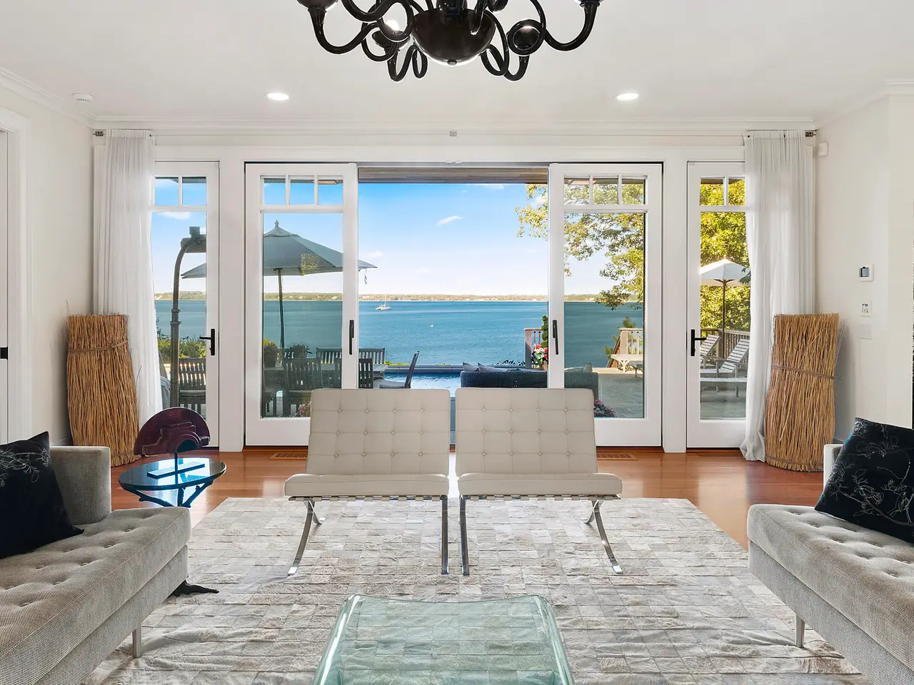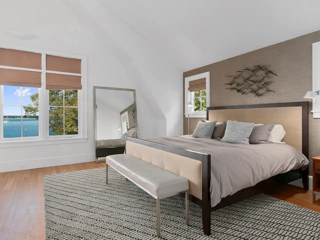 Tastefully decorated in a comfortable modern style by a team of international designers, this gorgeous 9,000 sq.ft. 6-bedroom, 7.5 bath home, sits on 1 secluded acre with 153' of water frontage and includes direct access to a semi-private beach on Noyac Bay. With breathtaking views of the bay from almost every room, this home has it all. Views of the water are visible from the kitchen, dining area, living room, family room, den and second floor sitting area, as well as both primary bedrooms. The open, state-of-the-art kitchen has 2 dishwashers, 2 sinks and everything a chef might need. Other highlights include four fireplaces, hardwood floors throughout, high-speed internet via a robust mesh network, Sonos music system throughout, CAC, and a gym/office accessible from both the house and a private entrance. The second floor holds 4 ensuite bedrooms, two King with water views and two Queen which share a small terrace. One of the queen beds can be replaced with two twins upon request. All four second bedrooms surround a large sitting area which has a terrace overlooking the water. The lower level has two bedrooms and a large, shared bathroom, as well as a media area with a large flat screen TV and a 200+ bottle wine refrigerator. Also located on the lower level is a game room with a convertible pool/ping pong/air hockey table. The lower level also has direct access to the pool and backyard. The outdoor area has a large patio for entertaining, a plumbed gas grill and a heated pool and spa. A wide stairway leads down to the water. To top it off, both Cromer's and Long Beach are just a short distance from the home.
